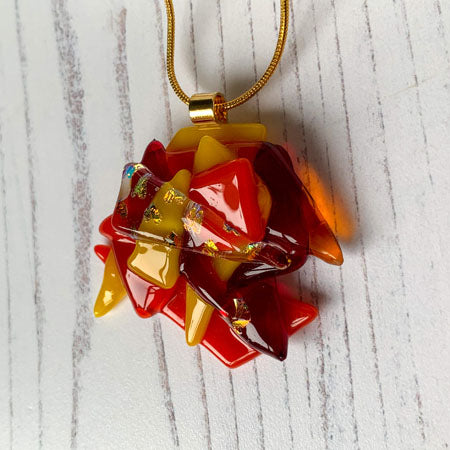 I made this necklace with autumn reds, orange and yellow. It has little copper/gold hearts in dichroic glass for a bit of sparkle.