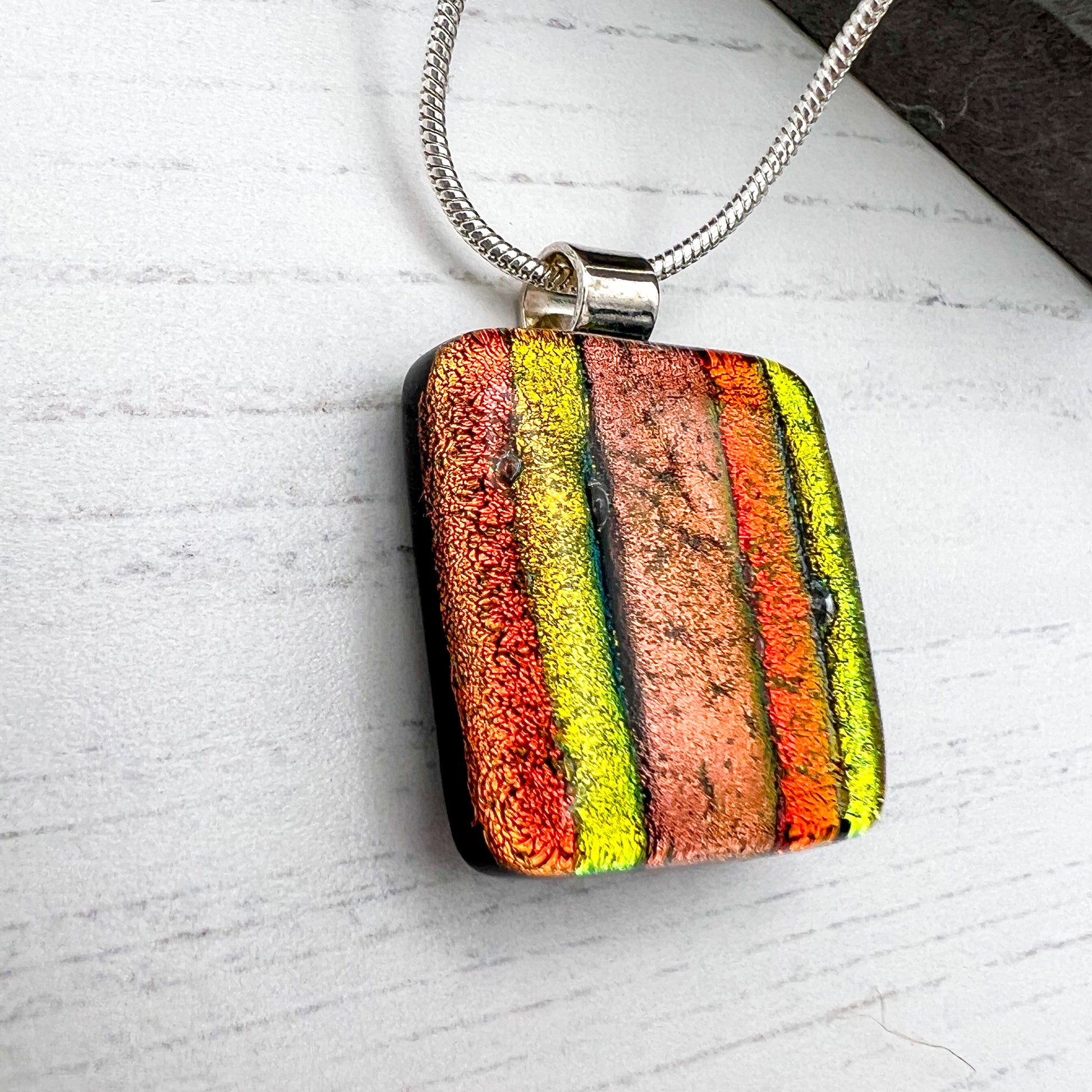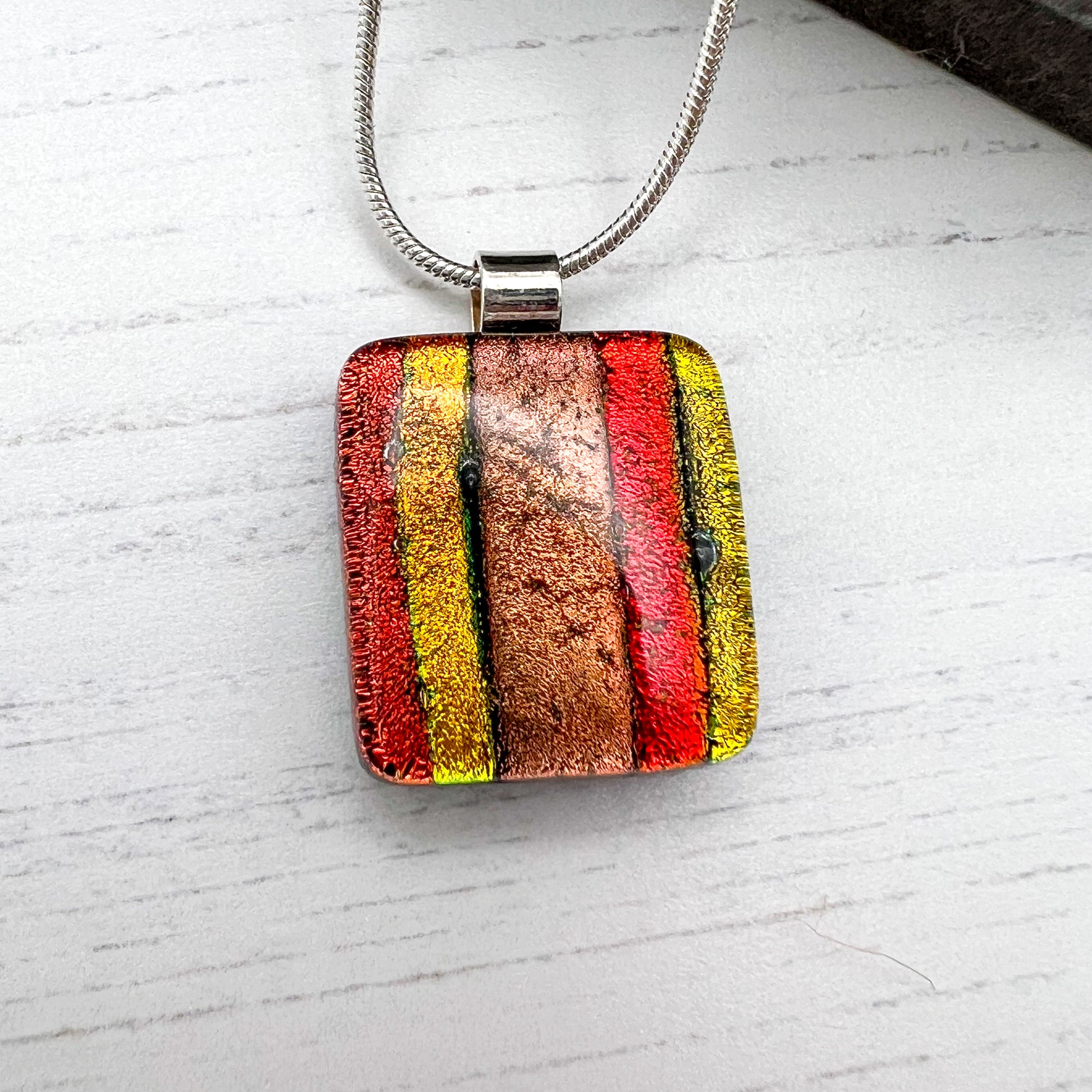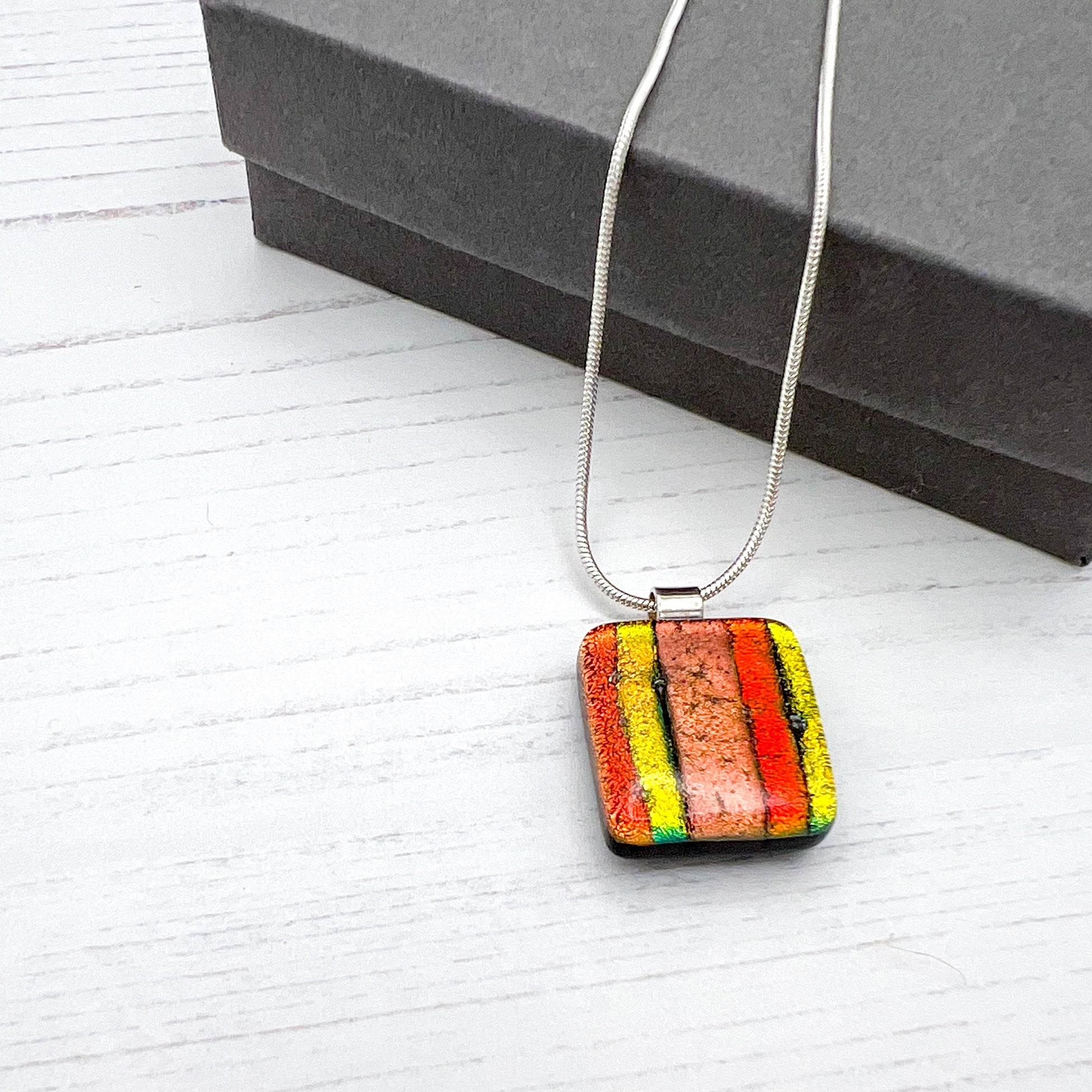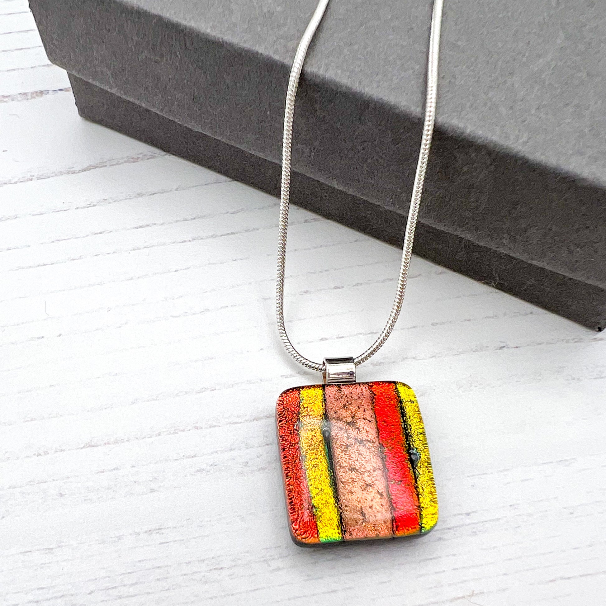 This autumn stripes glass necklace is a handmade necklace with splashes of colour and simple classic lines.
