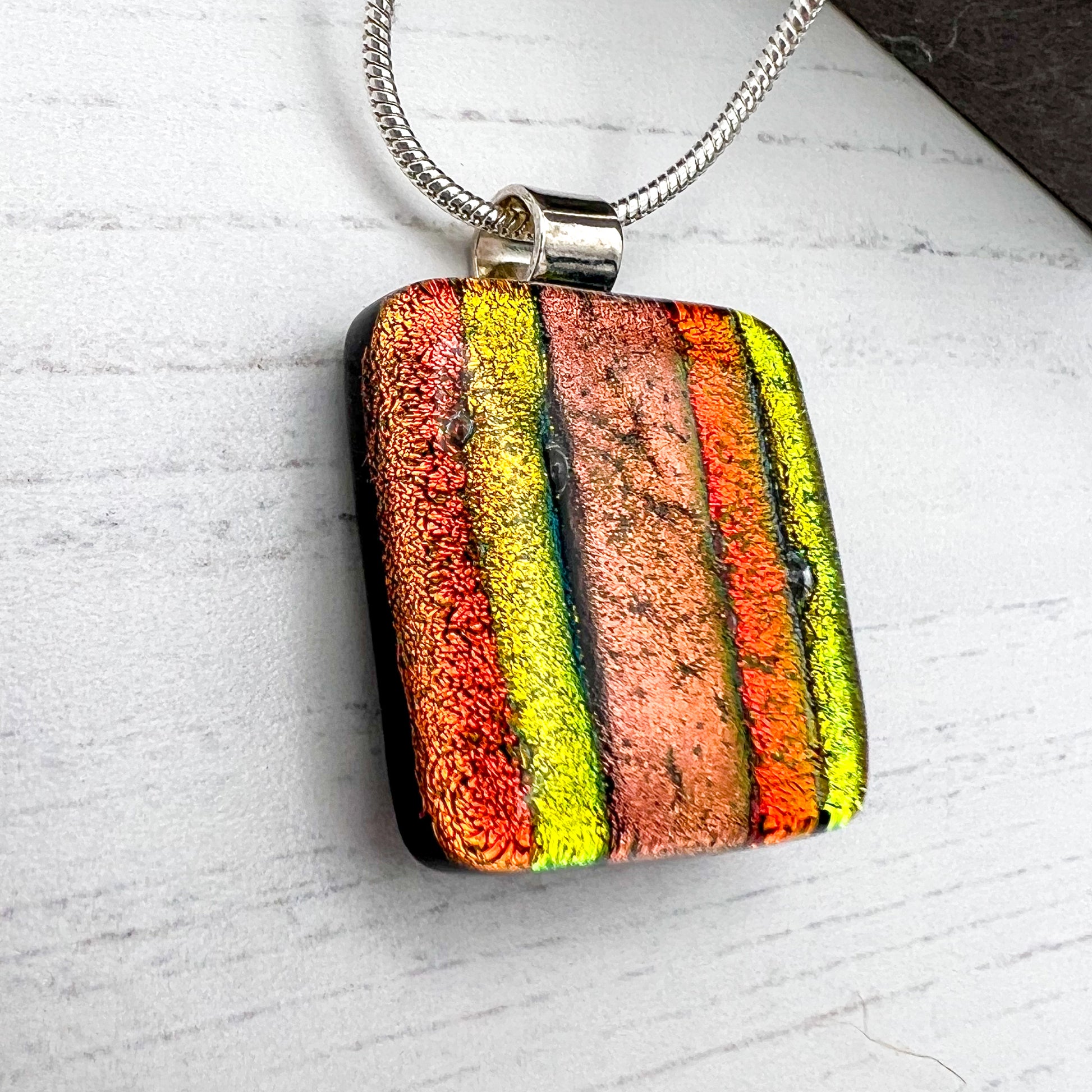 I made this necklace with an opaque black base and I layered autumn dichroic glass over the top.