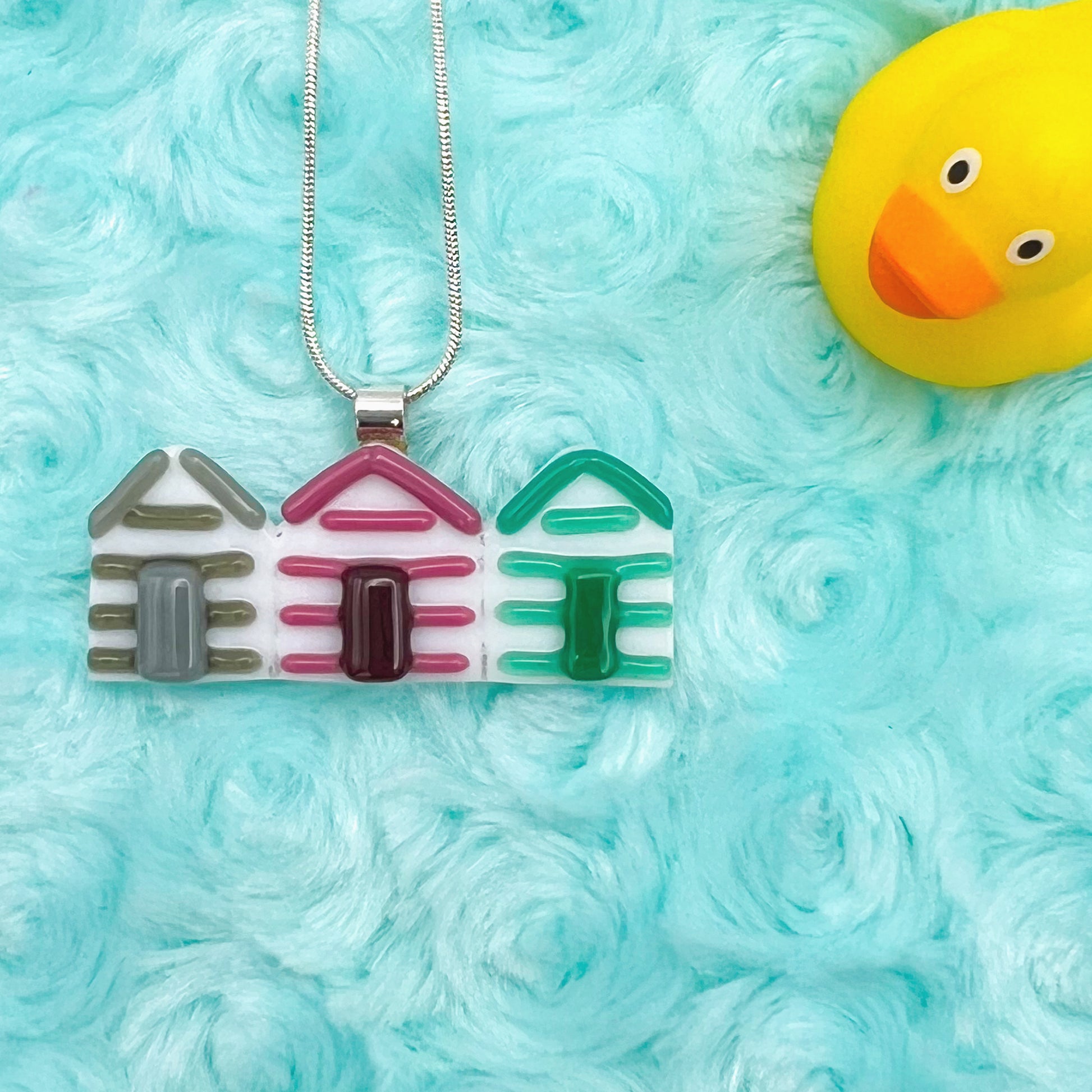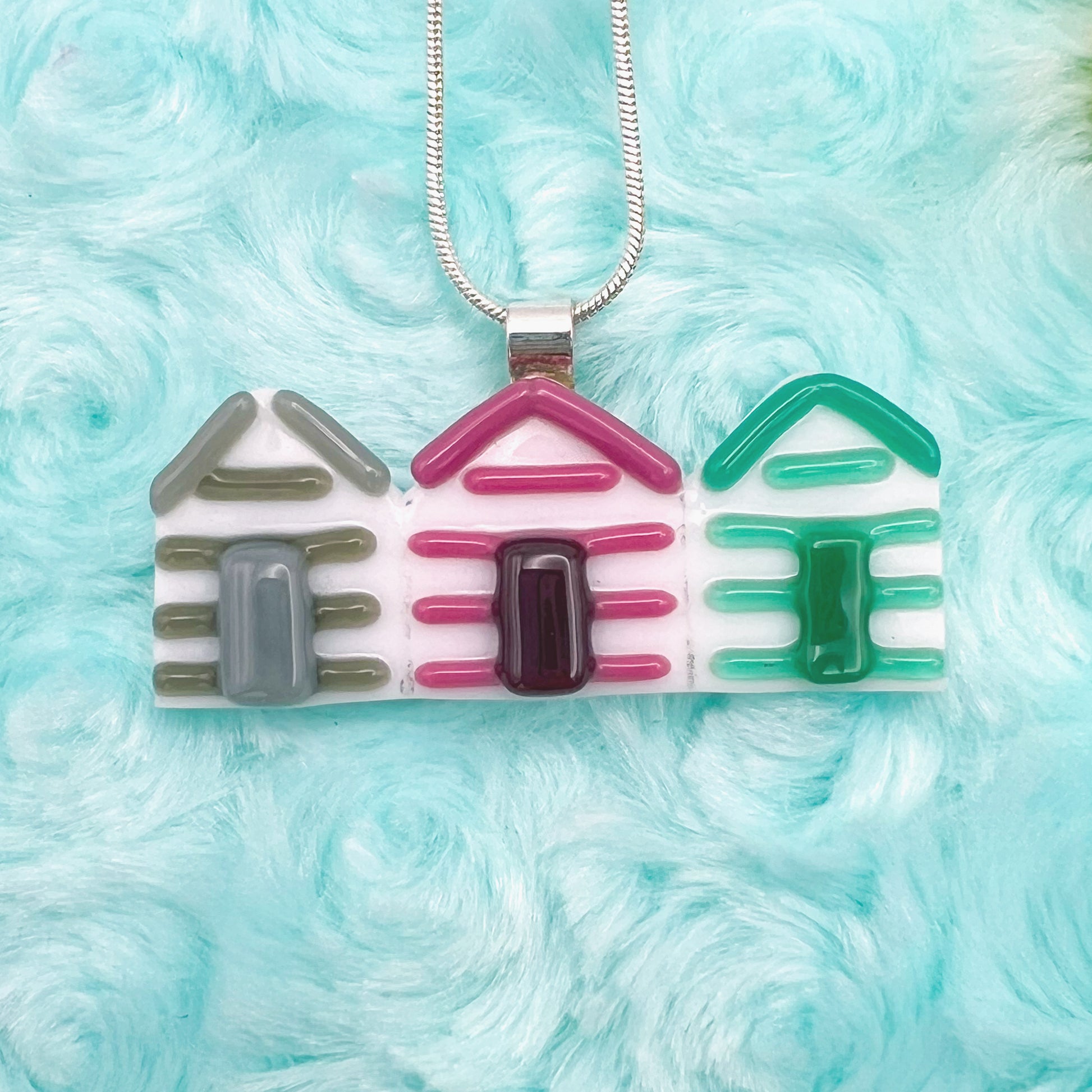 I made this necklace with a base of opaque white glass, I then added pink, green and grey stripes, roof and a little door. I then shaped it into three beach huts in a row.