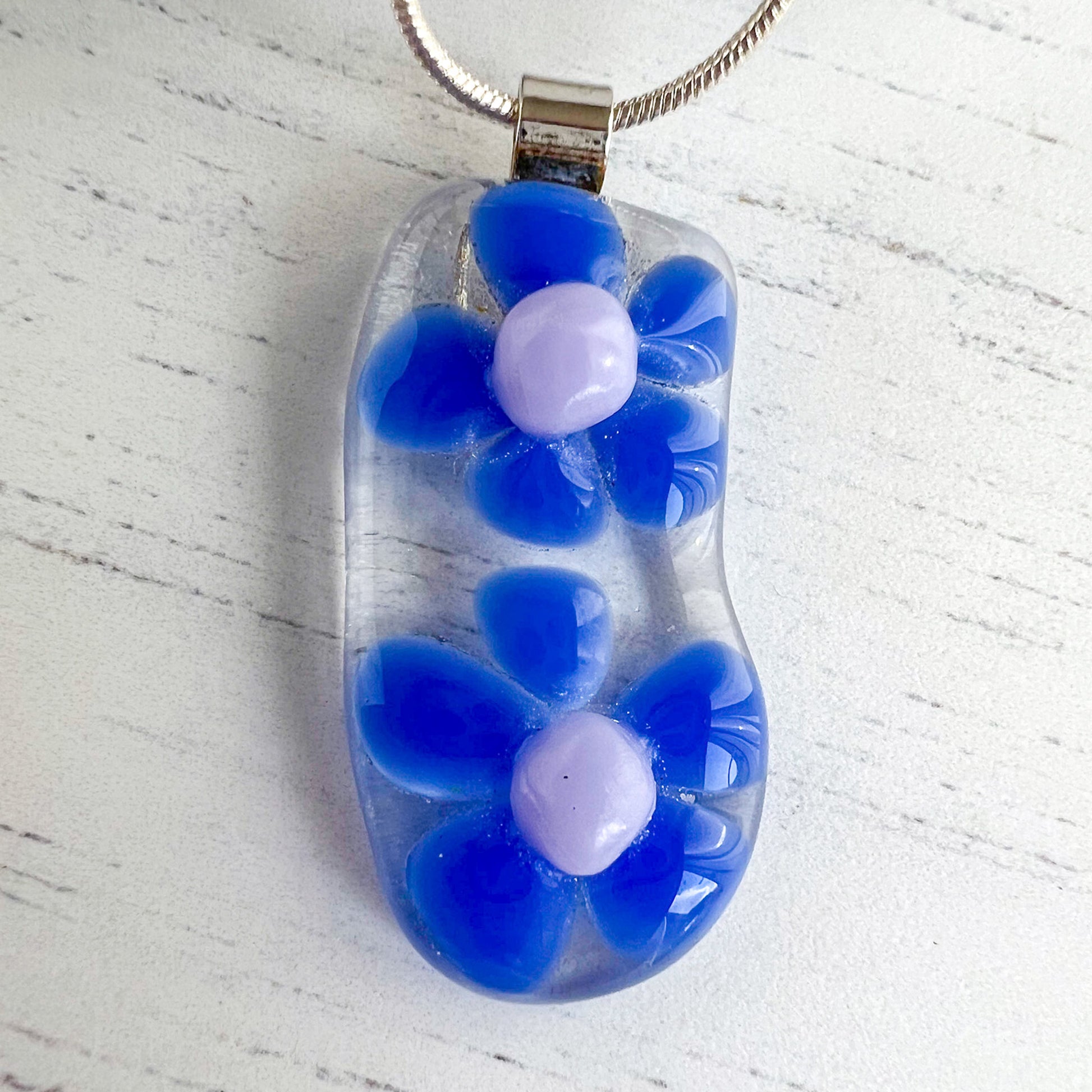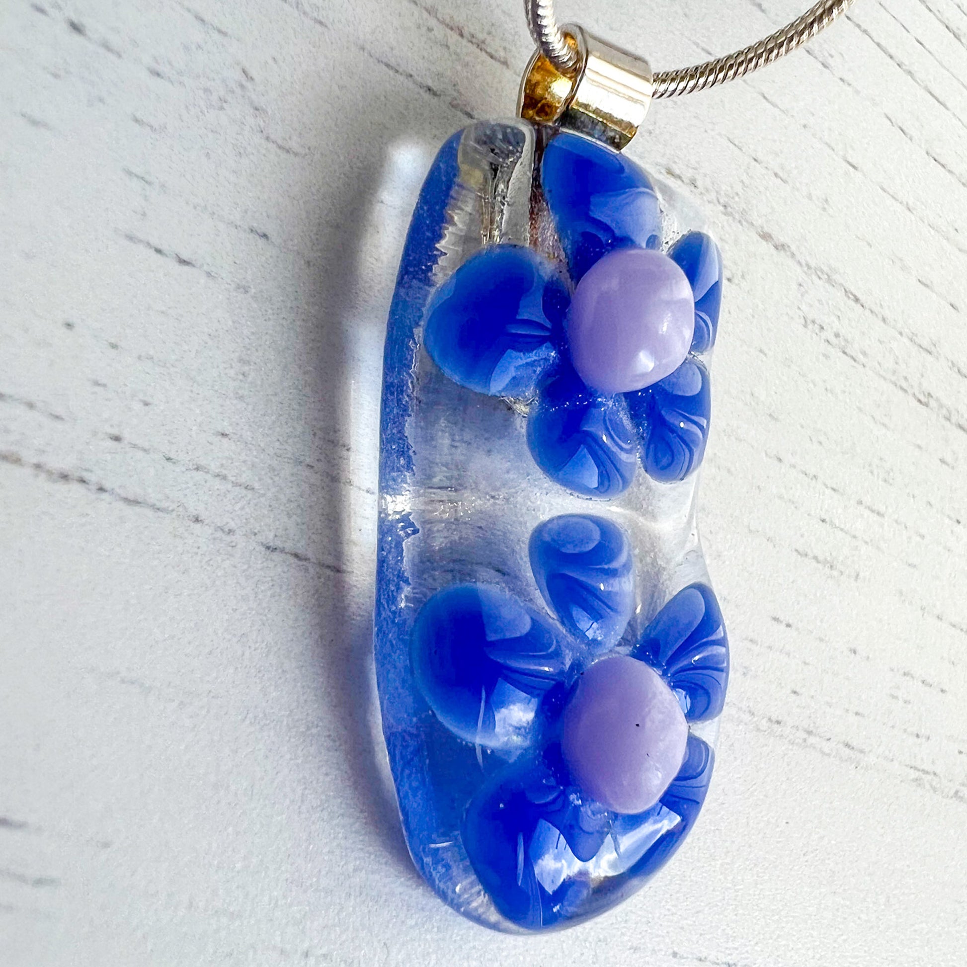 I made this necklace with a base of clear glass, I then put two flowers with periwinkle petals and lilac centres on the top.
