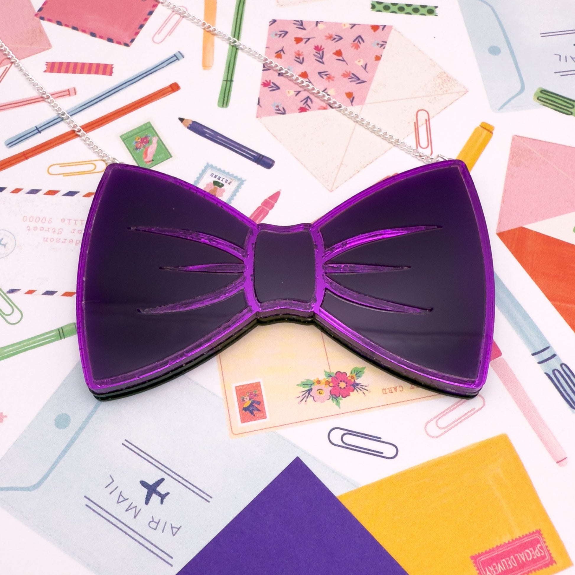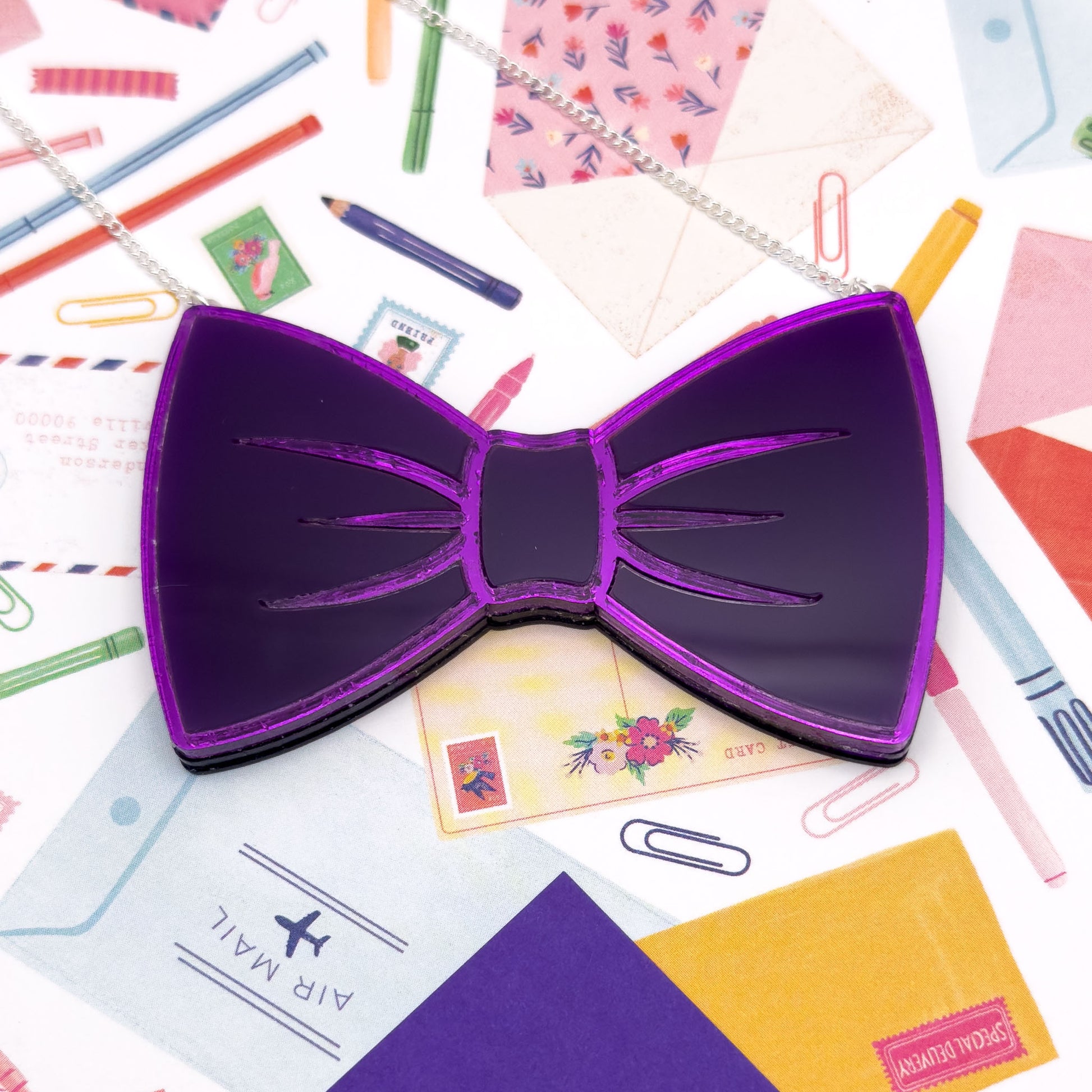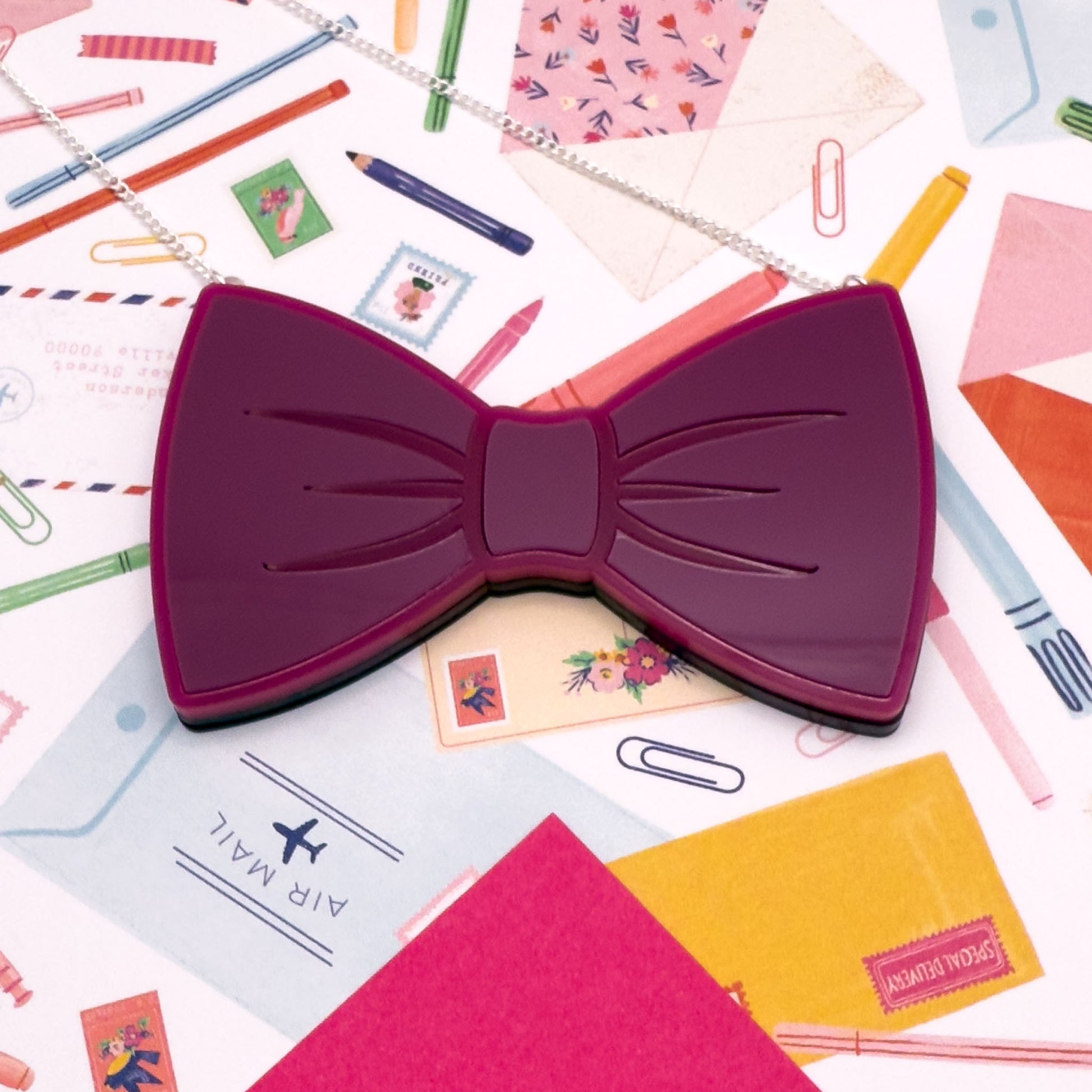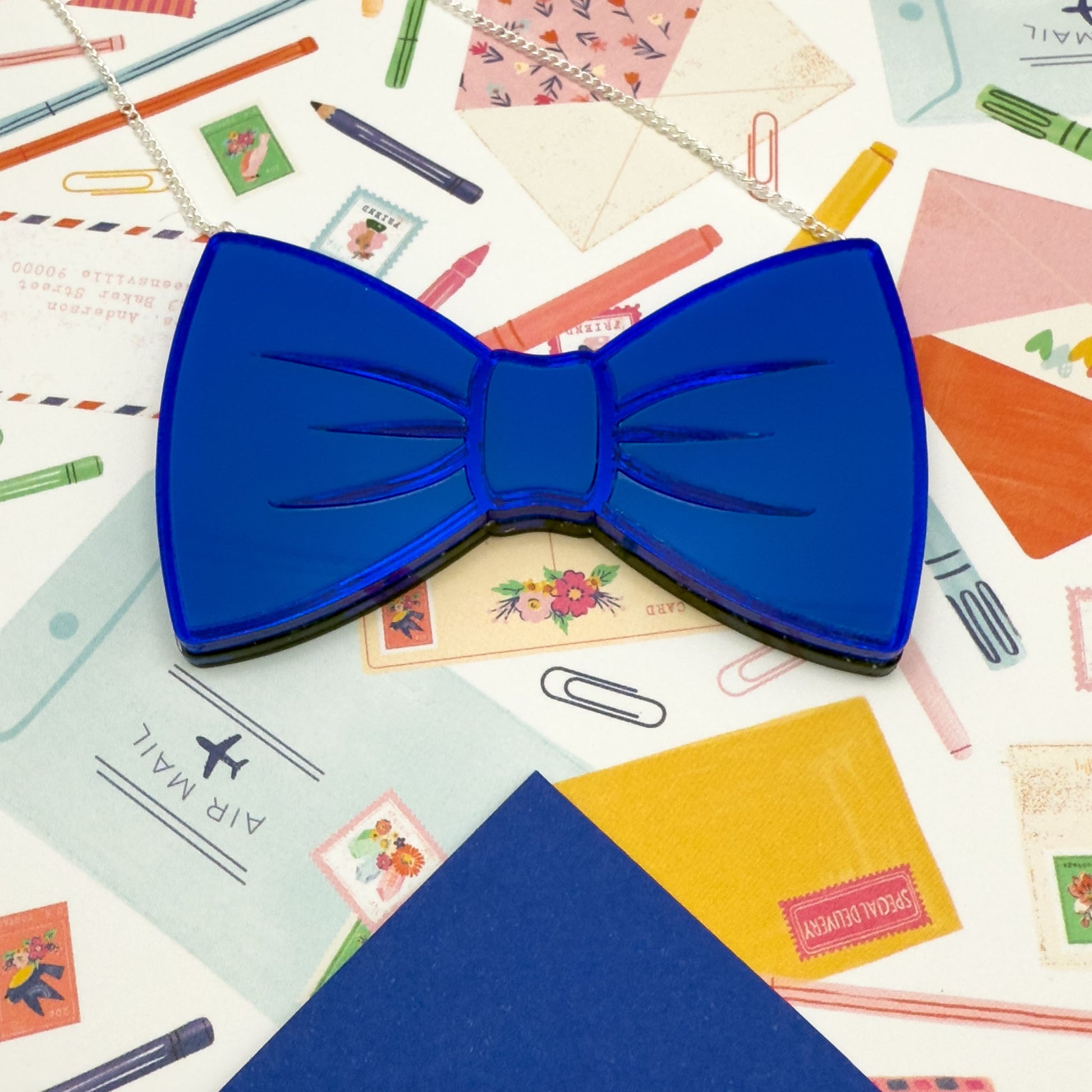 Add a pop of playful charm with this handmade acrylic bow tie necklace designed, laser cut and hand assembled, all by me in my Welsh studio!