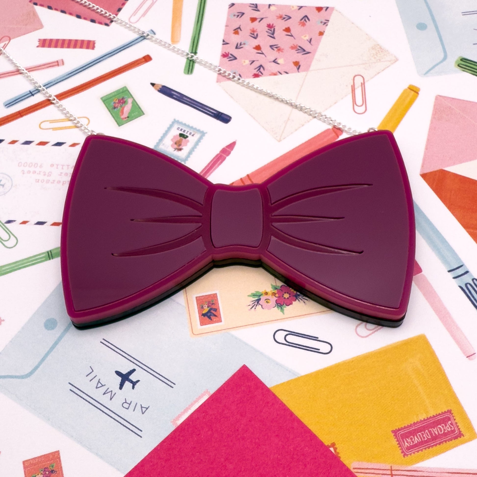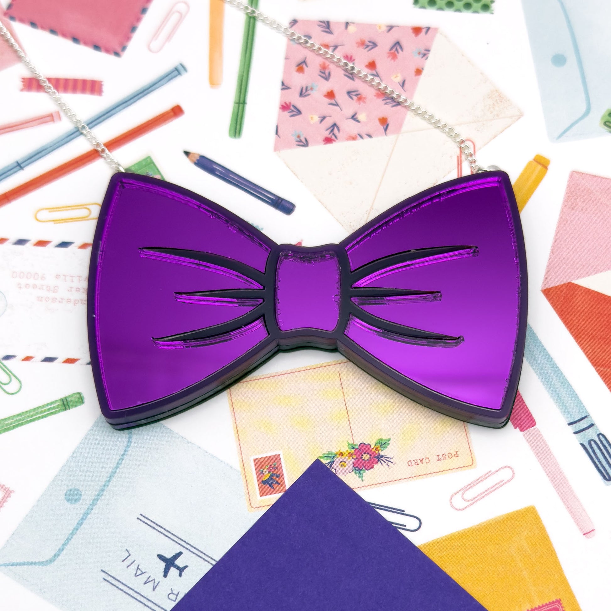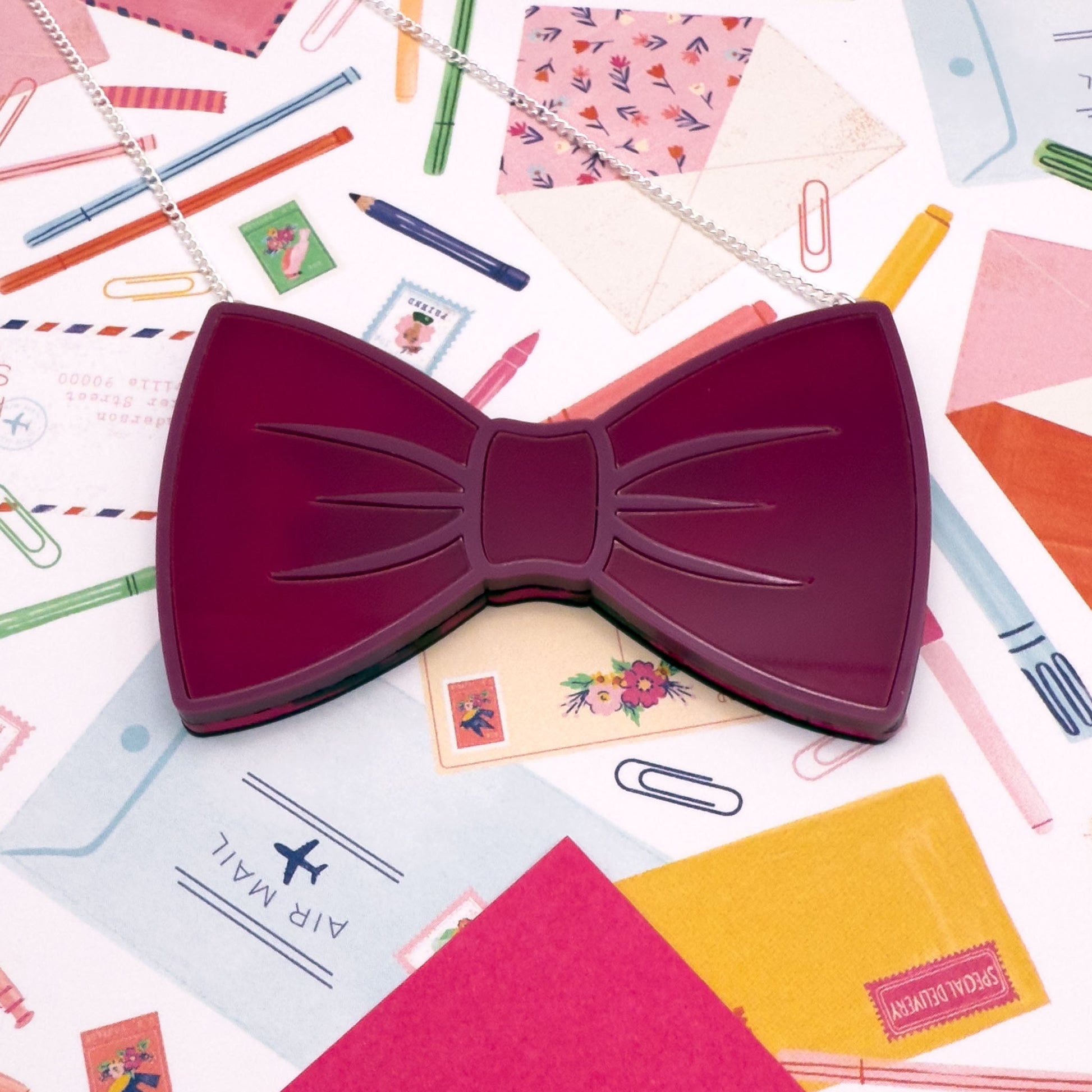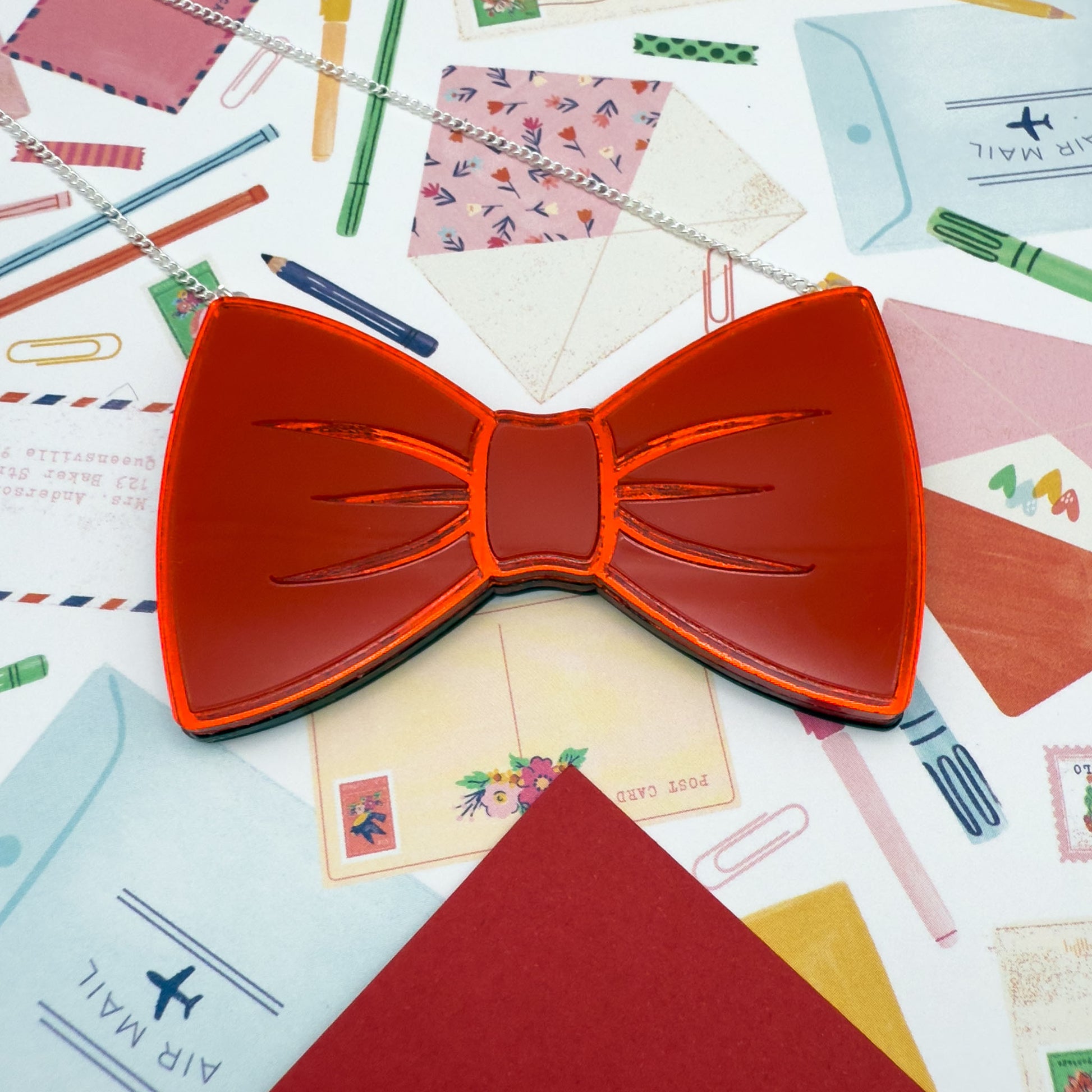 Add a pop of playful charm with this handmade acrylic bow tie necklace designed, laser cut and hand assembled, all by me in my Welsh studio!