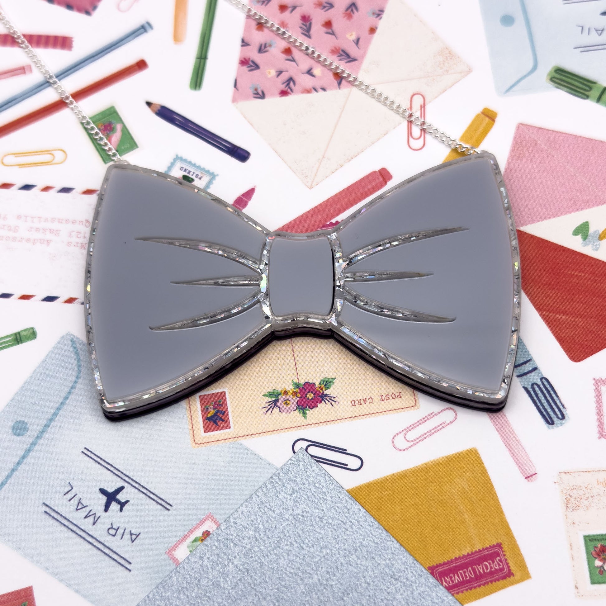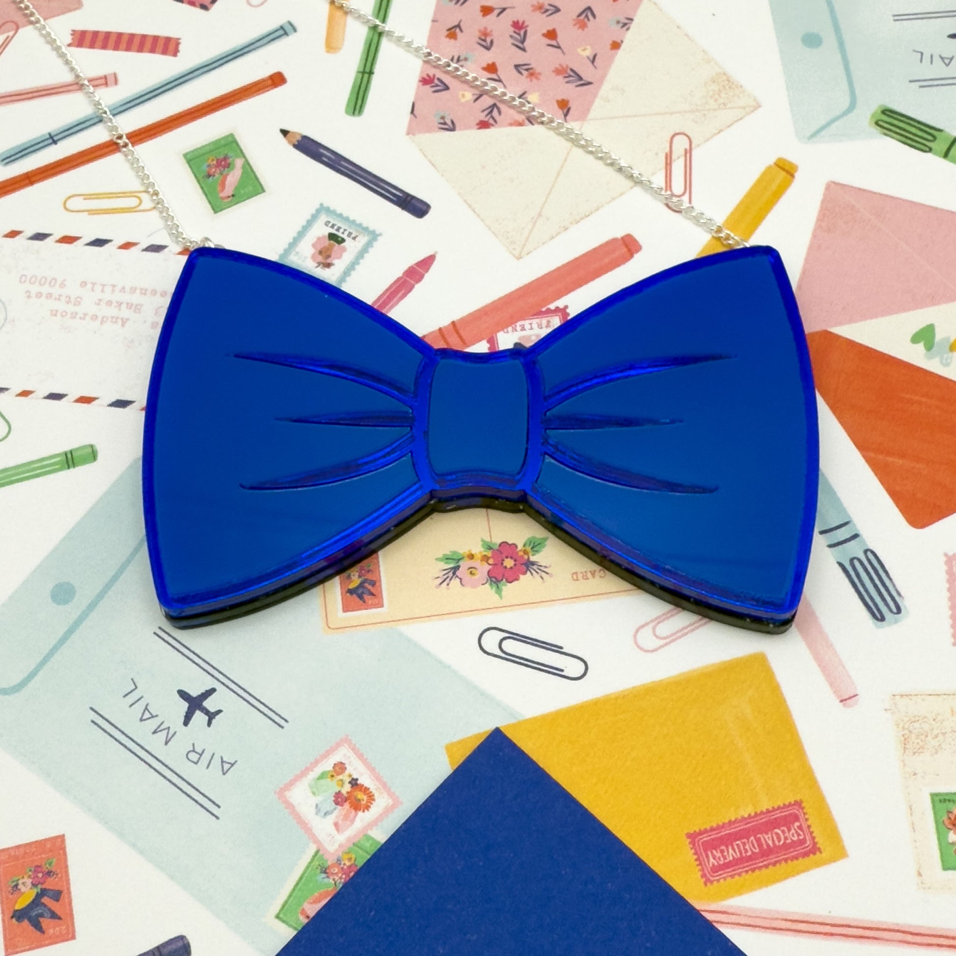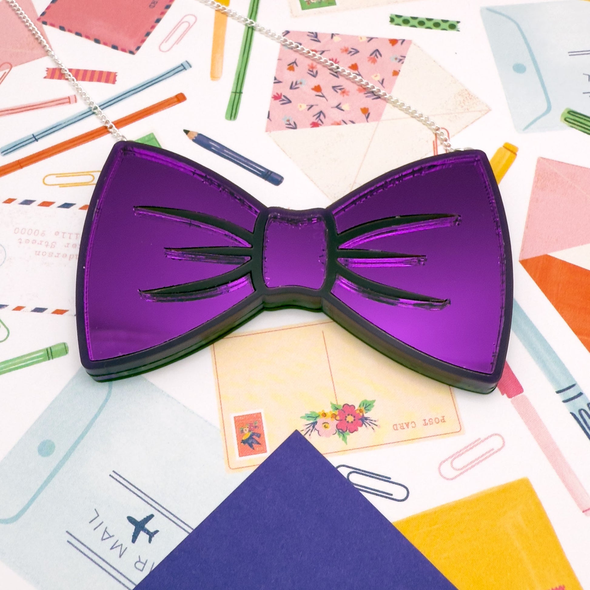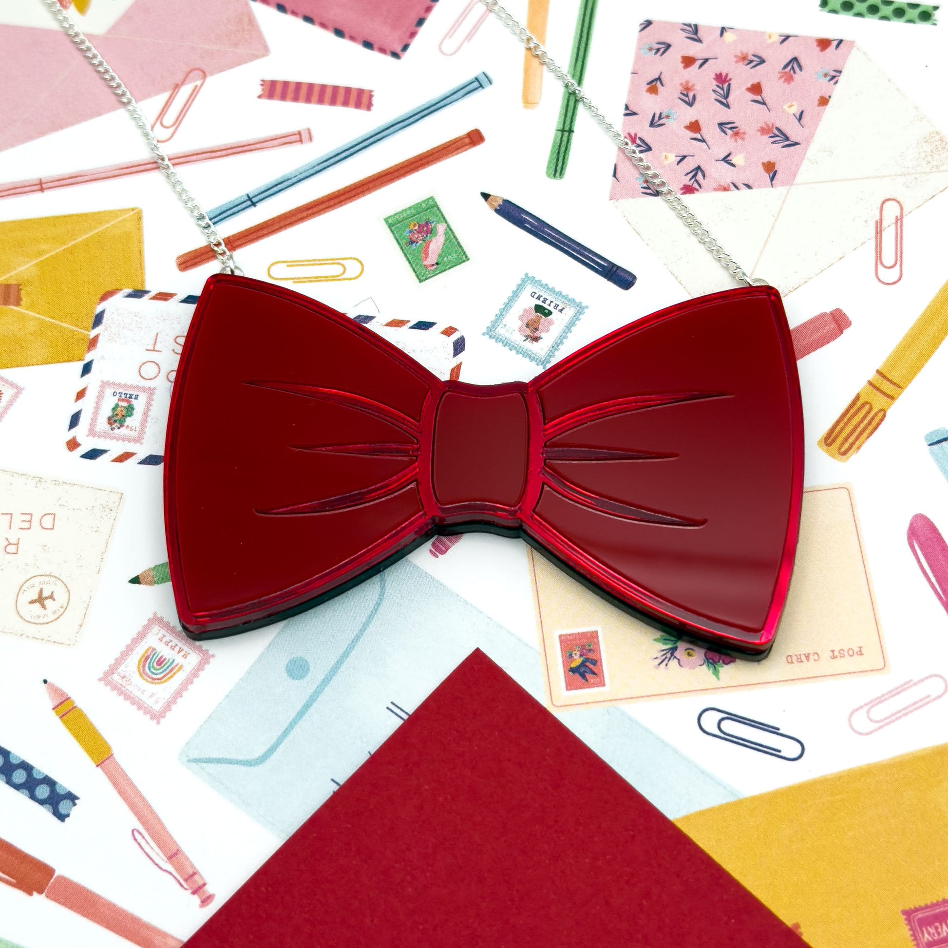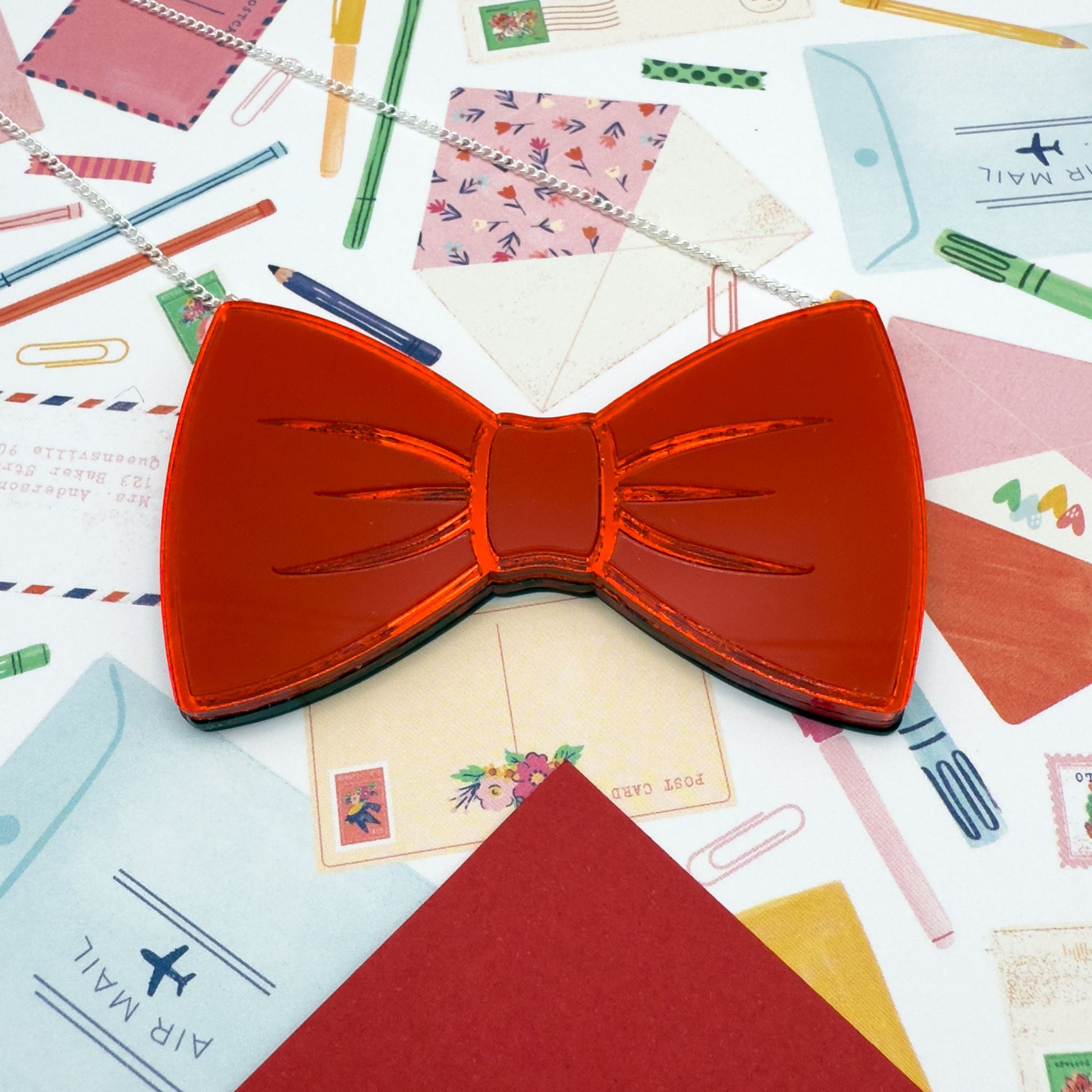 Add a pop of playful charm with this handmade acrylic bow tie necklace designed, laser cut and hand assembled, all by me in my Welsh studio!