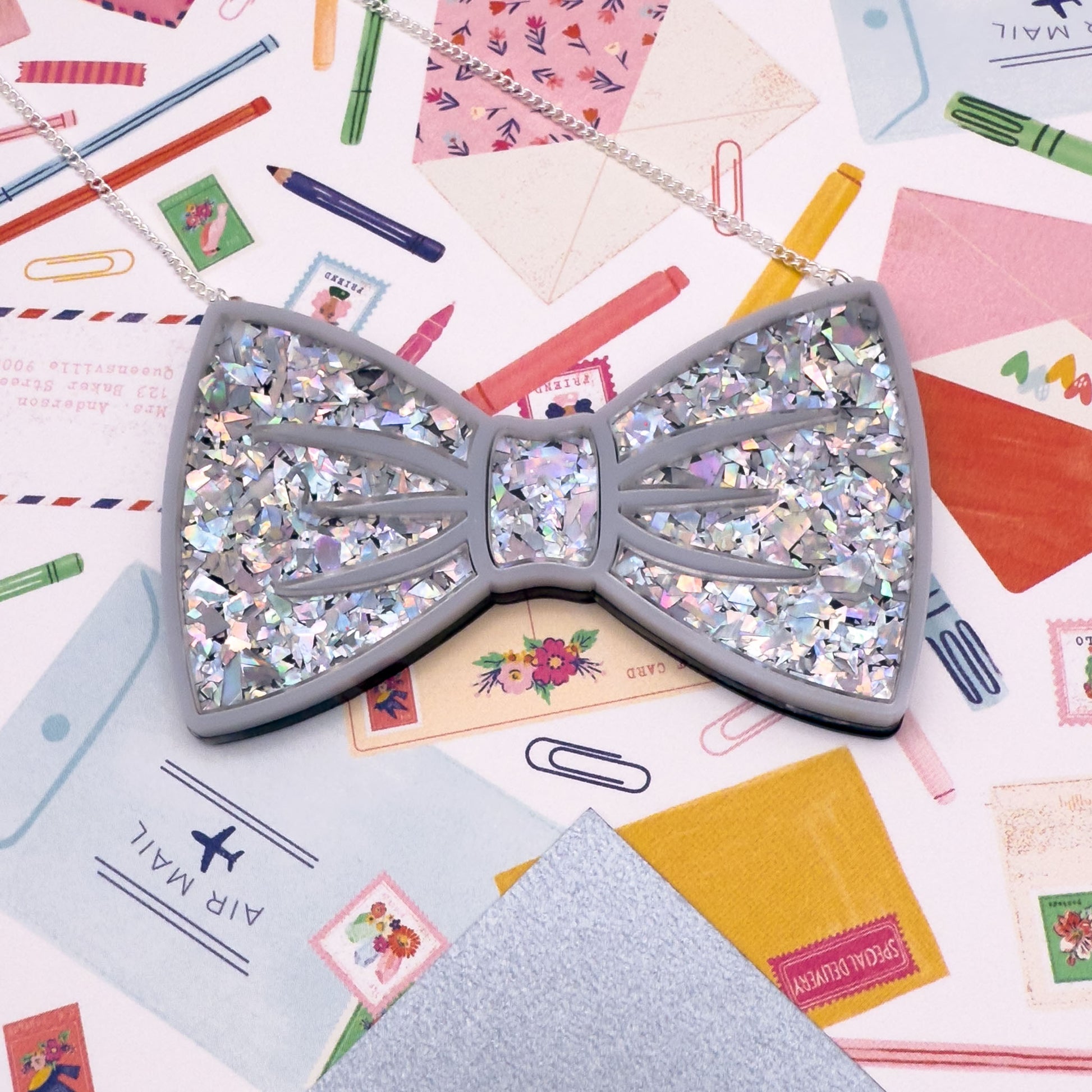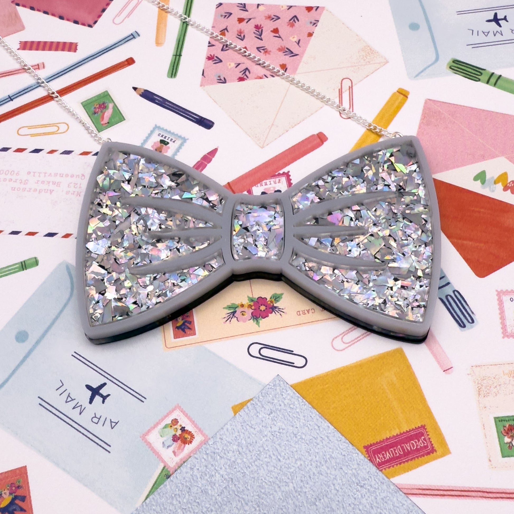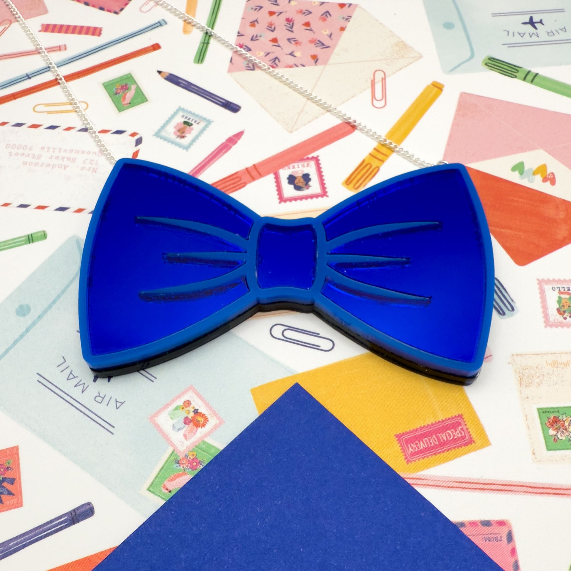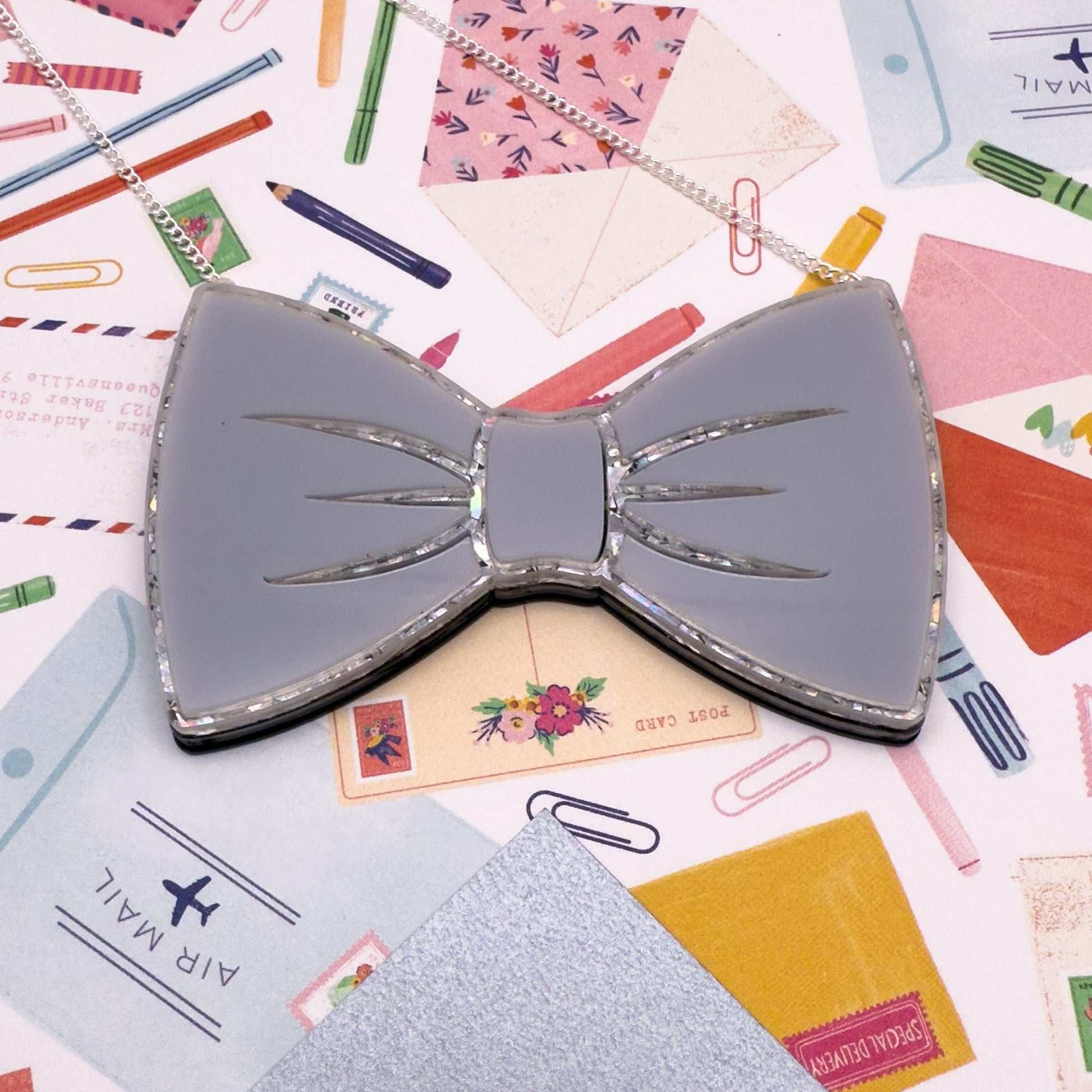 Add a pop of playful charm with this handmade acrylic bow tie necklace designed, laser cut and hand assembled, all by me in my Welsh studio!