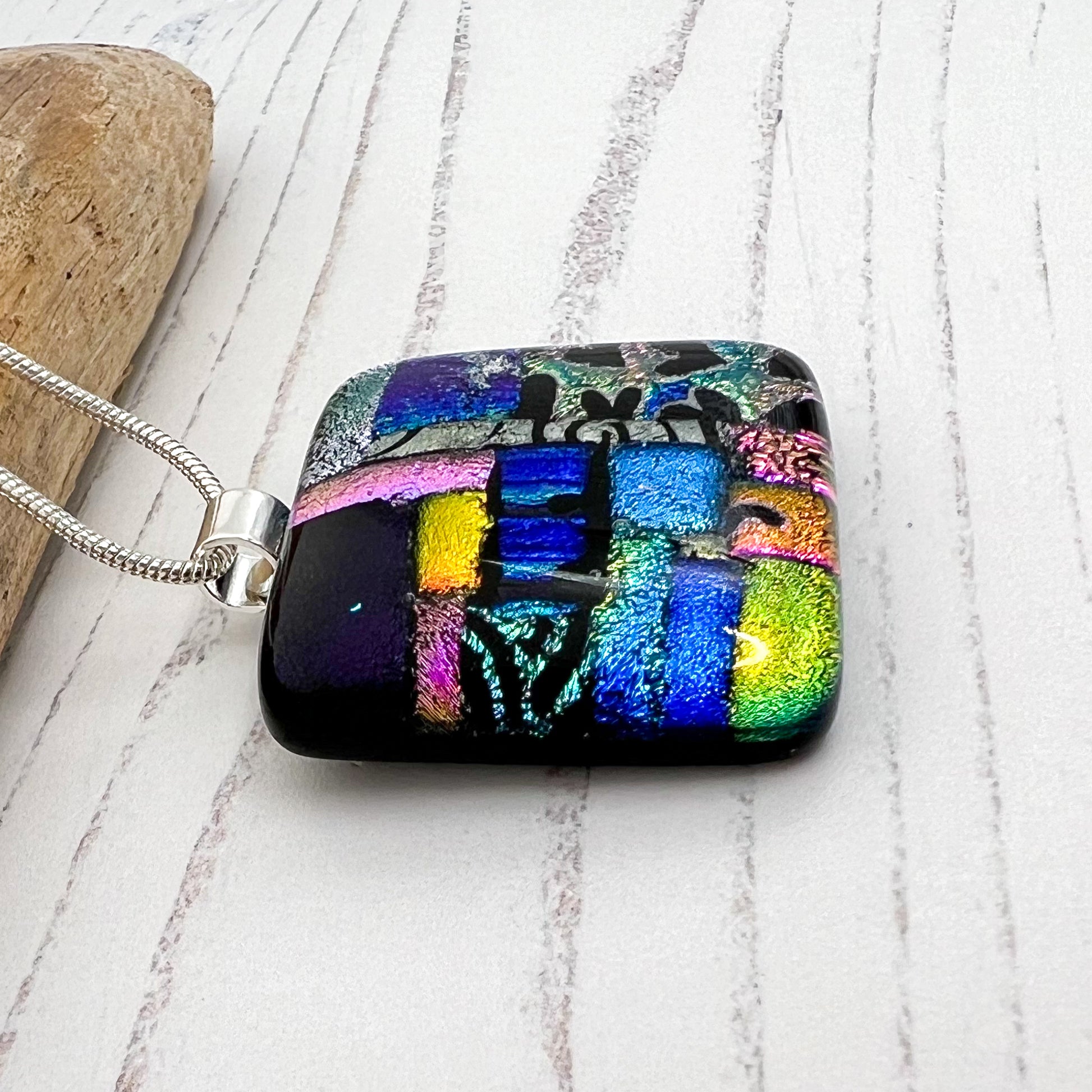 I made this necklace with a base of opaque black and I then layered over the top little individually cut multicoloured dichroic squares and rectangles.