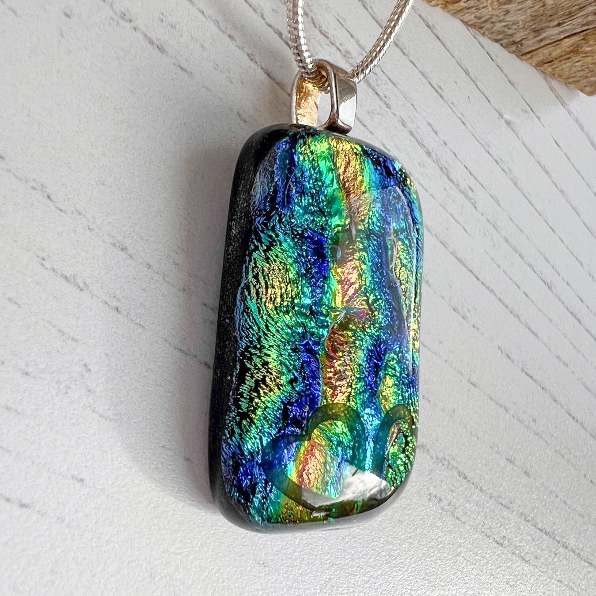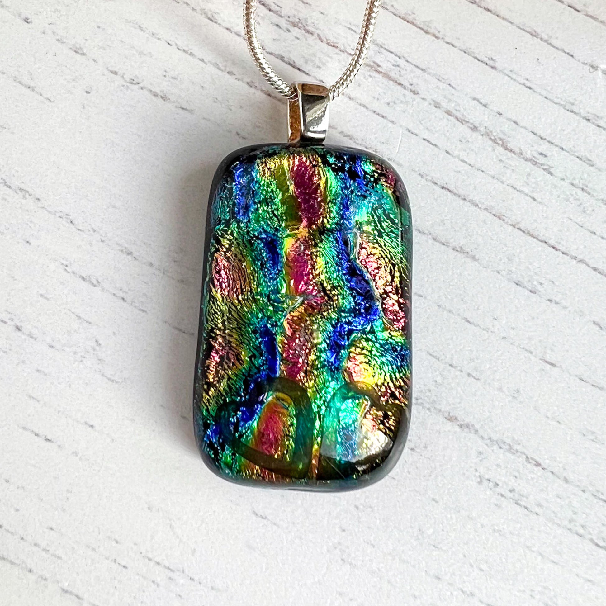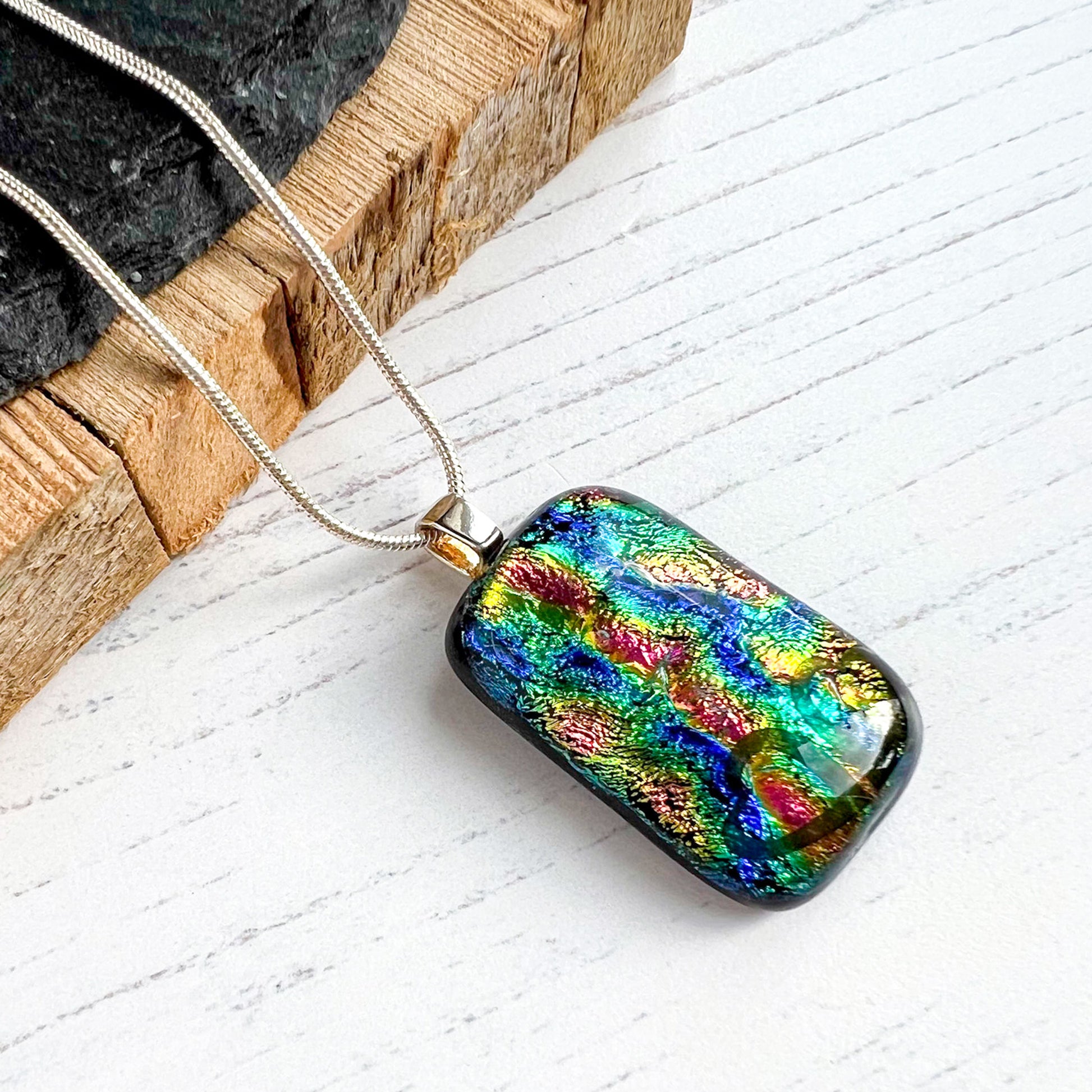 The cariad rainbow dichroic glass necklace in multicoloured dichroic. It is a handmade necklace inspired by living in Wales.