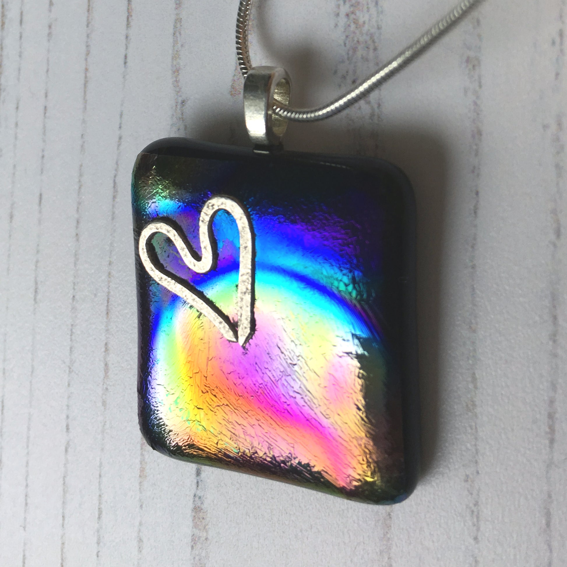 This dichroic necklace has been left bare which gives an intense metallic sheen. I have also created a small sterling silver heart out of 99% silver clay and attached it to the glass.