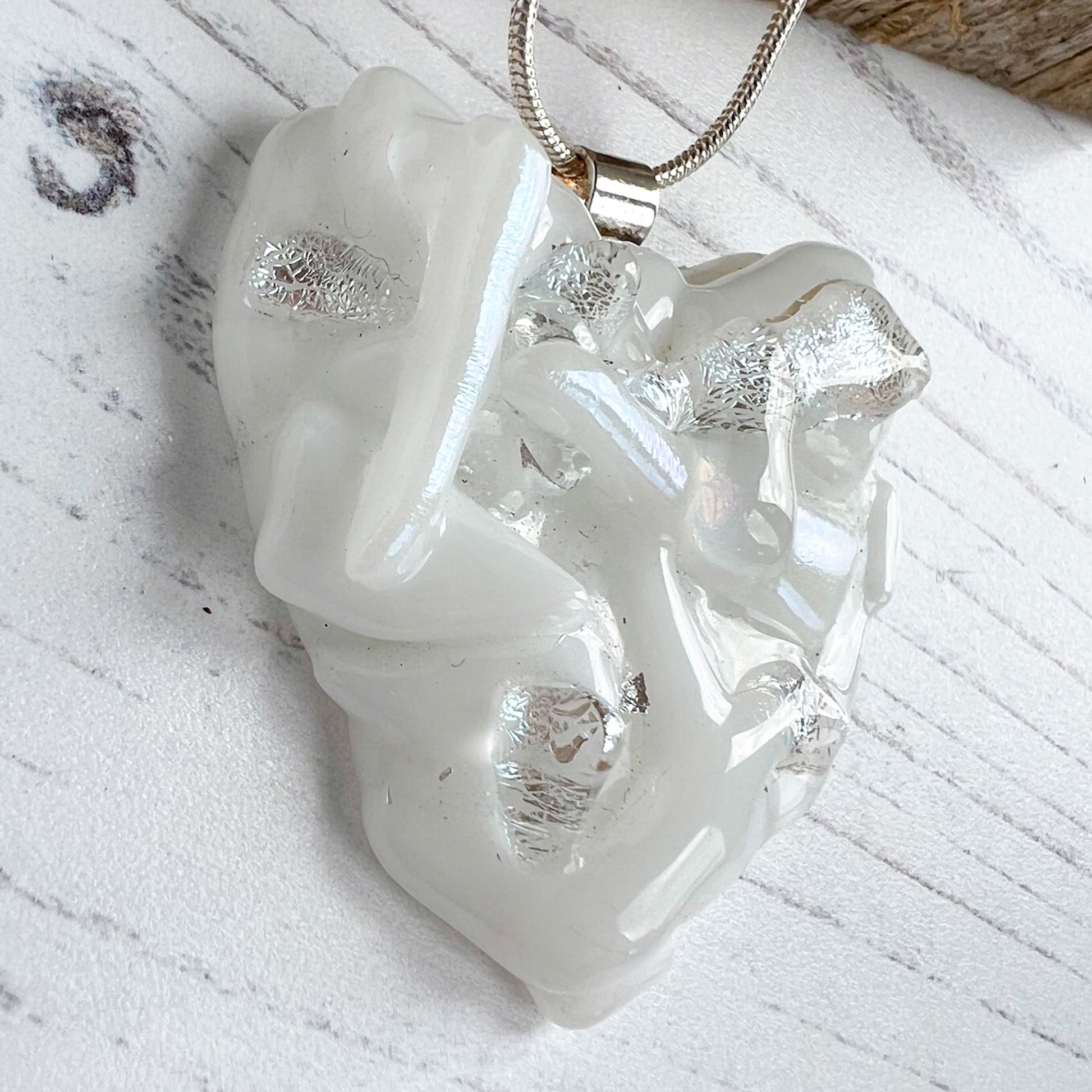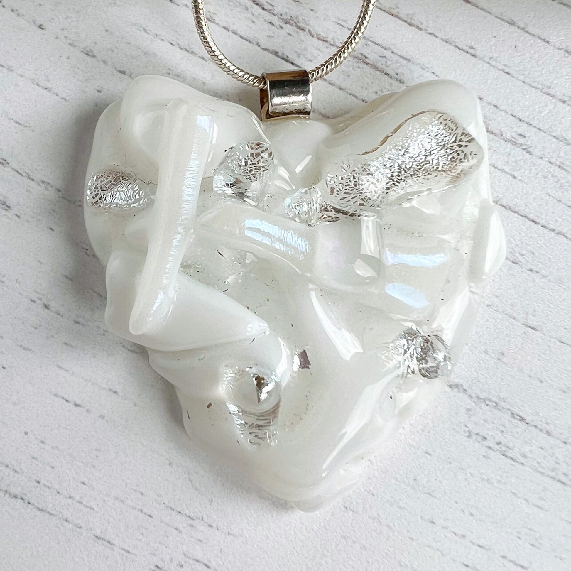 This necklace is a white heart. It is also scattered with silver dichroic for a bit of sparkle.