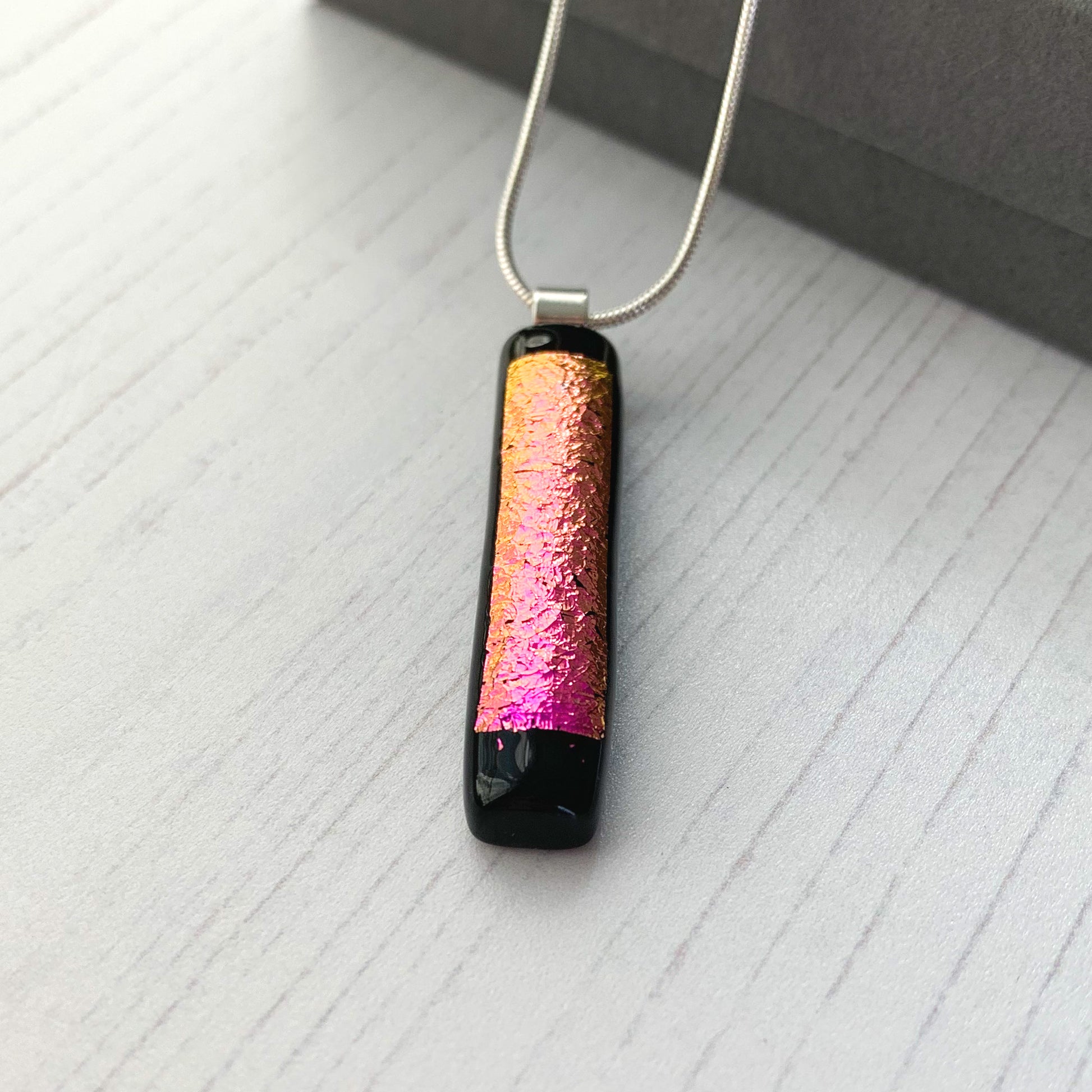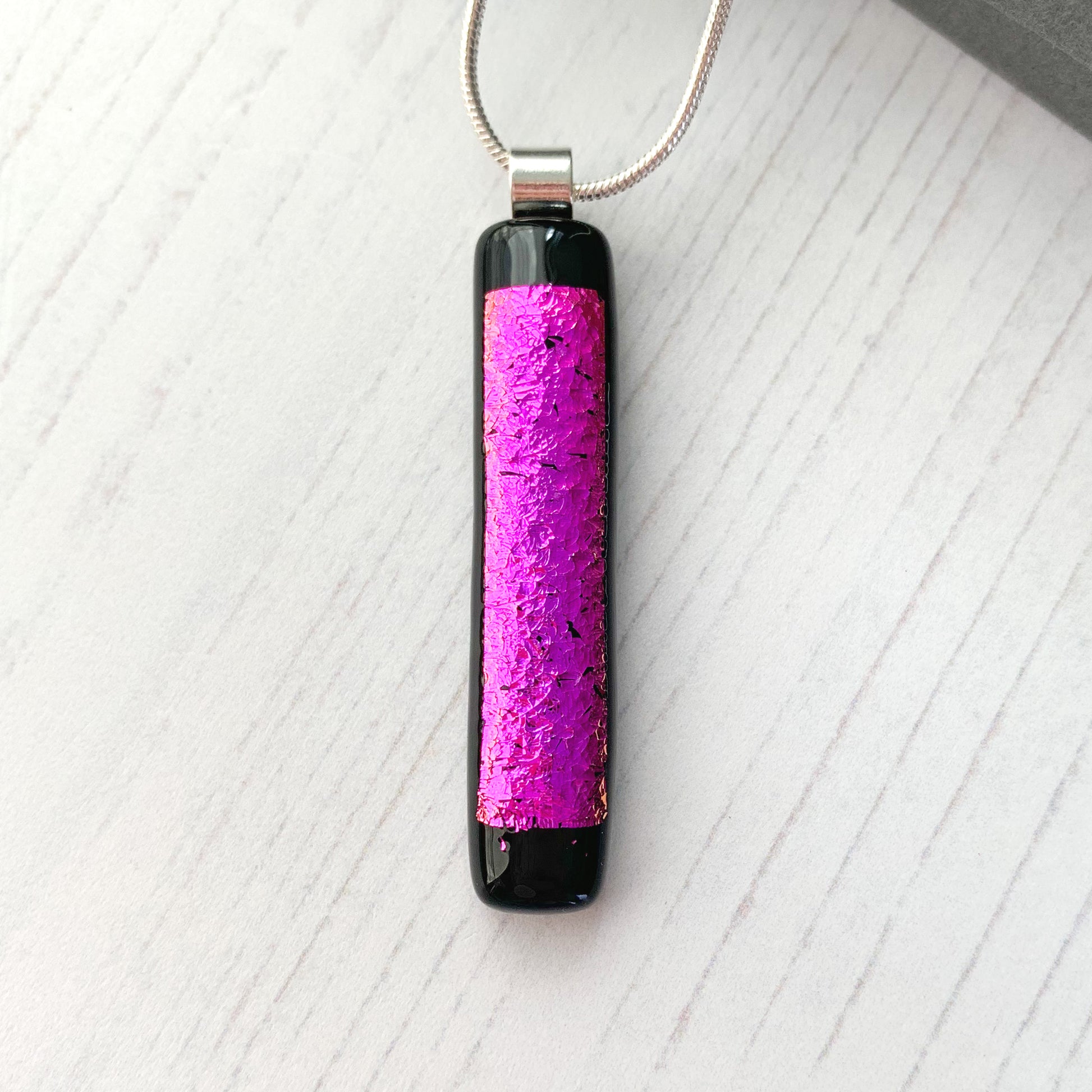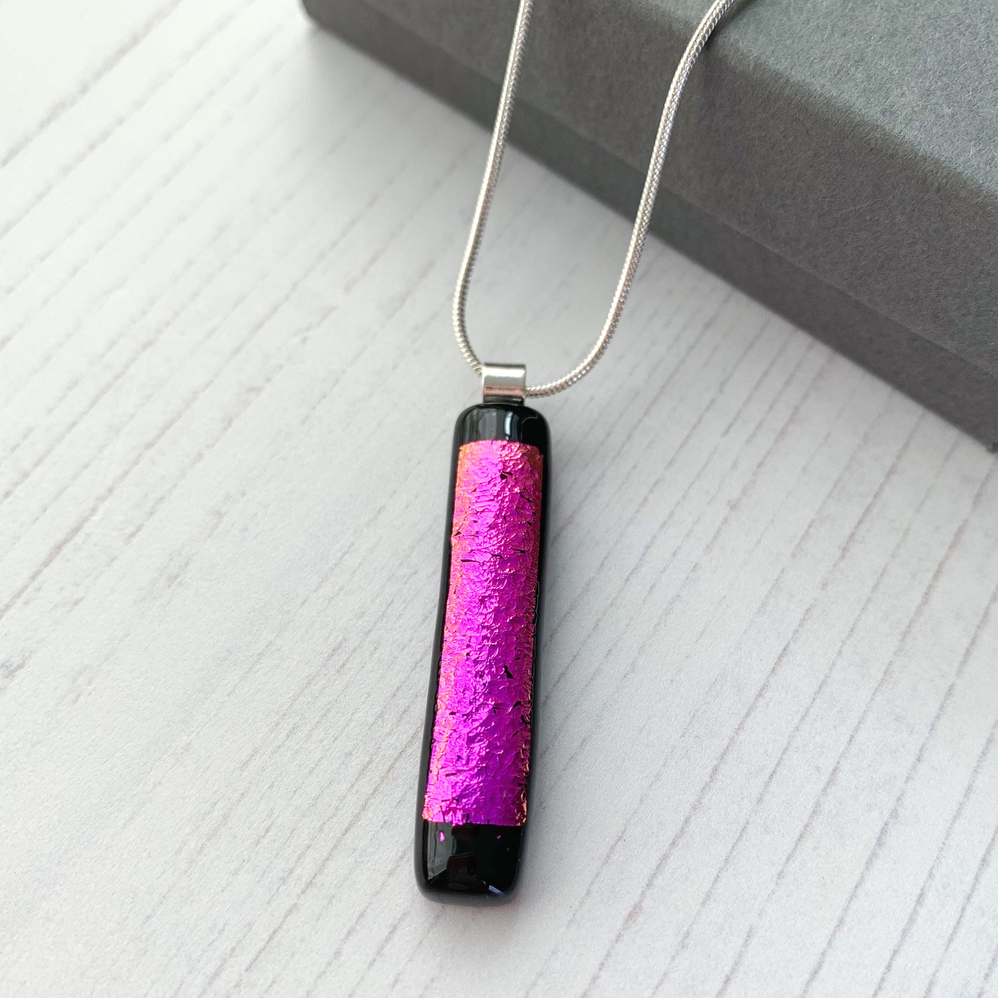 I made this necklace with a base of black opaque glass and I layered bright pink dichroic glass over the top for a bold fuchsia look.
