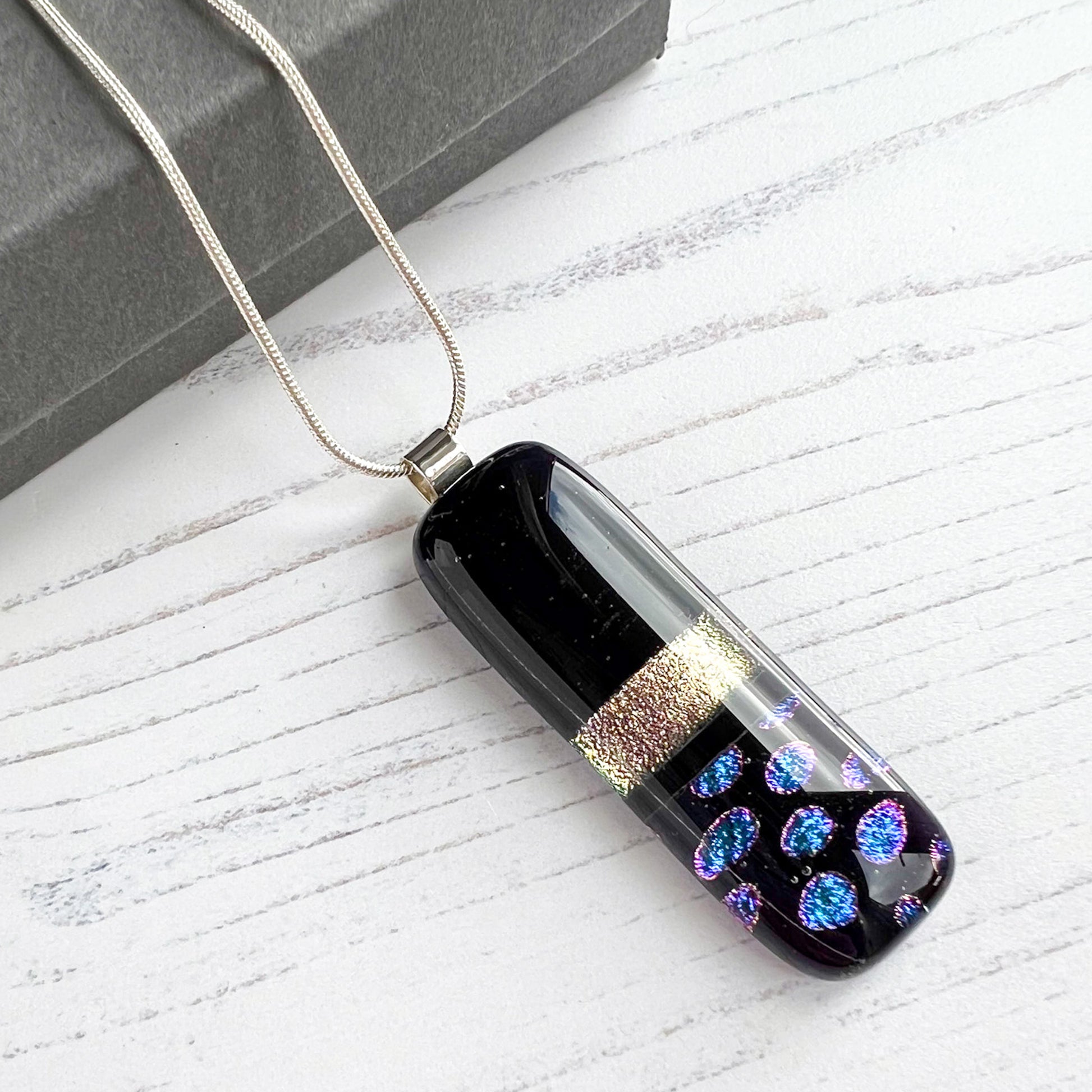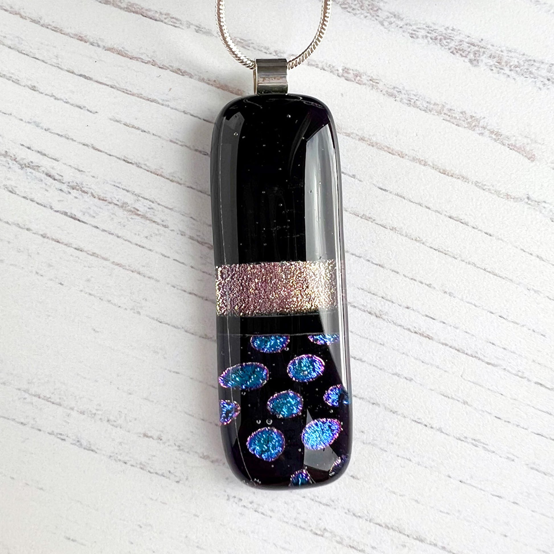 I made this necklace with a base of translucent dark purple and I layered different dichroic glass strips with a band of pink and a dotty blue dichroic over the top for a bit of sparkle.