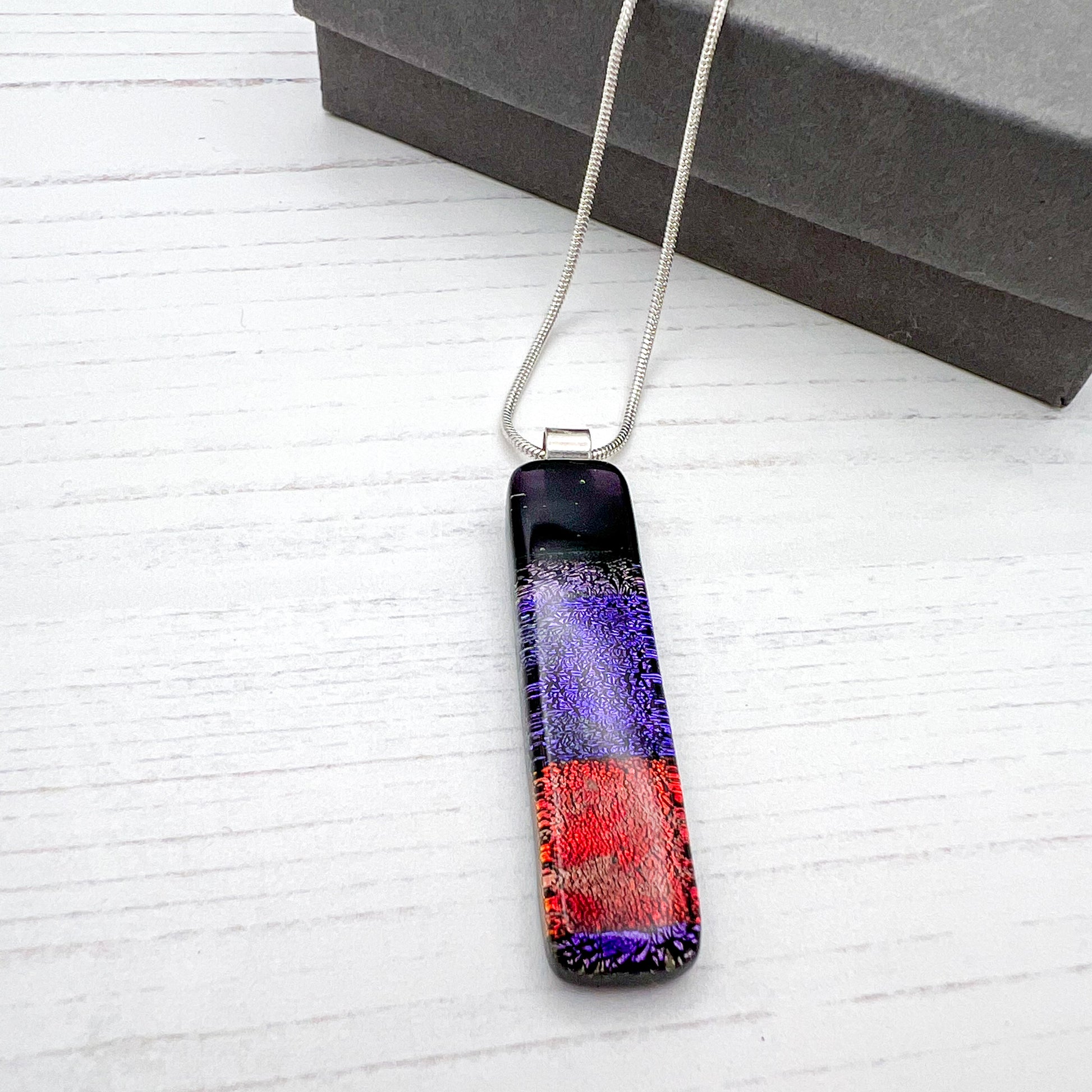 I made this necklace with a translucent dark purple base and I layered multicoloured dichroic glass in blocks of purple and red over the top for a bit of sparkle.