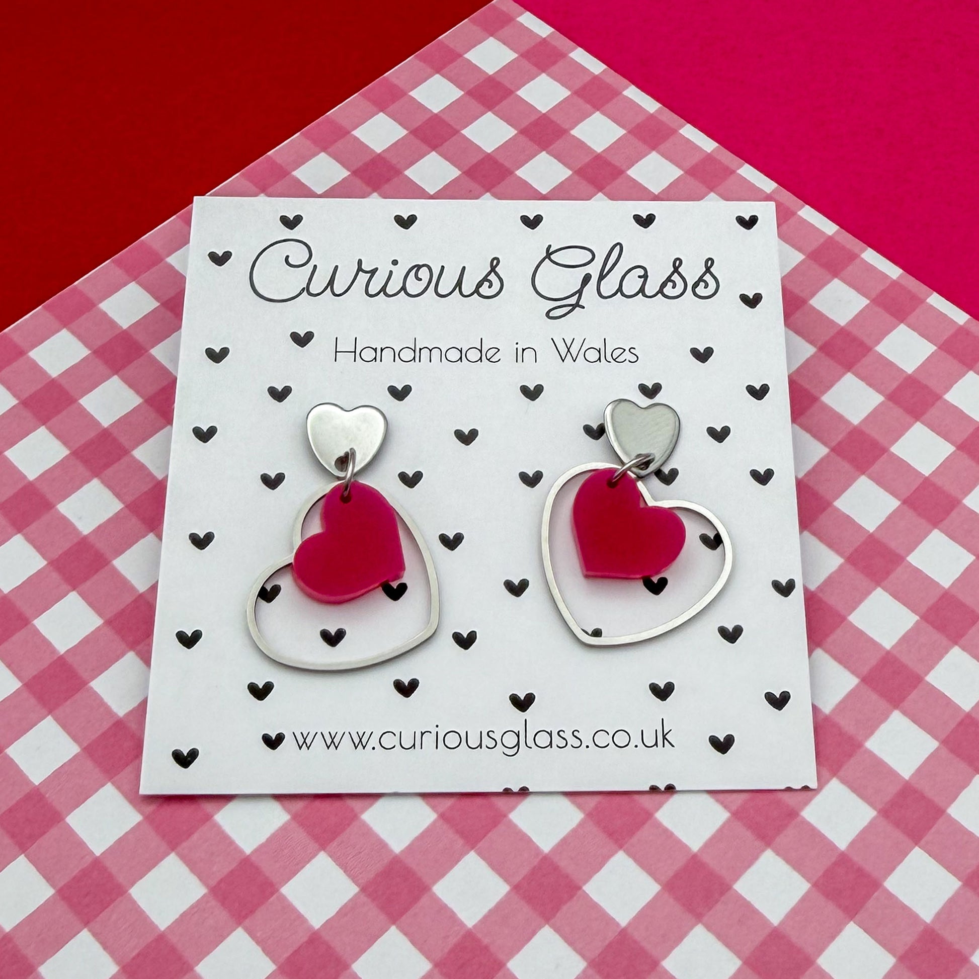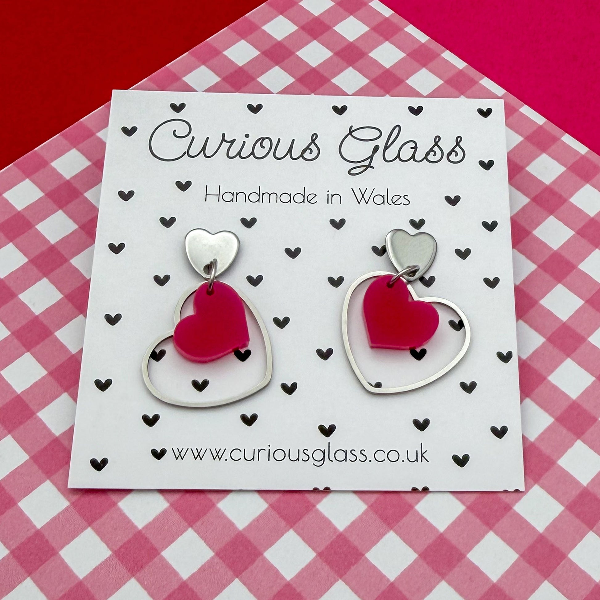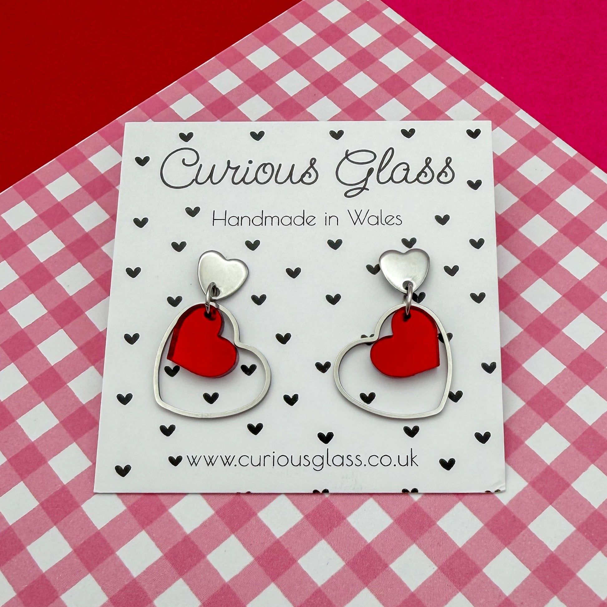 Fall head over heels for these playful double heart earrings, lovingly handmade in Wales. Featuring a cute heart suspended inside a sleek open heart frame, these earrings are designed to move beautifully and catch the light with every turn.