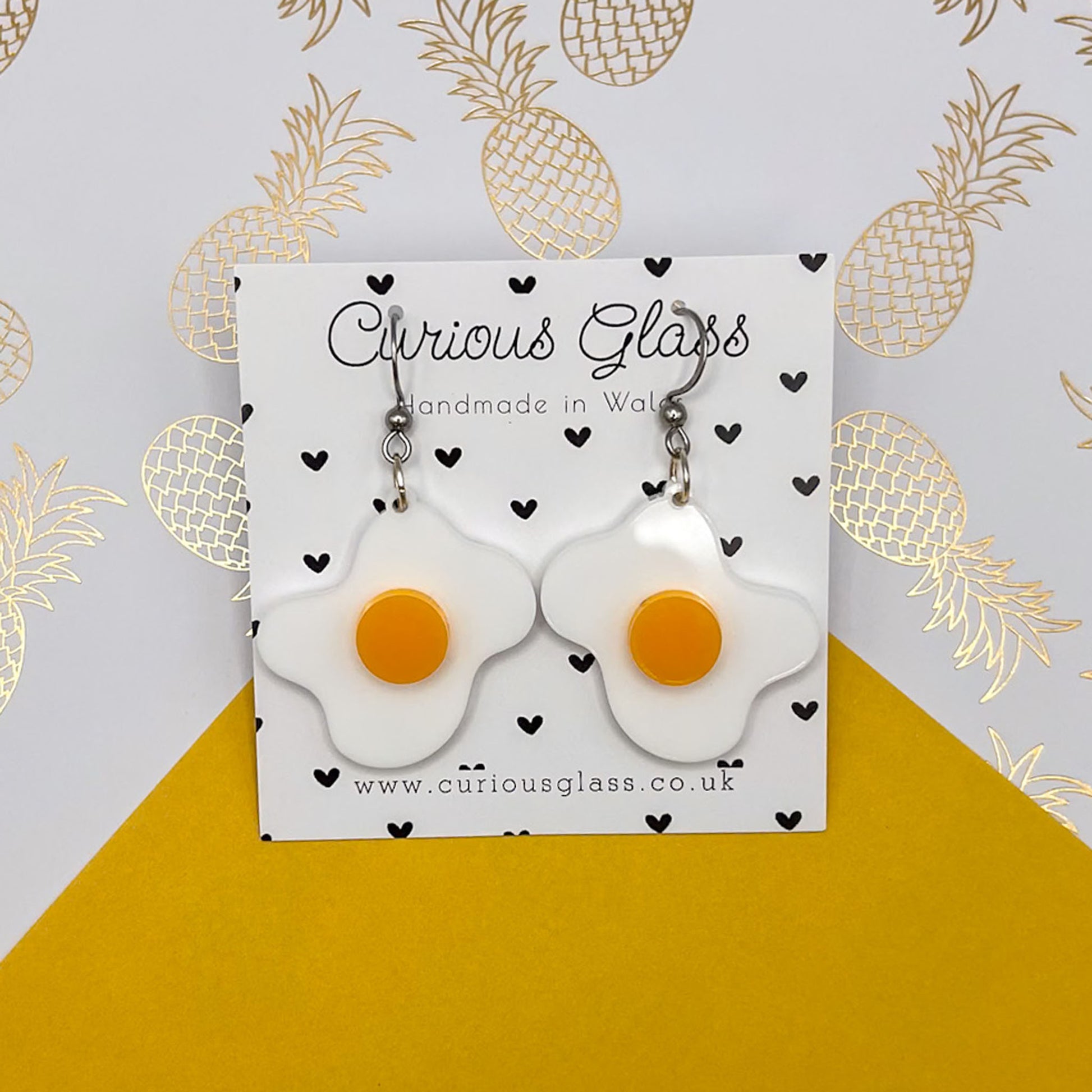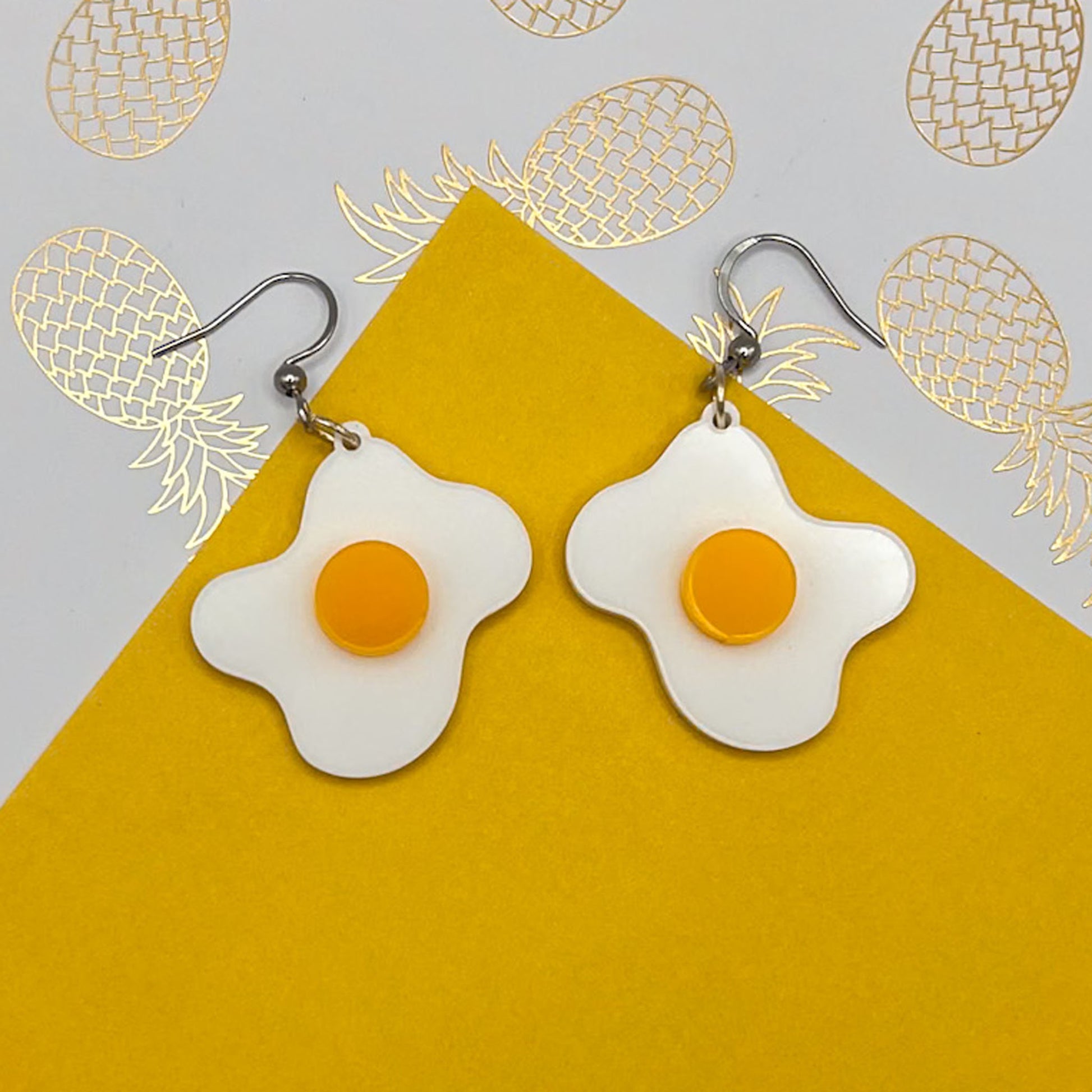Brighten your day with these playful fried egg earrings, meticulously crafted from acrylic to capture the sunny perfection of a classic breakfast favourite. Each earring features a vibrant golden yolk surrounded by crisp, white edges, creating a miniature culinary masterpiece. Lightweight and full of character, they're an egg-ceptionally cheeky addition to your jewellery collection, sure to add a dash of breakfast charm to any look.