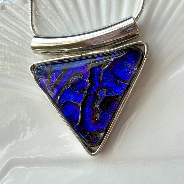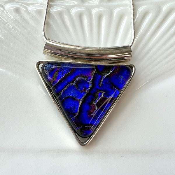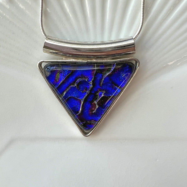 This twinkle triangle blue is a handmade necklace that I make with my favourite type of glass, dichroic.