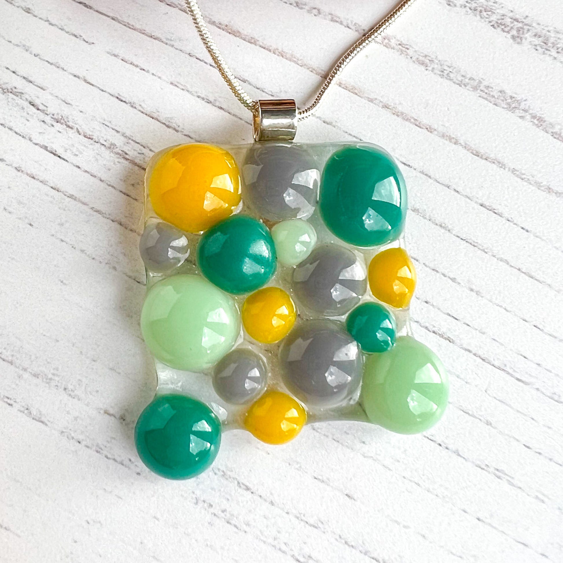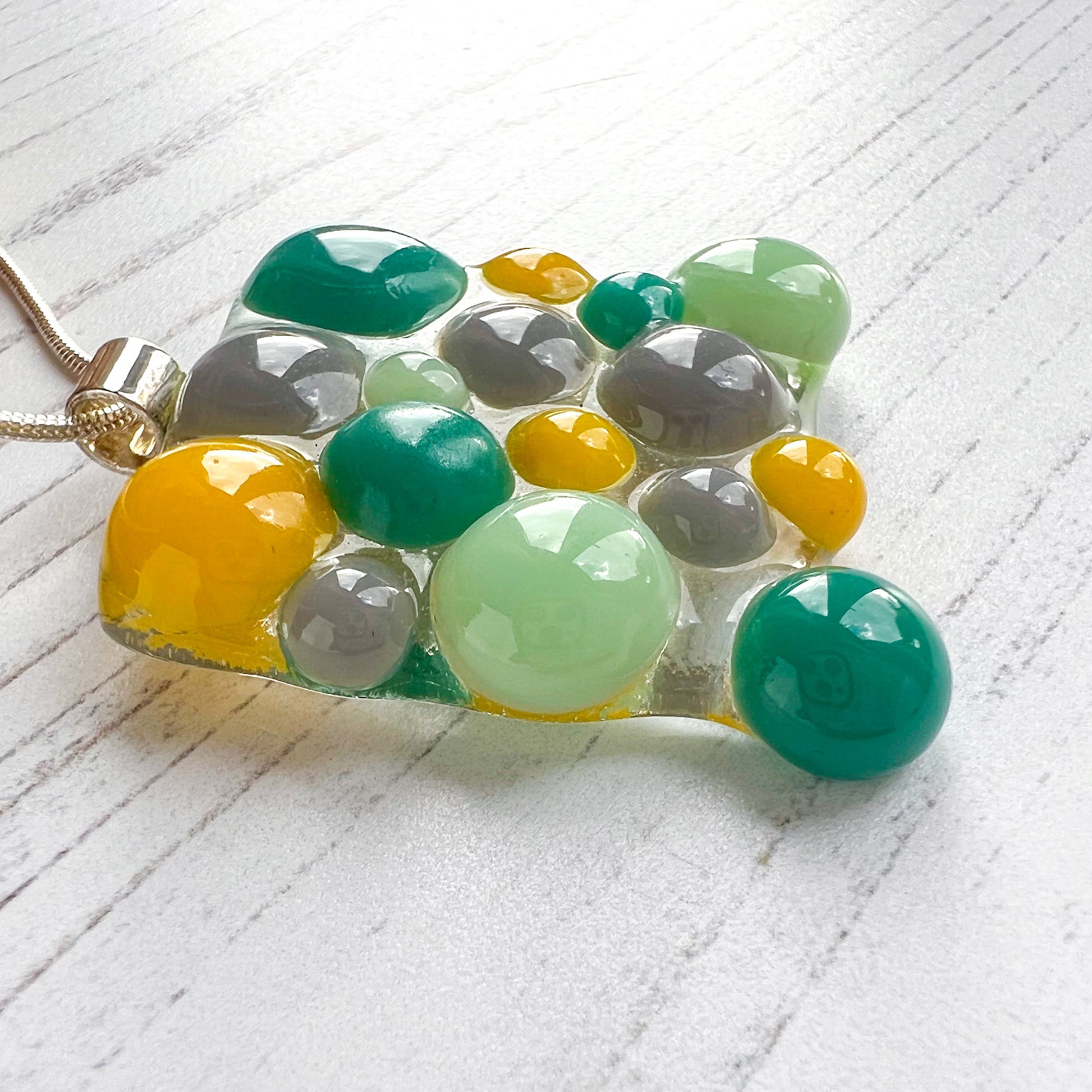 To make this necklace, I individually made glass droplets in greens, yellow and grey and placed them on a clear bed of glass.