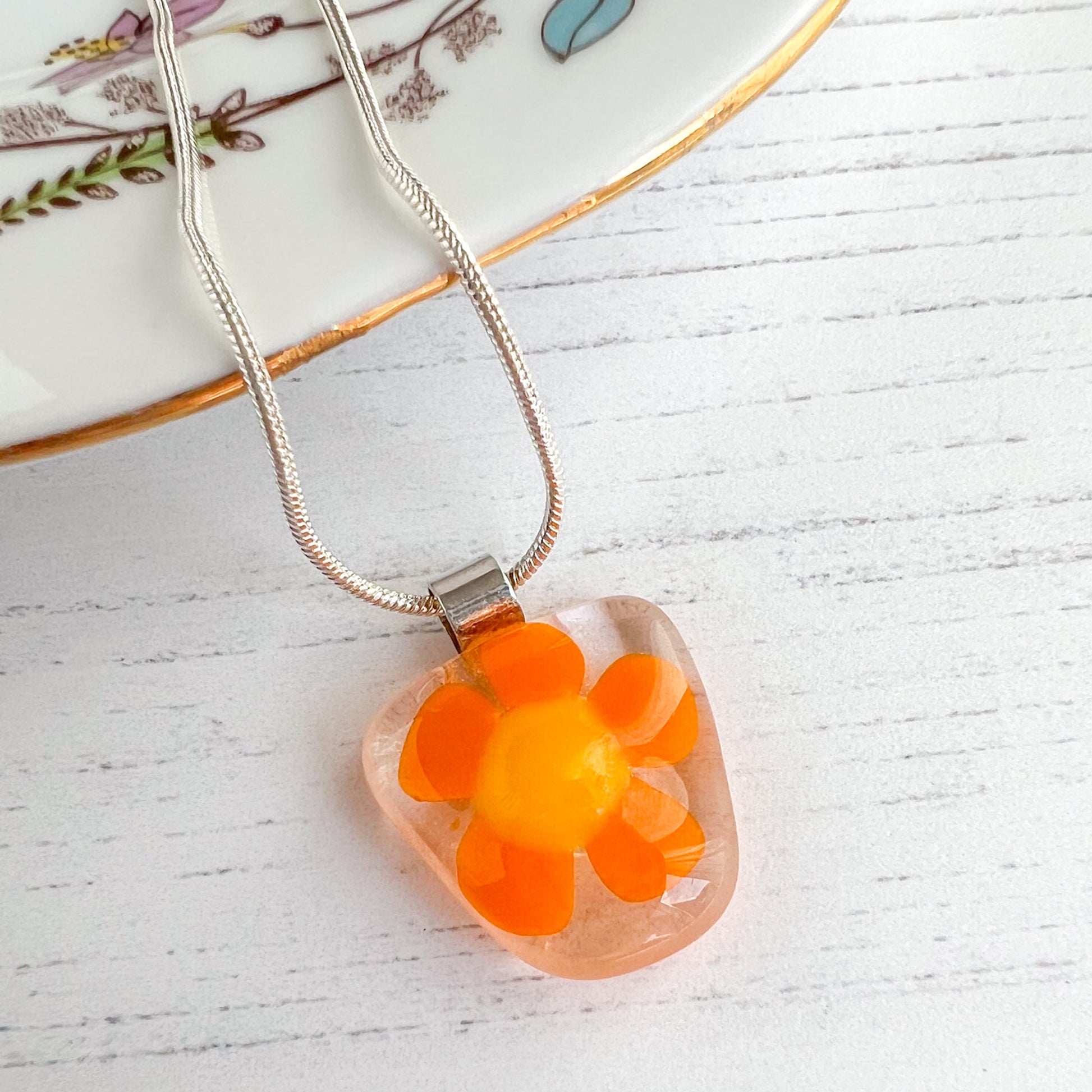 I made this necklace with a base of clear glass, I then put a single flower with orange petals and a yellow centre on the top.