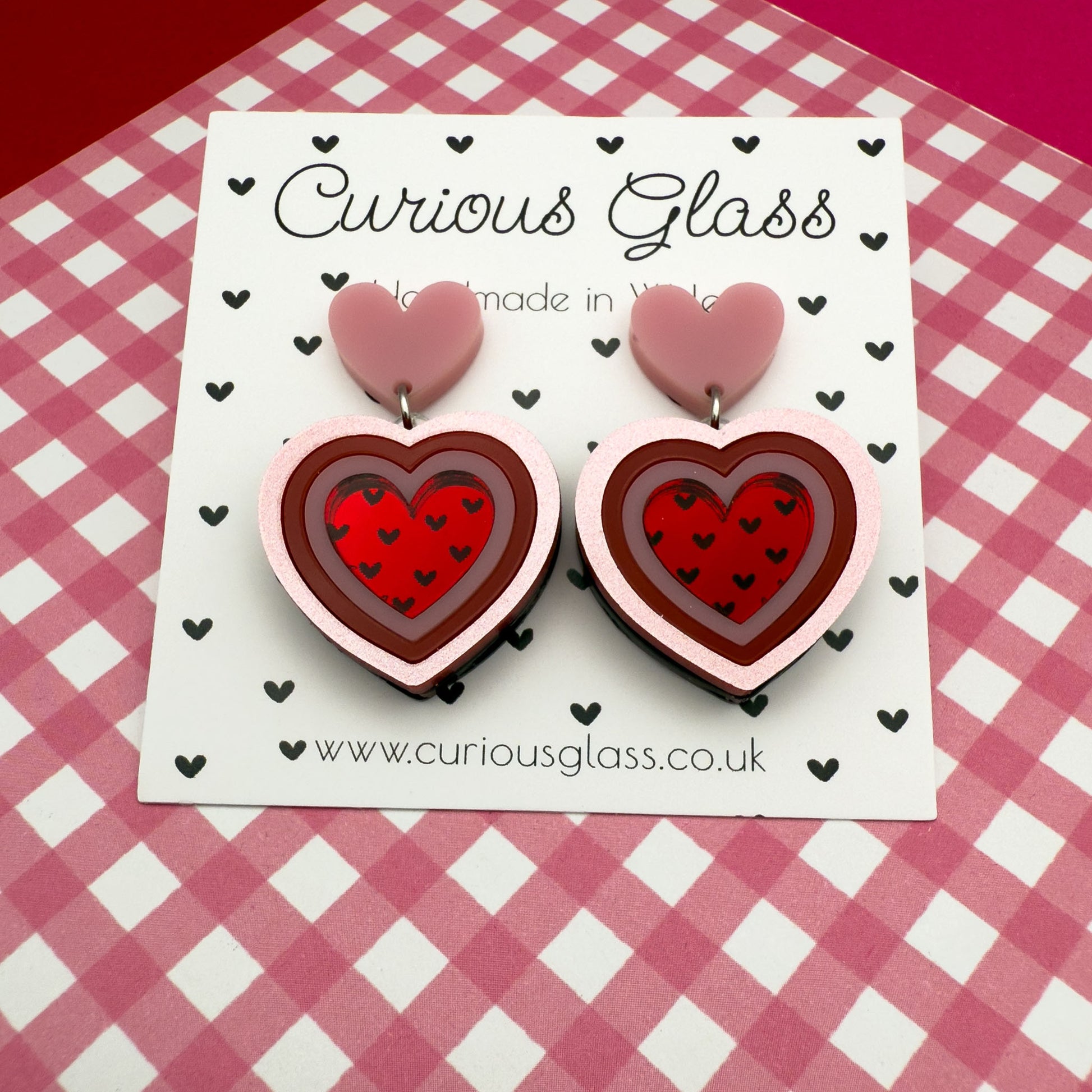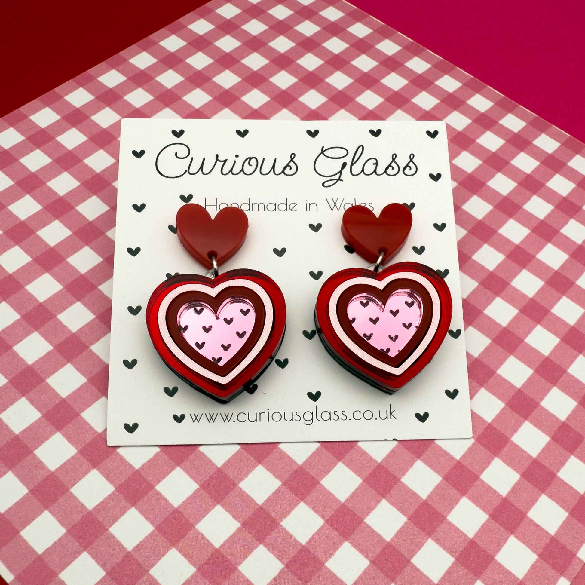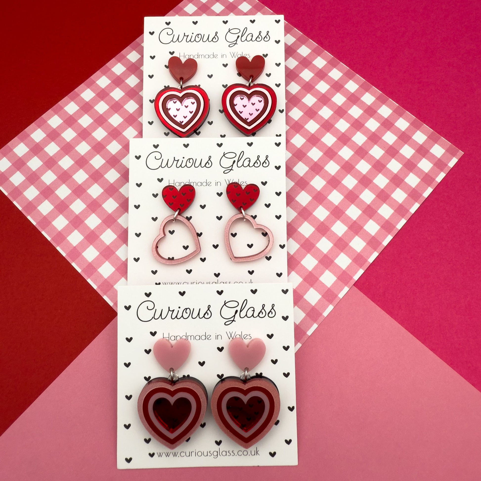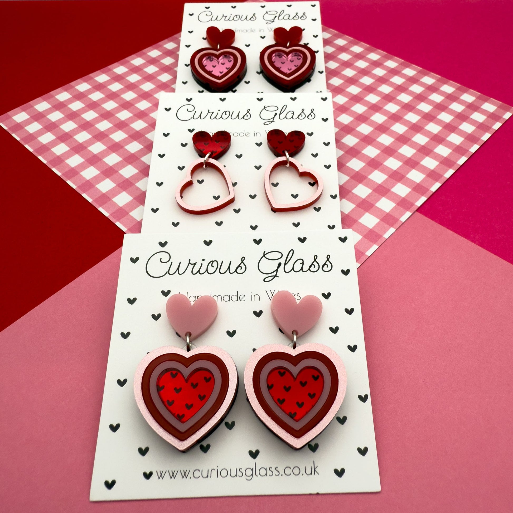 Introducing my limited collection of heart acrylic earrings—a heartfelt celebration of love in all the shades of red and pink! This range features a show-stopping design with a small heart at the top, leading to a larger heart made of concentric hearts, at the centre, a stunning mirror acrylic heart steals the spotlight with a delicately etched heart design for an extra touch of romance.