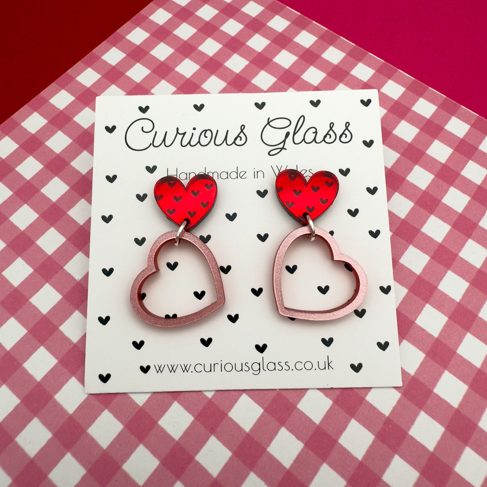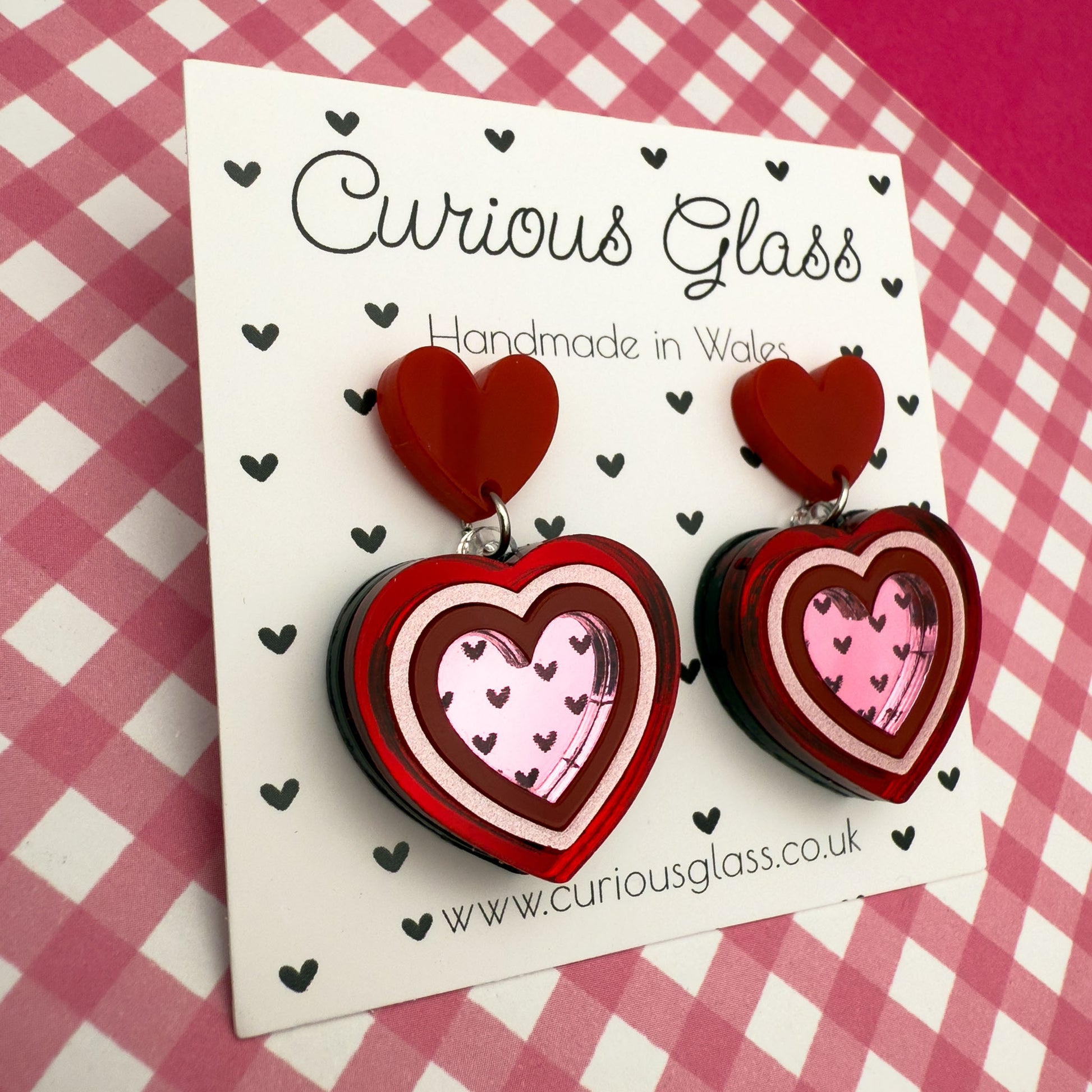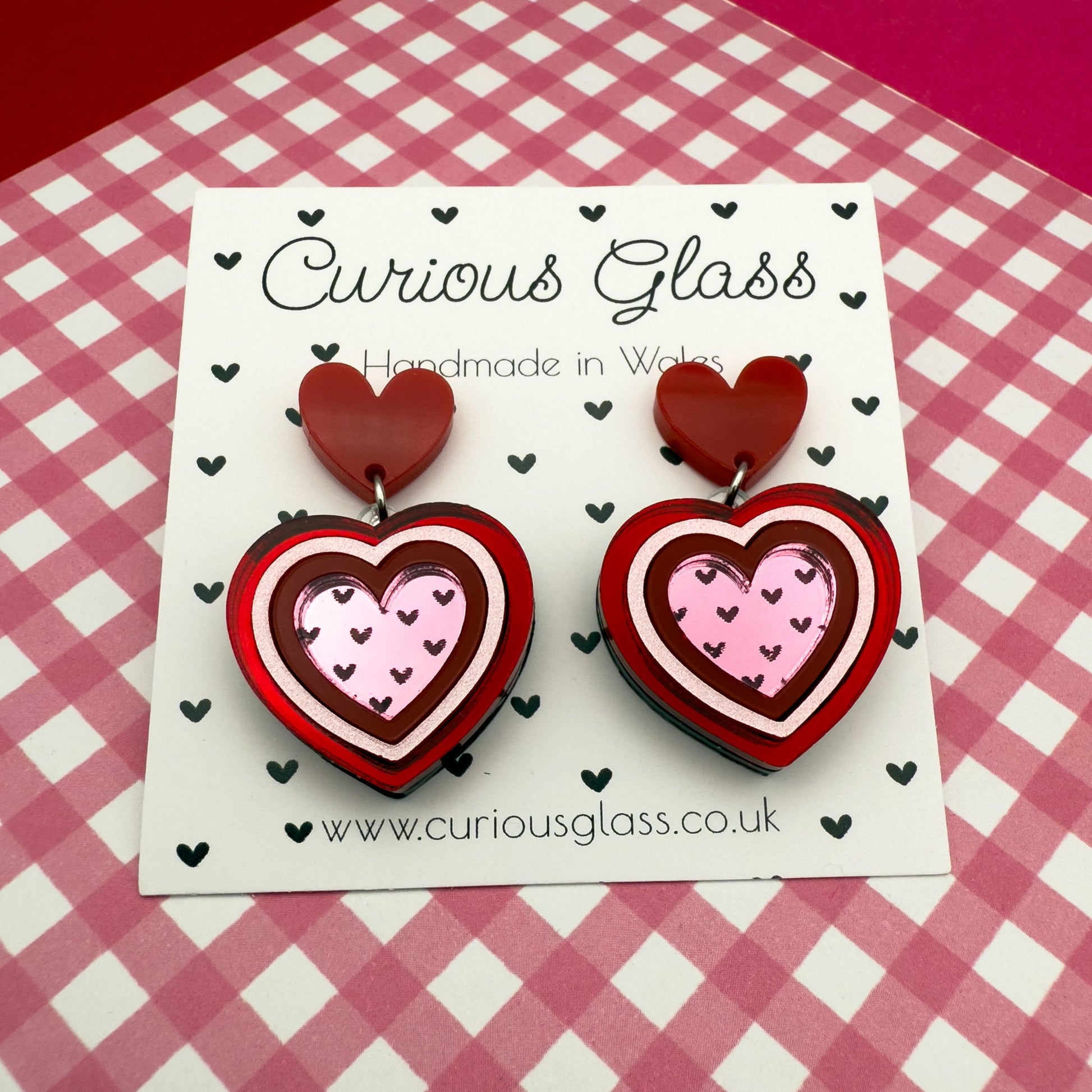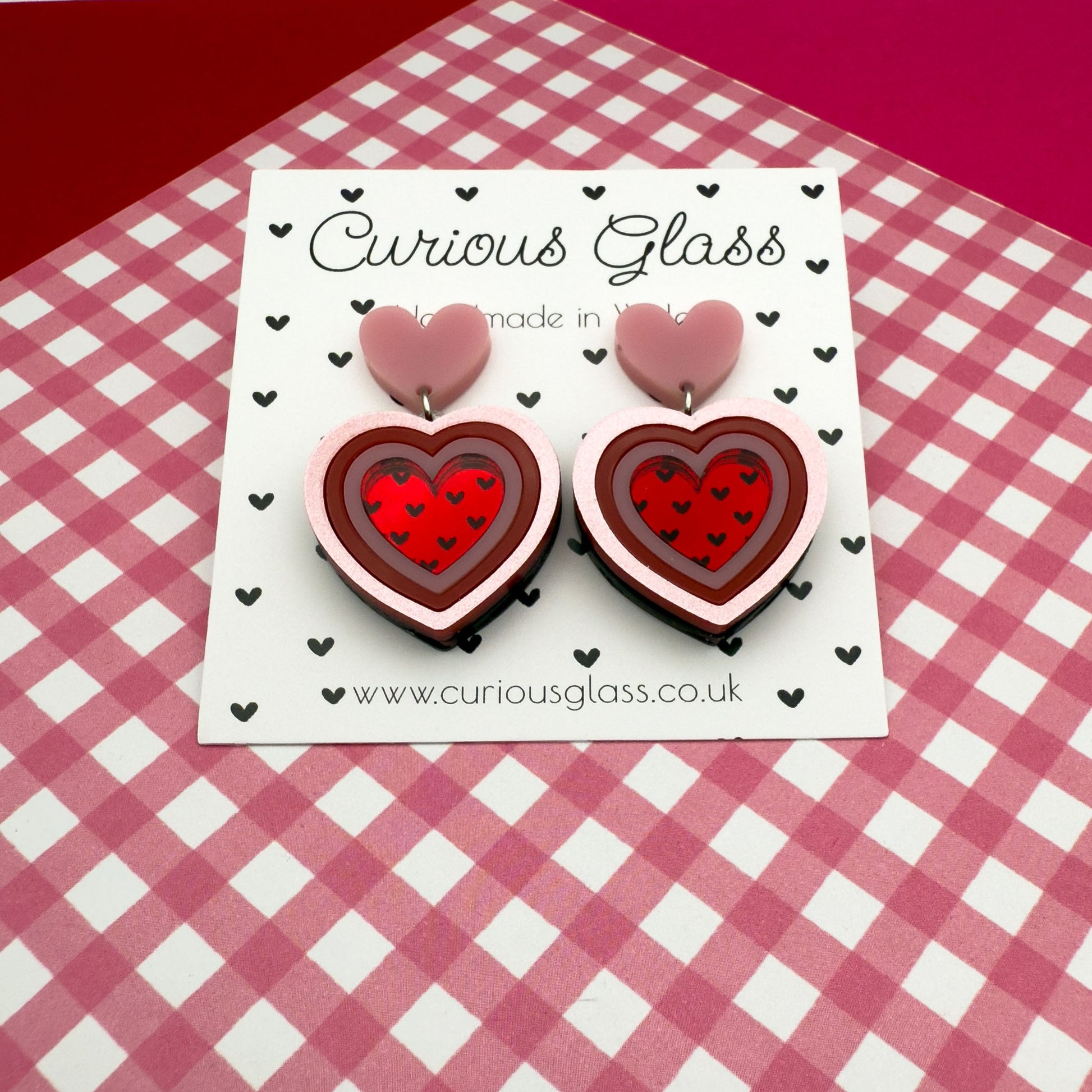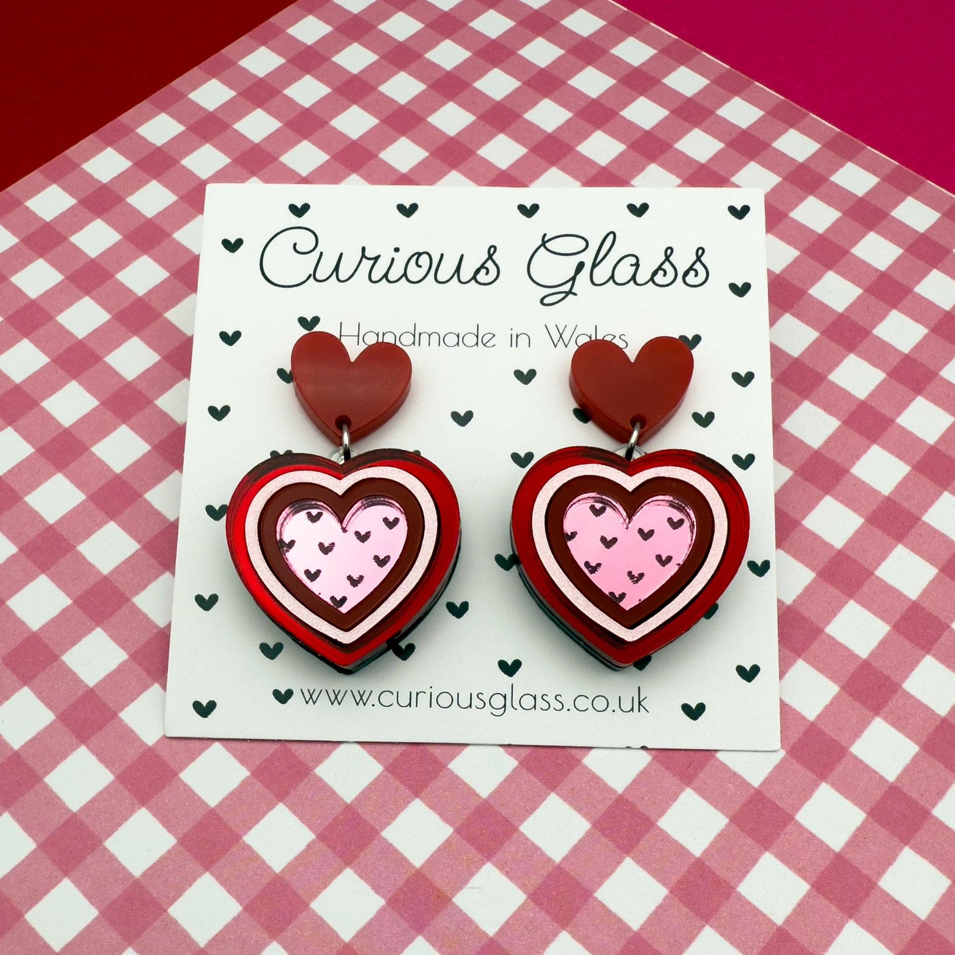 Introducing my limited collection of heart acrylic earrings—a heartfelt celebration of love in all the shades of red and pink! This range features a show-stopping design with a small heart at the top, leading to a larger heart made of concentric hearts, at the centre, a stunning mirror acrylic heart steals the spotlight with a delicately etched heart design for an extra touch of romance.