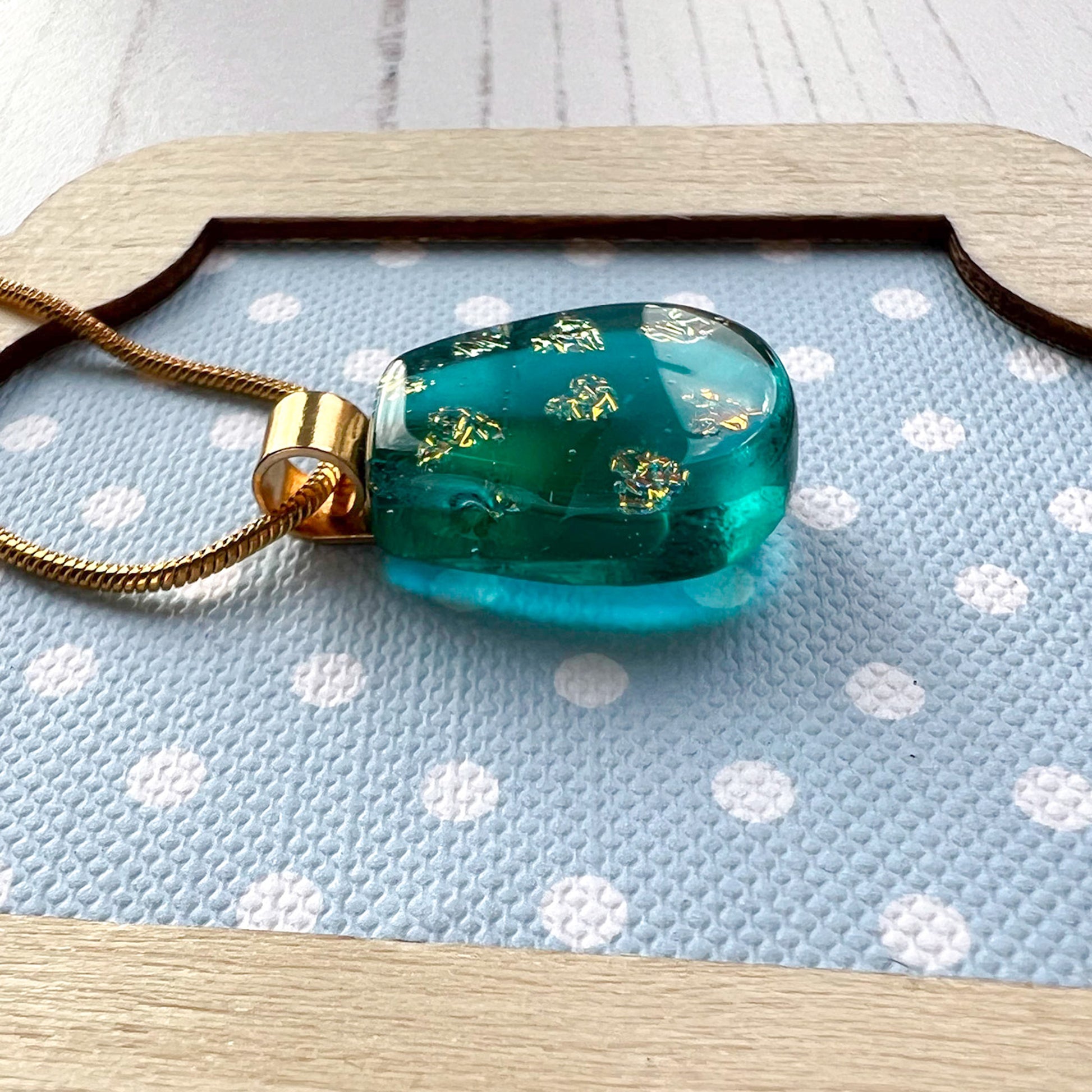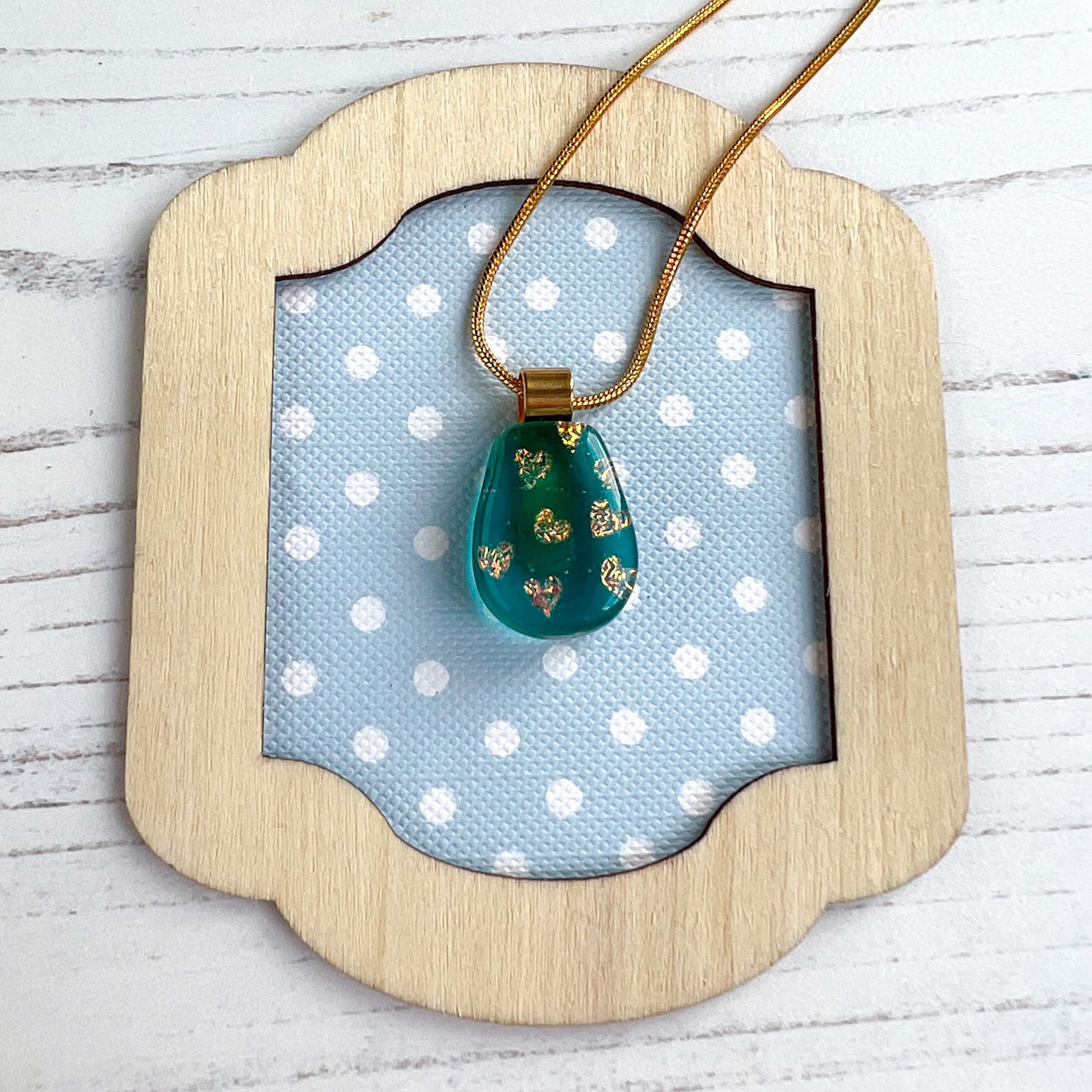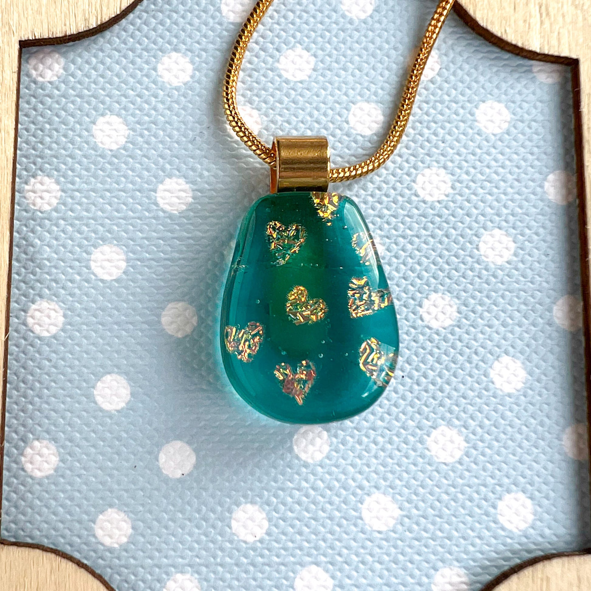 I made this necklace with a base of translucent green and I layered over the top a copper heart dichroic glass. I shaped it into a teardrop.