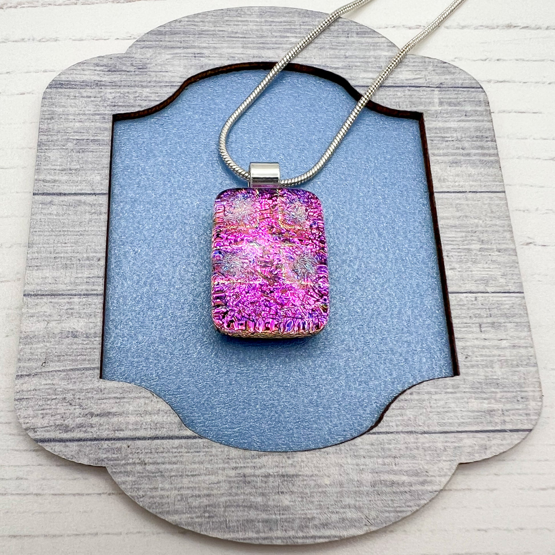 This ingénue pink squares necklace is in dichroic glass. It is a handmade necklace for the princess in all of us!
