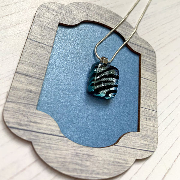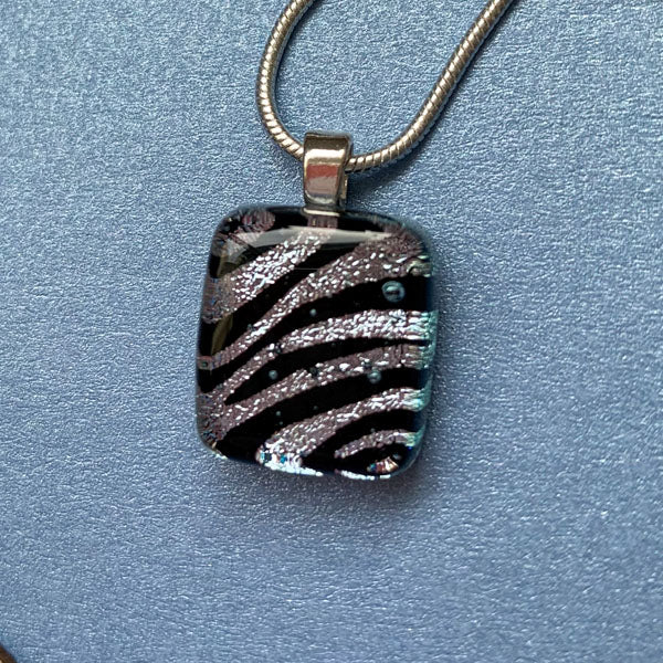 I made this necklace with a base of dark purple glass. I then layered some silver zebra dichroic glass over the top and shaped it into a little rectangle.