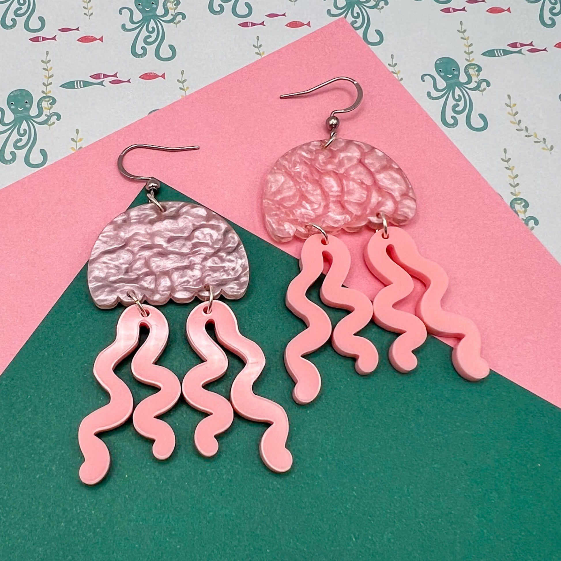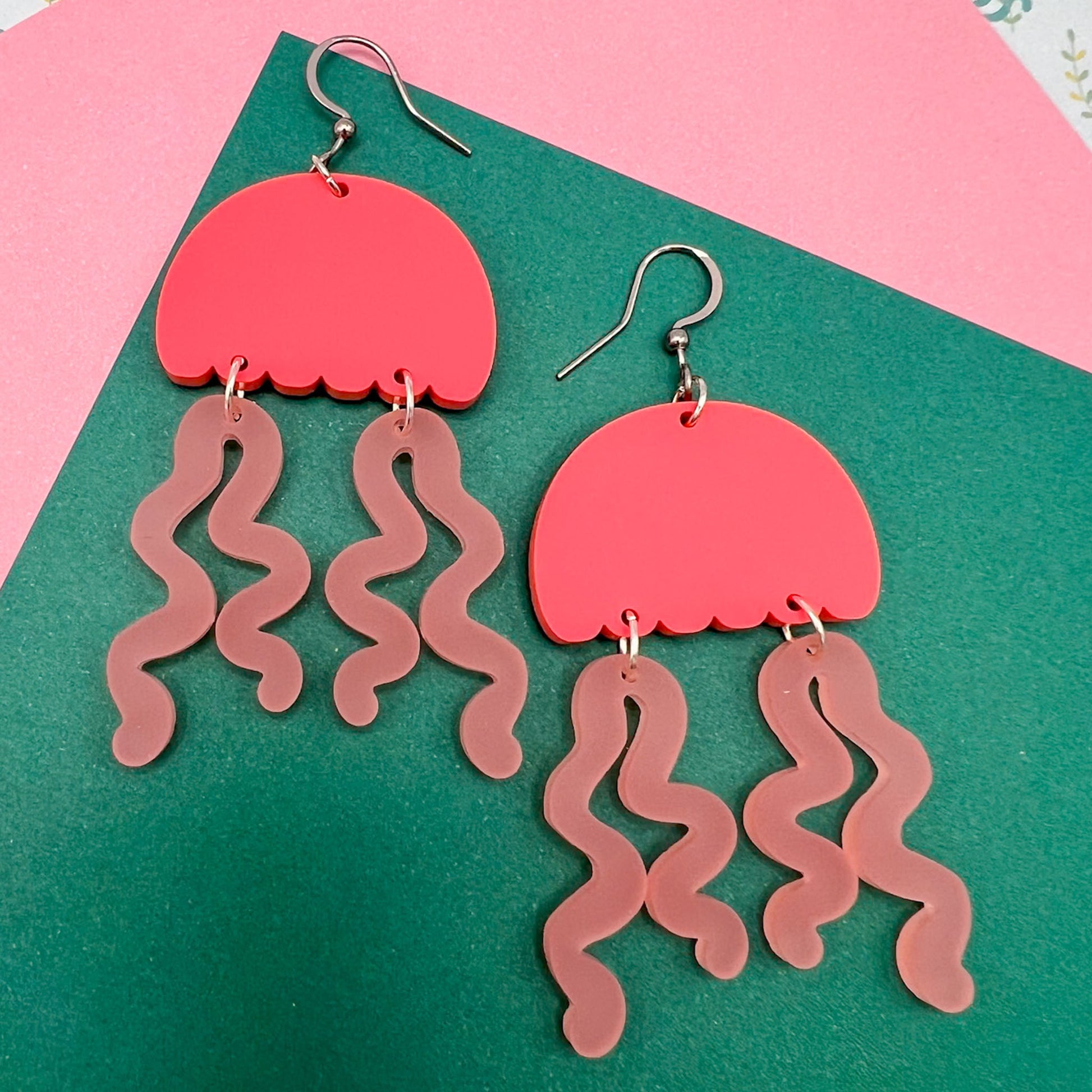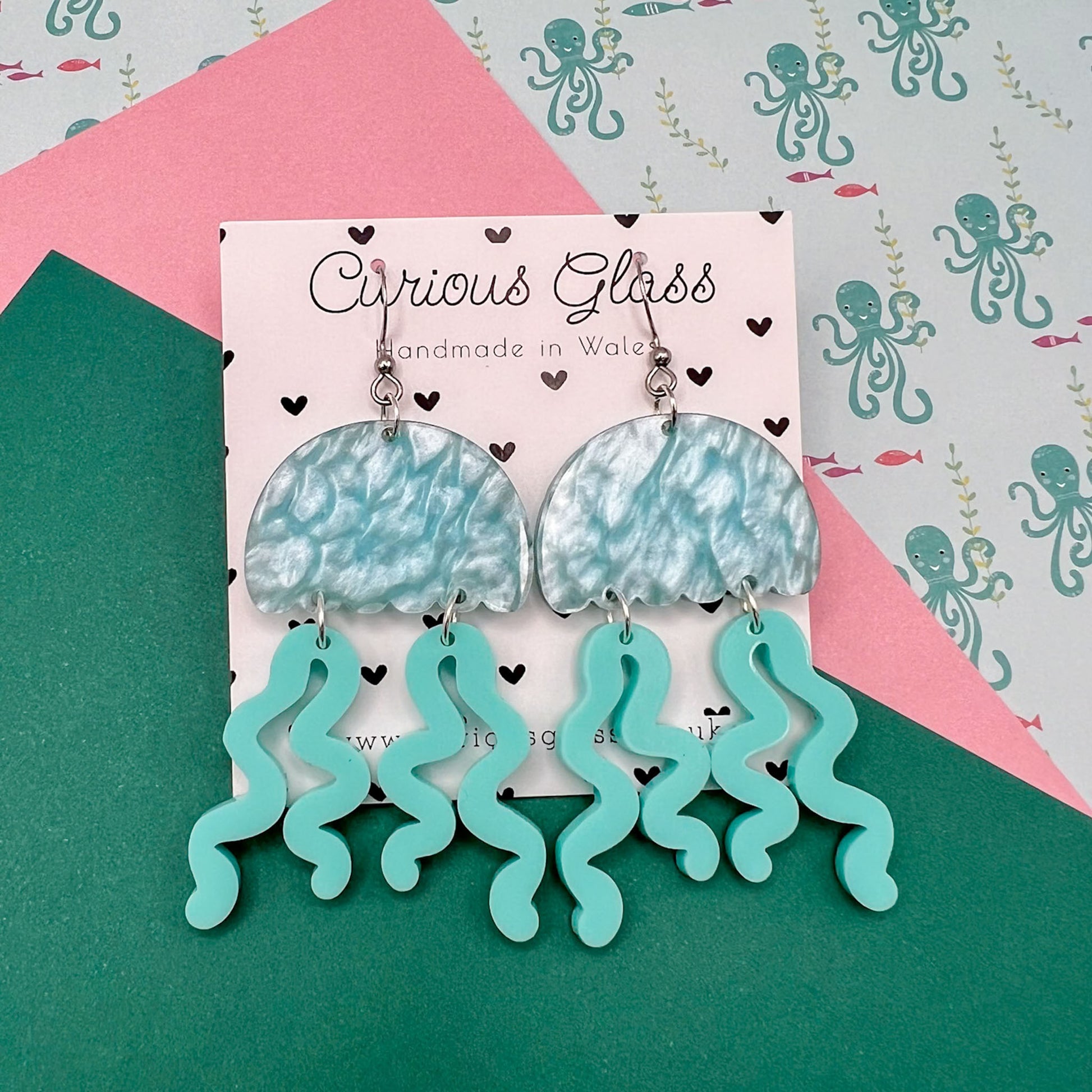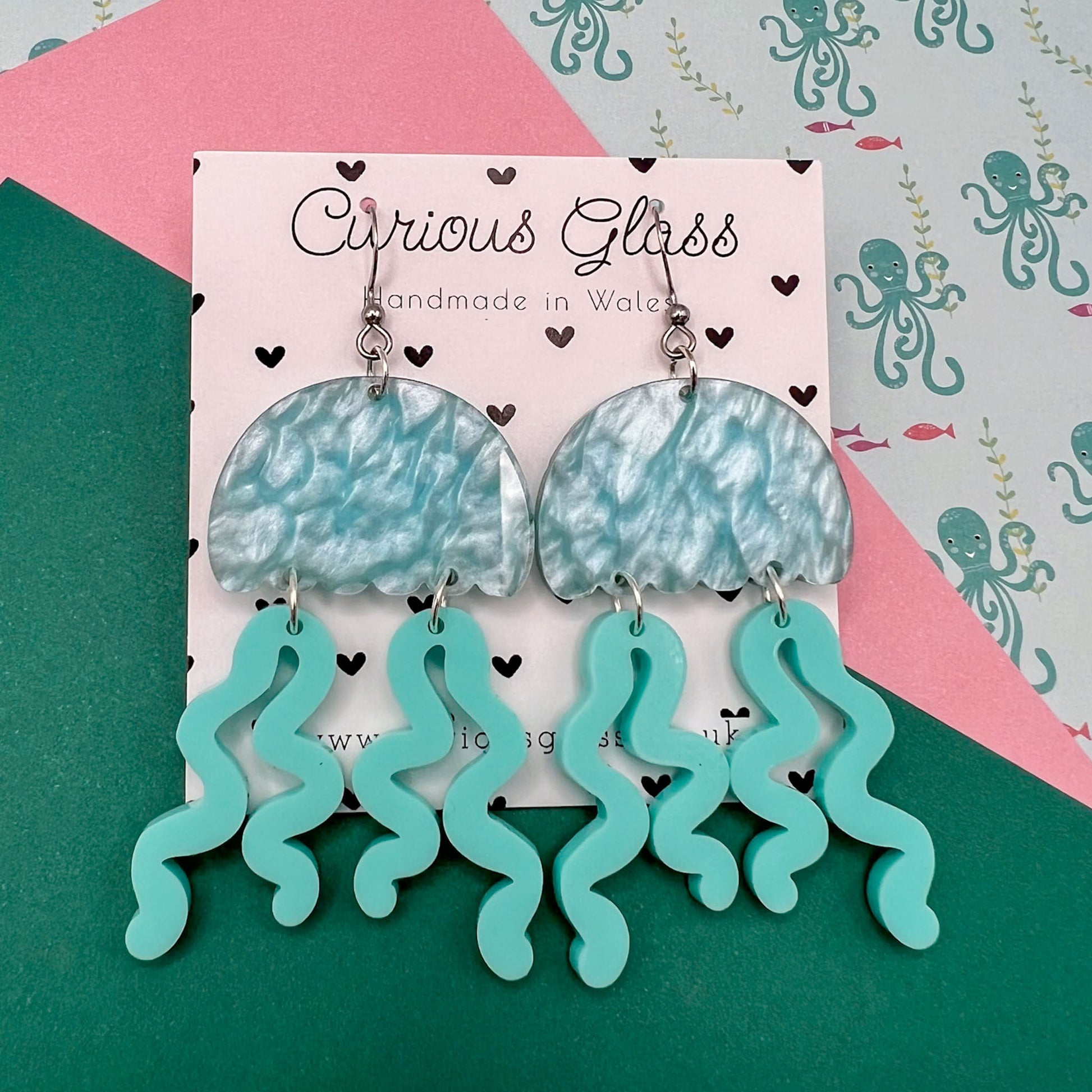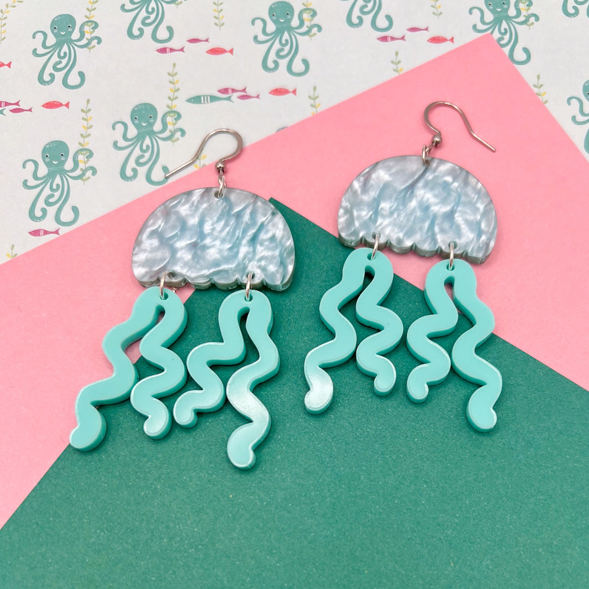 These stunning handmade acrylic earrings are inspired by the graceful movement of jellyfish, bringing the beauty of the ocean to life. Some of the earrings feature intricately designed jellyfish bodies, crafted from translucent acrylic that captures light in a mesmerizing way. What makes them truly unique is the delicate tentacles, which move fluidly with every turn of your head, mimicking the gentle drift of jellyfish in the sea. Lightweight and comfortable, these earrings offer a captivating, dynamic look that feels like a dance of the ocean.