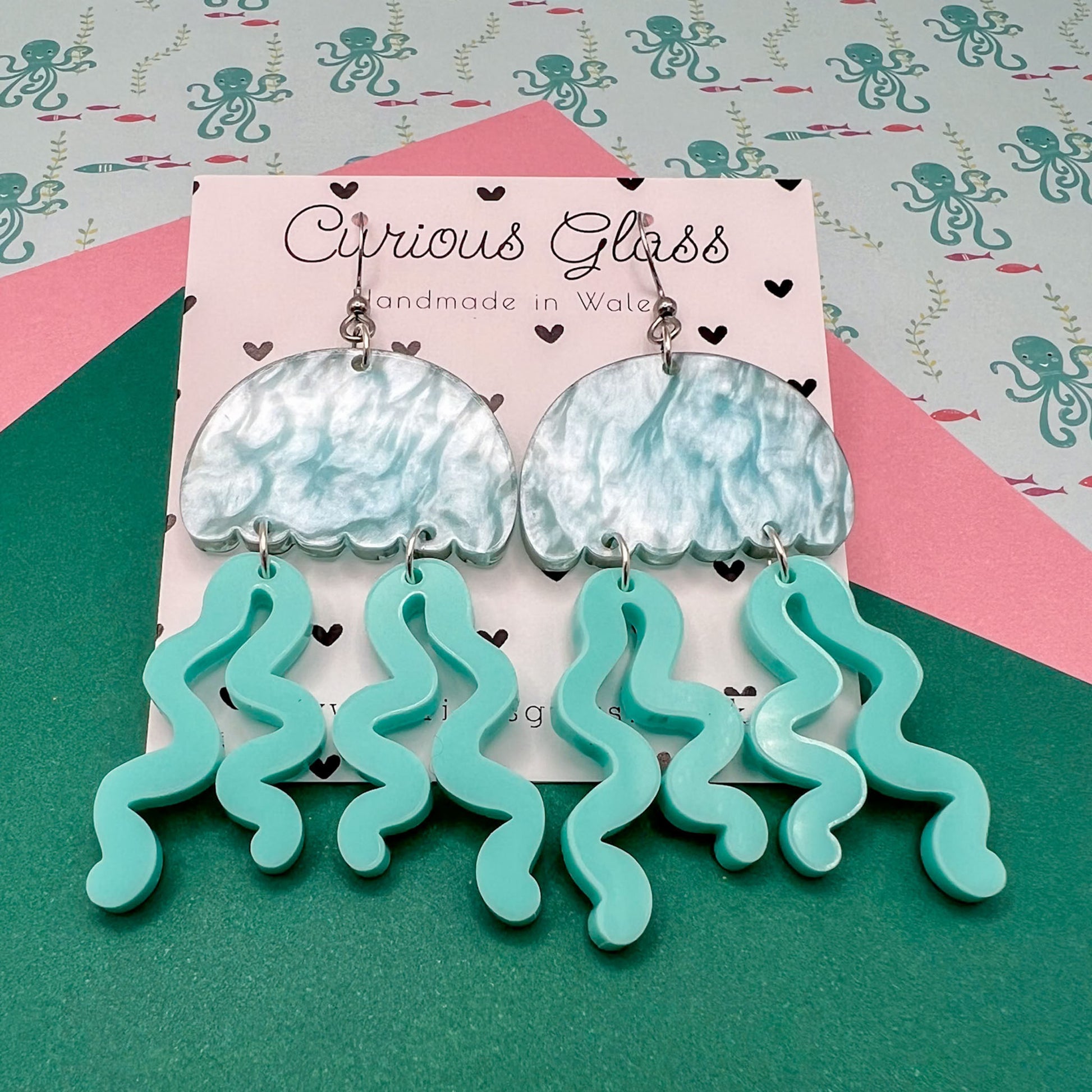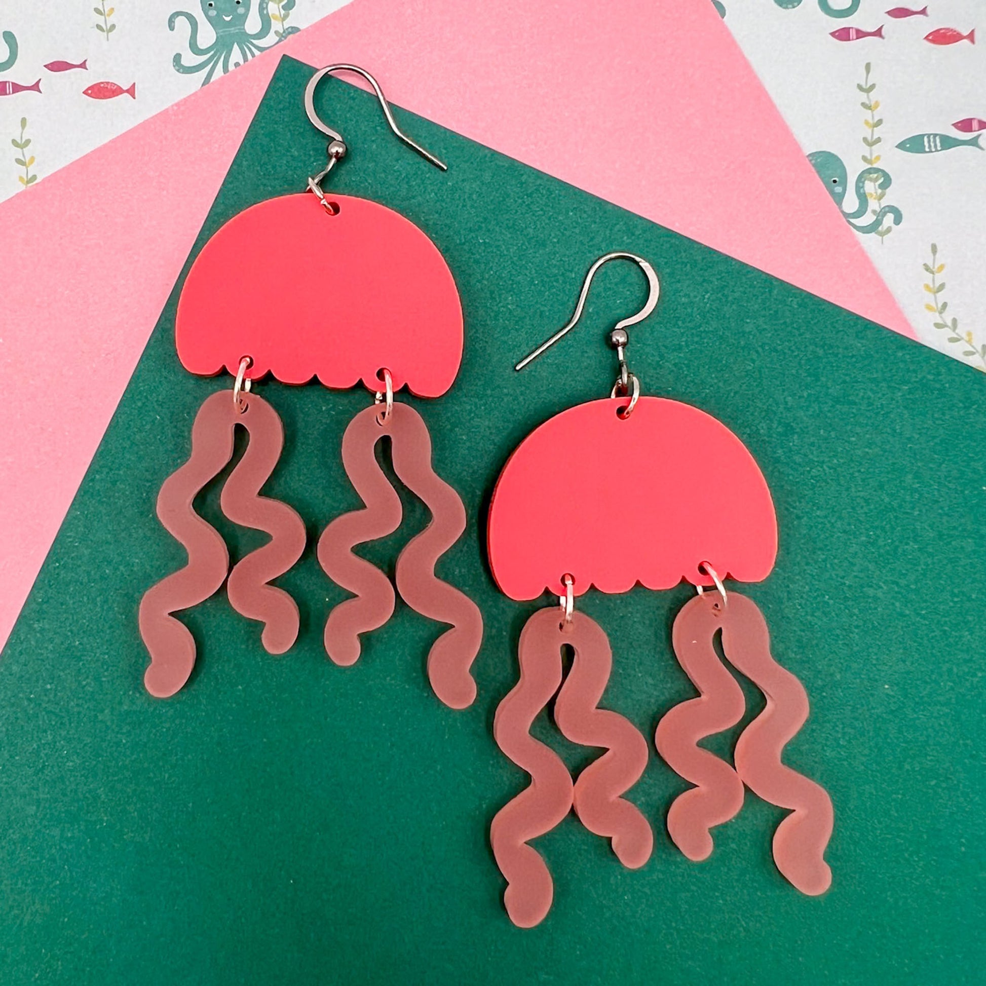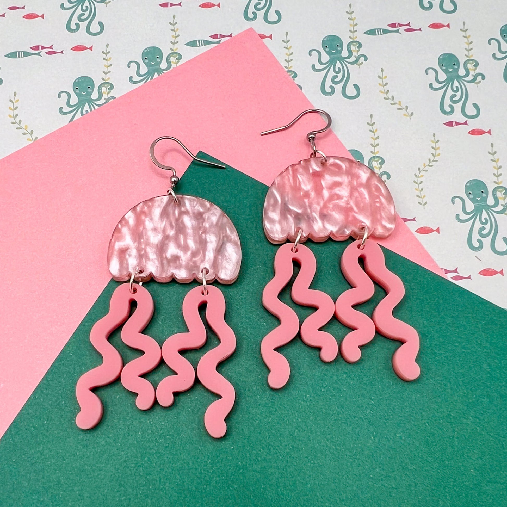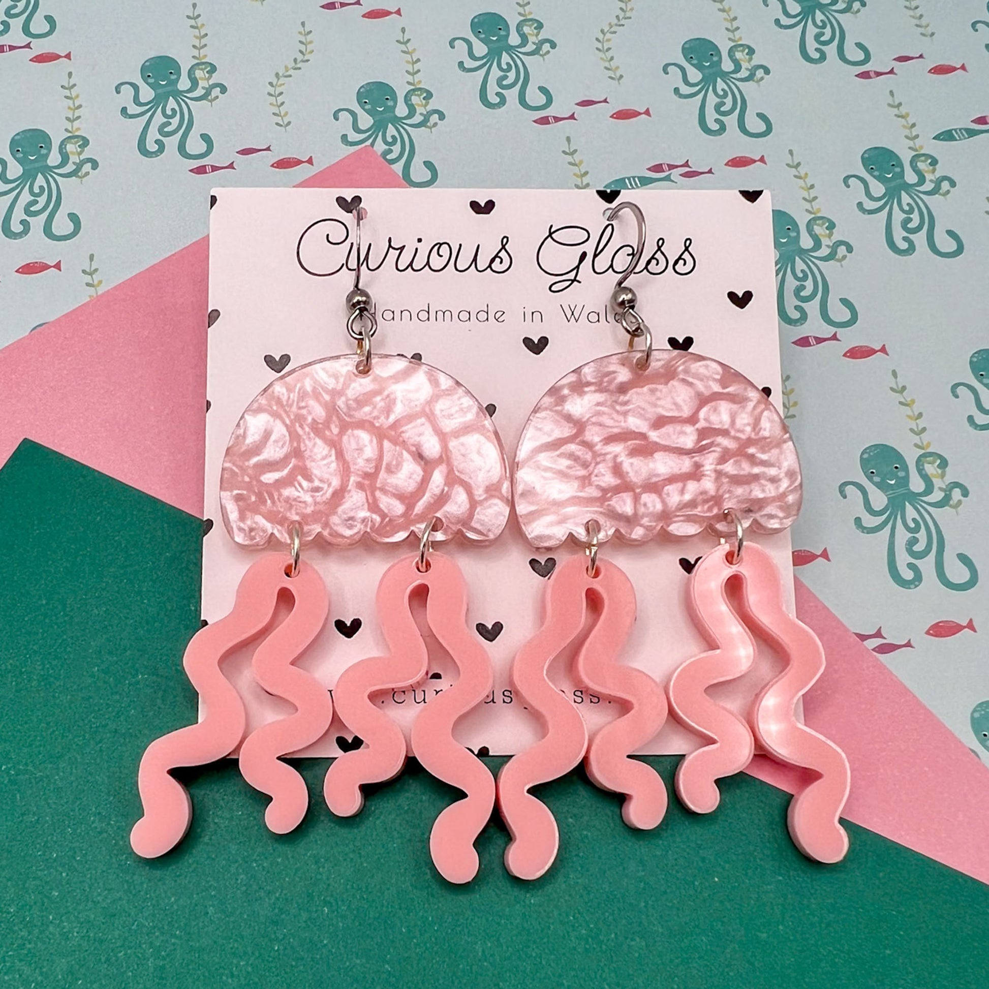 These stunning handmade acrylic earrings are inspired by the graceful movement of jellyfish, bringing the beauty of the ocean to life. Some of the earrings feature intricately designed jellyfish bodies, crafted from translucent acrylic that captures light in a mesmerizing way. What makes them truly unique is the delicate tentacles, which move fluidly with every turn of your head, mimicking the gentle drift of jellyfish in the sea. Lightweight and comfortable, these earrings offer a captivating, dynamic look that feels like a dance of the ocean.