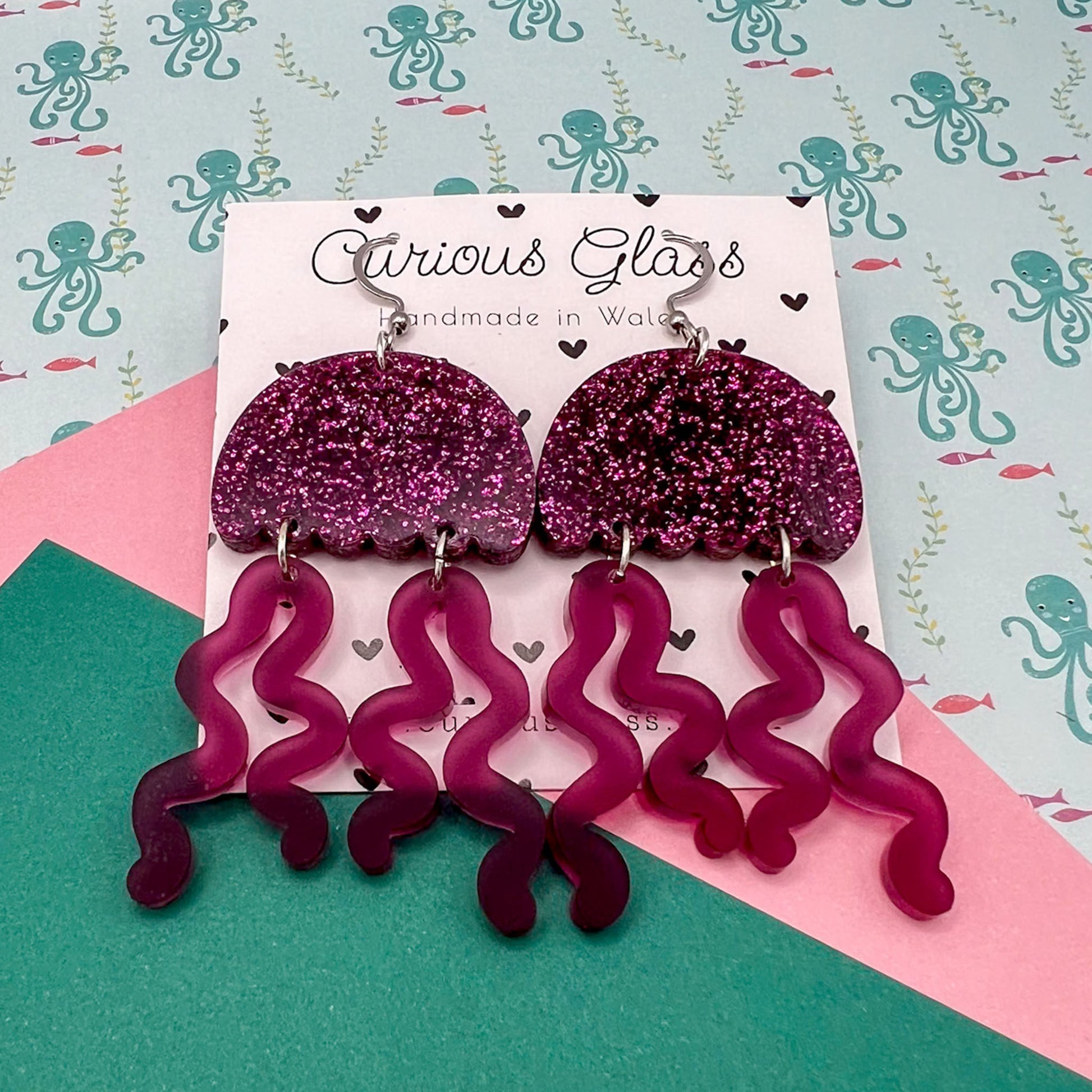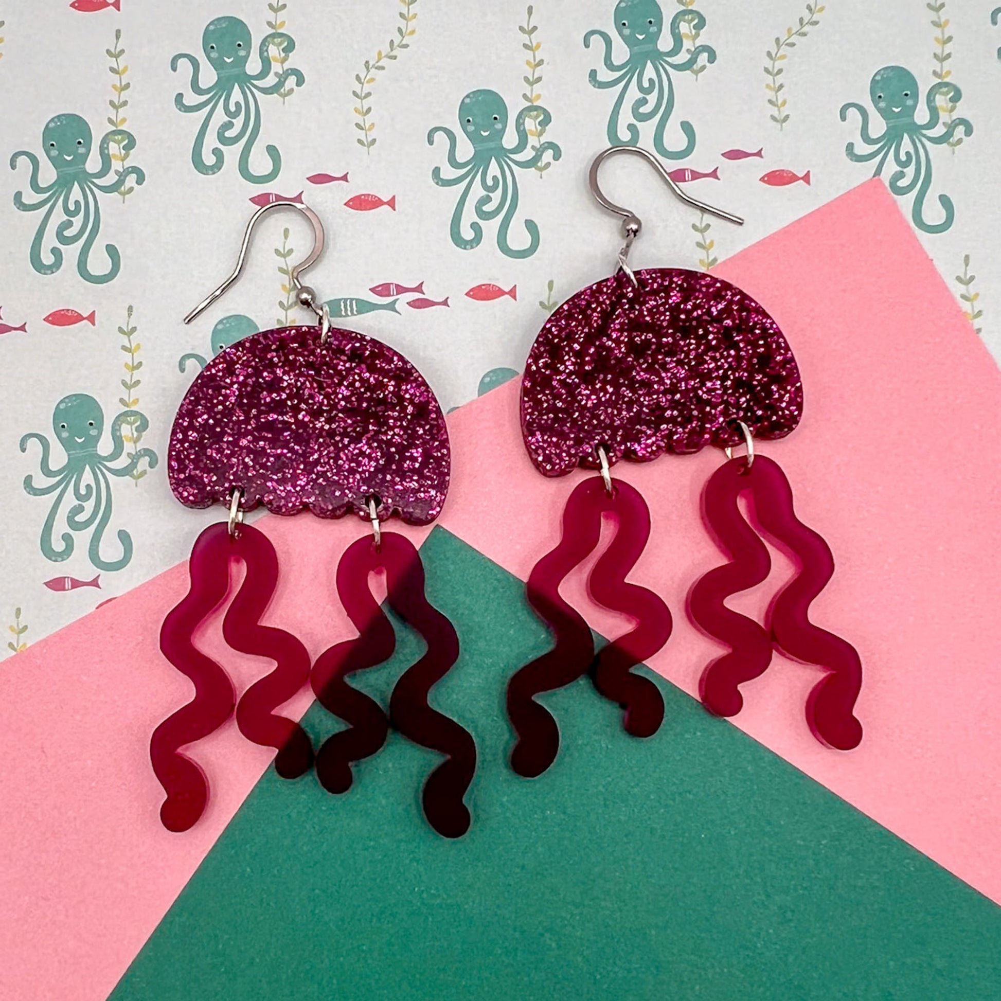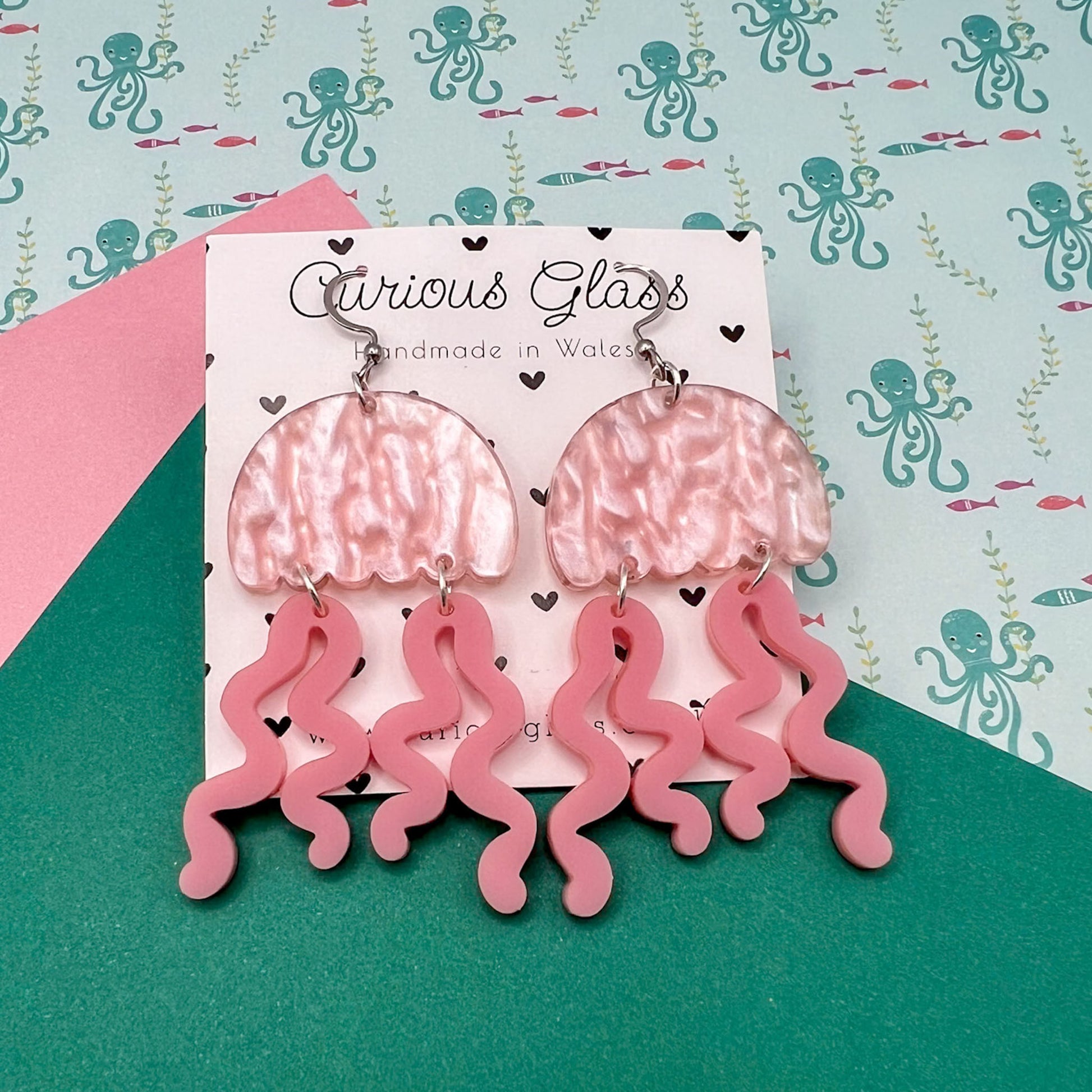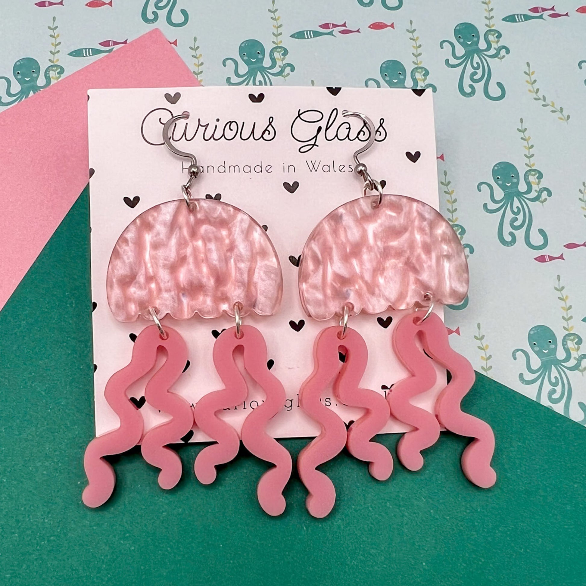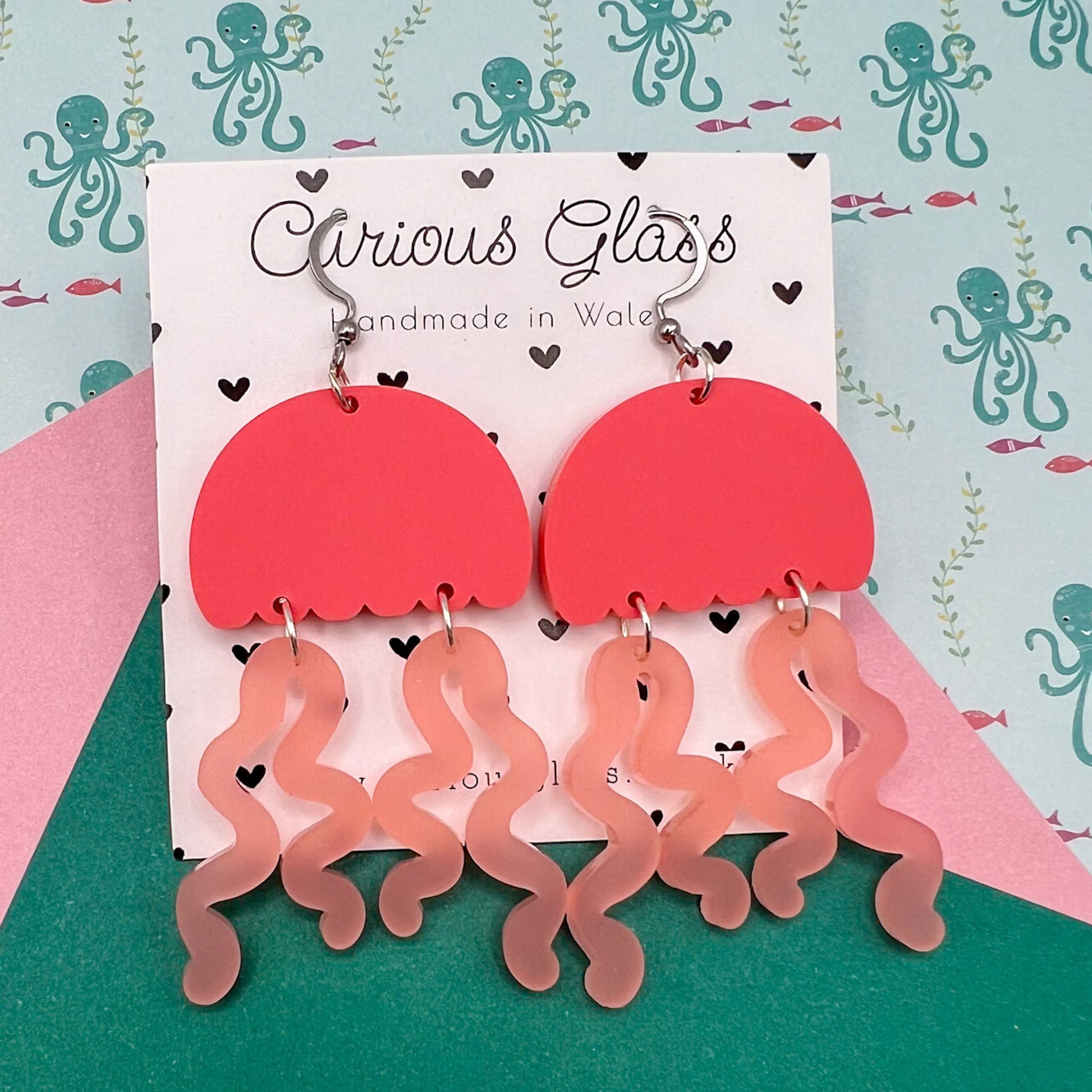 These stunning handmade acrylic earrings are inspired by the graceful movement of jellyfish, bringing the beauty of the ocean to life. Some of the earrings feature intricately designed jellyfish bodies, crafted from translucent acrylic that captures light in a mesmerizing way. What makes them truly unique is the delicate tentacles, which move fluidly with every turn of your head, mimicking the gentle drift of jellyfish in the sea. Lightweight and comfortable, these earrings offer a captivating, dynamic look that feels like a dance of the ocean.