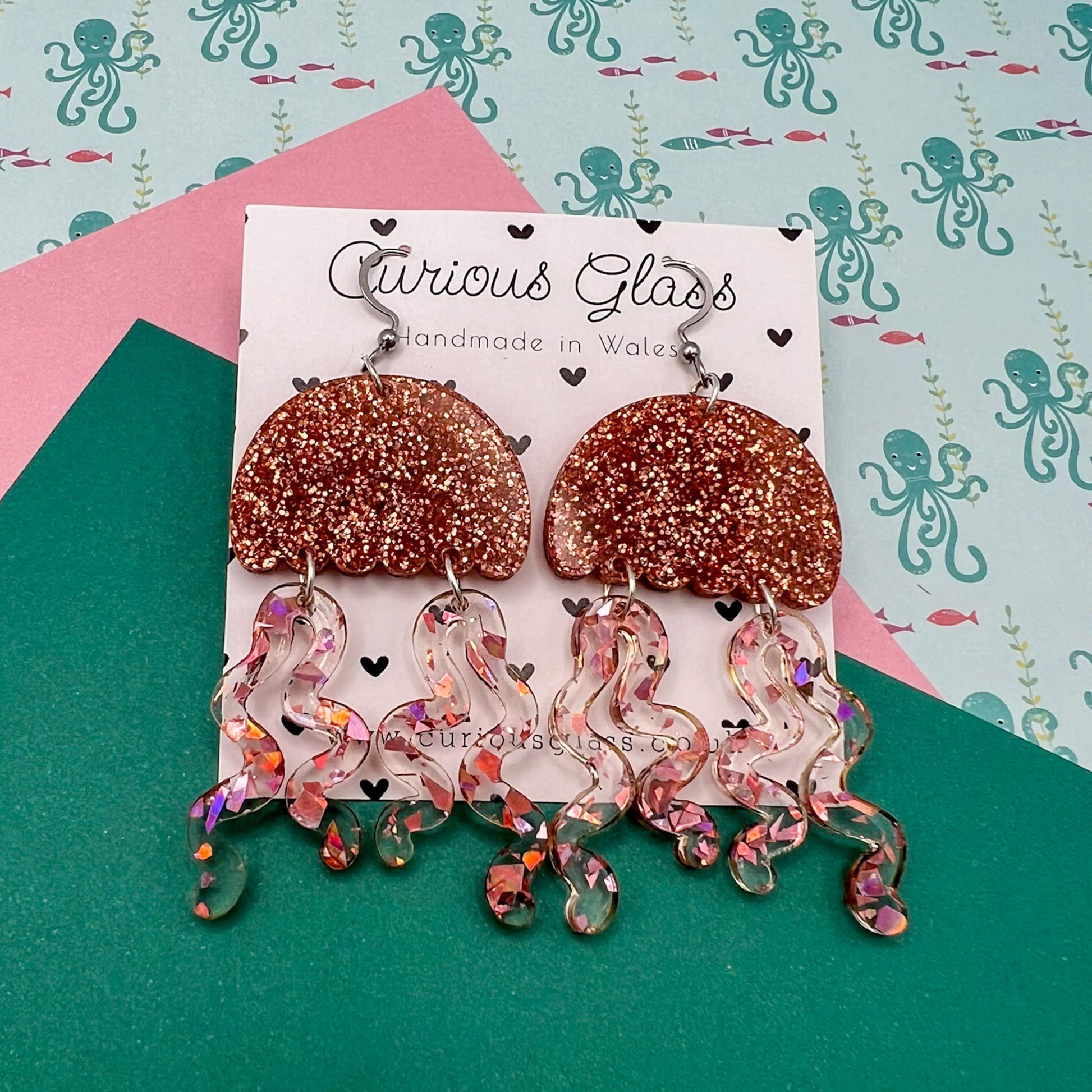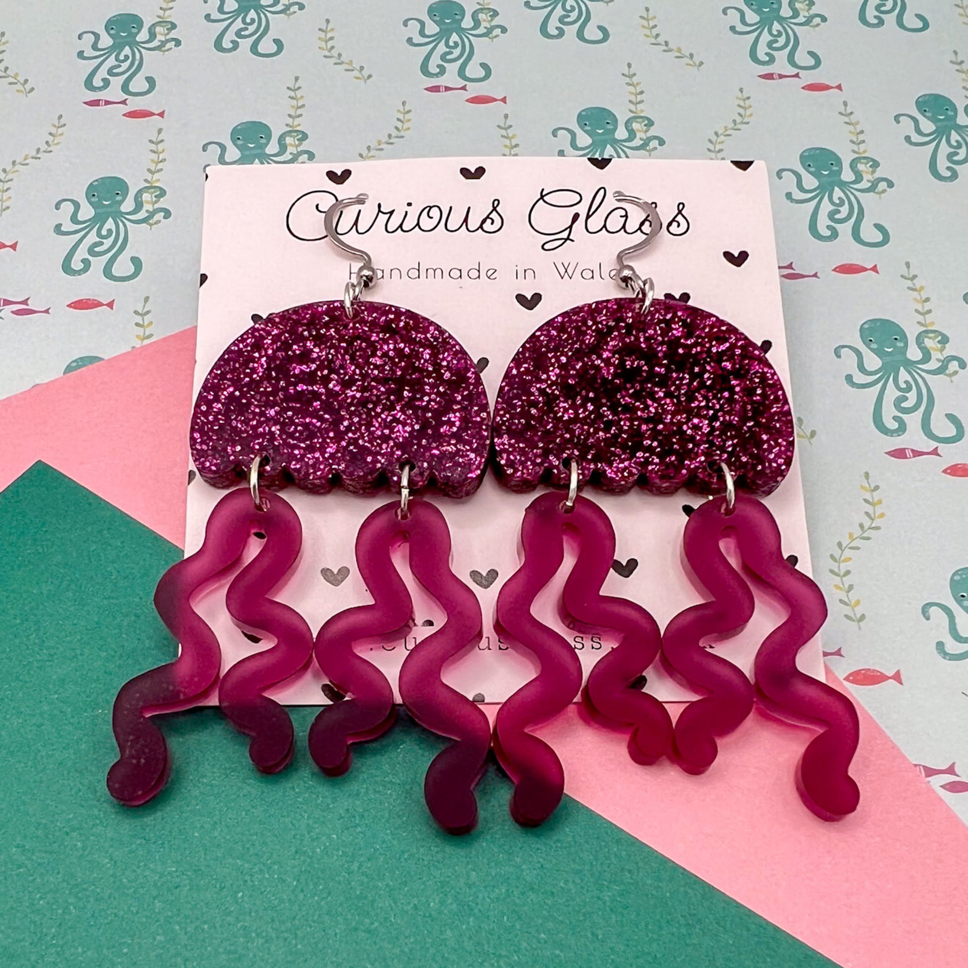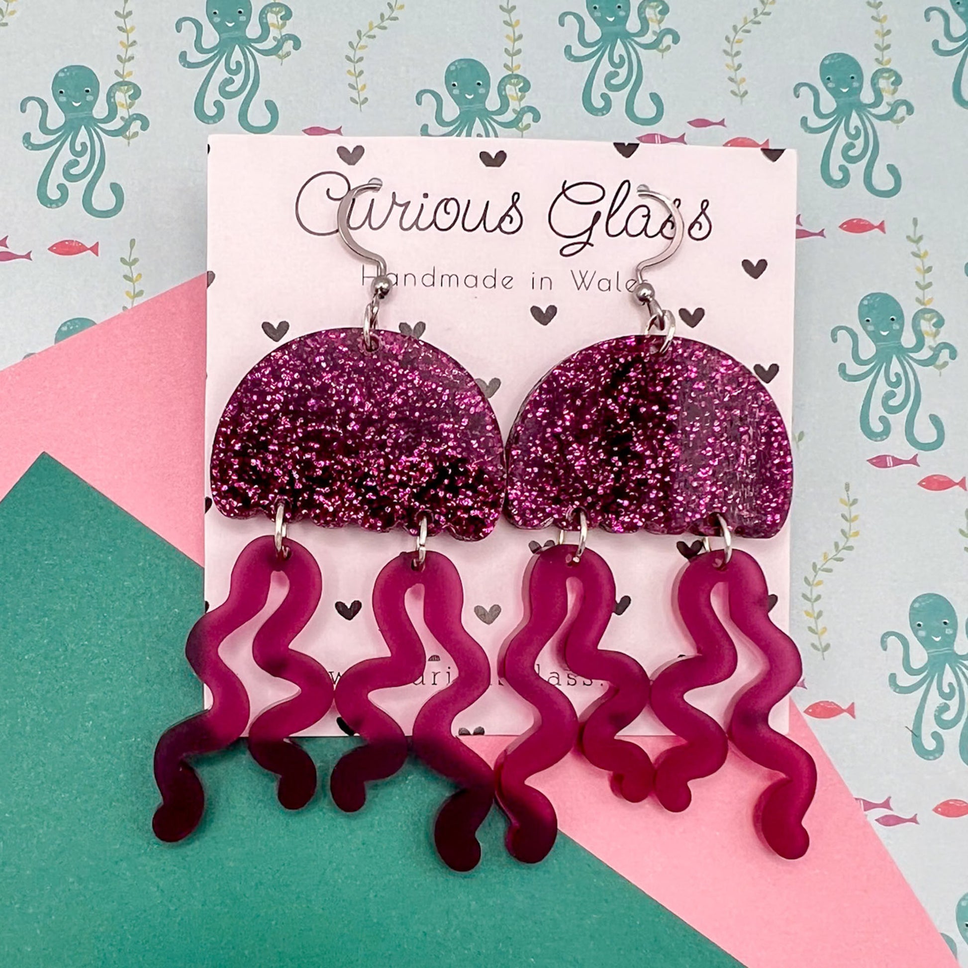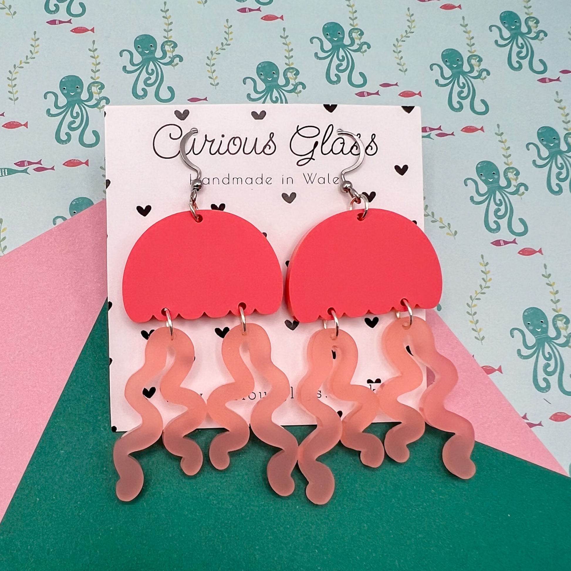 These stunning handmade acrylic earrings are inspired by the graceful movement of jellyfish, bringing the beauty of the ocean to life. Some of the earrings feature intricately designed jellyfish bodies, crafted from translucent acrylic that captures light in a mesmerizing way. What makes them truly unique is the delicate tentacles, which move fluidly with every turn of your head, mimicking the gentle drift of jellyfish in the sea. Lightweight and comfortable, these earrings offer a captivating, dynamic look that feels like a dance of the ocean.