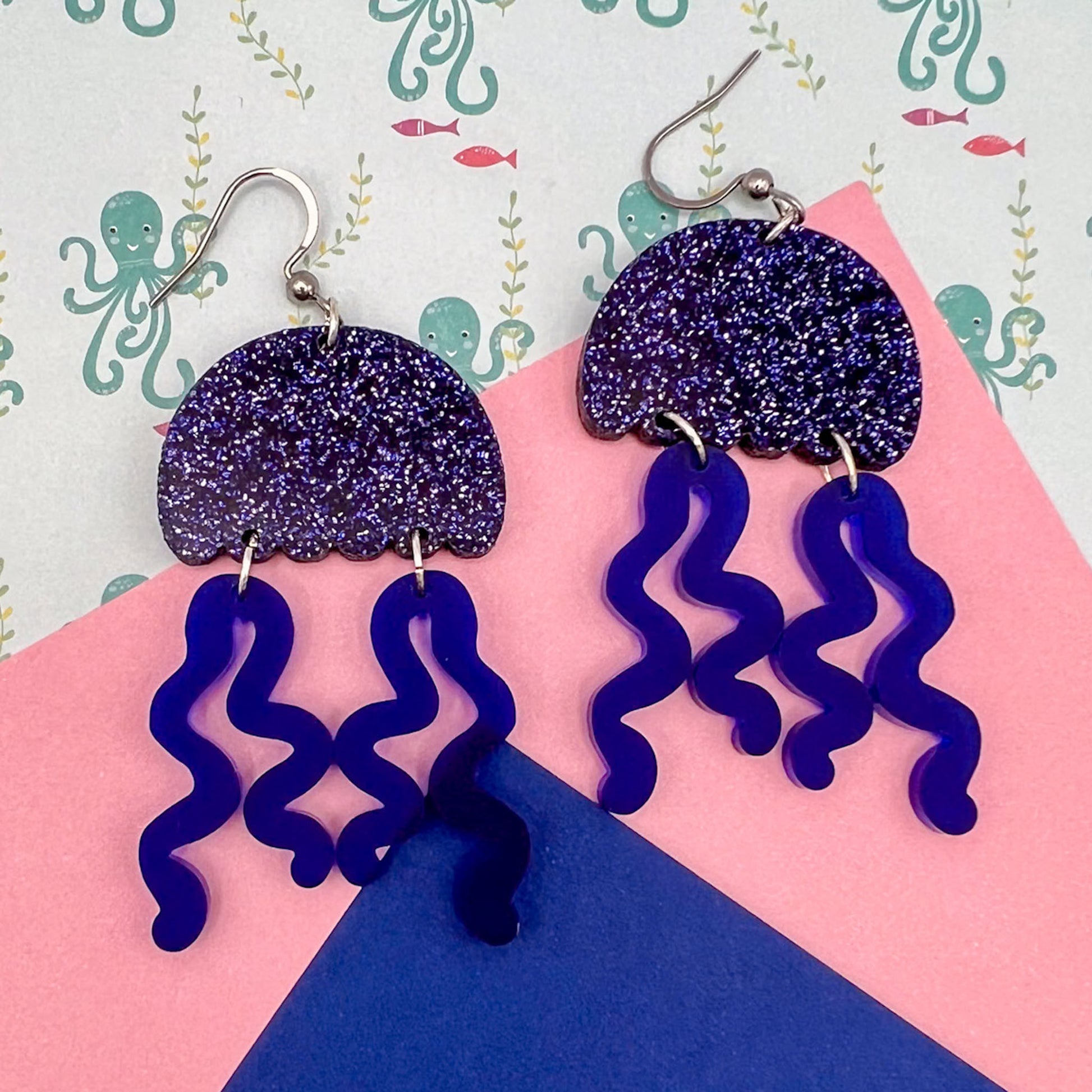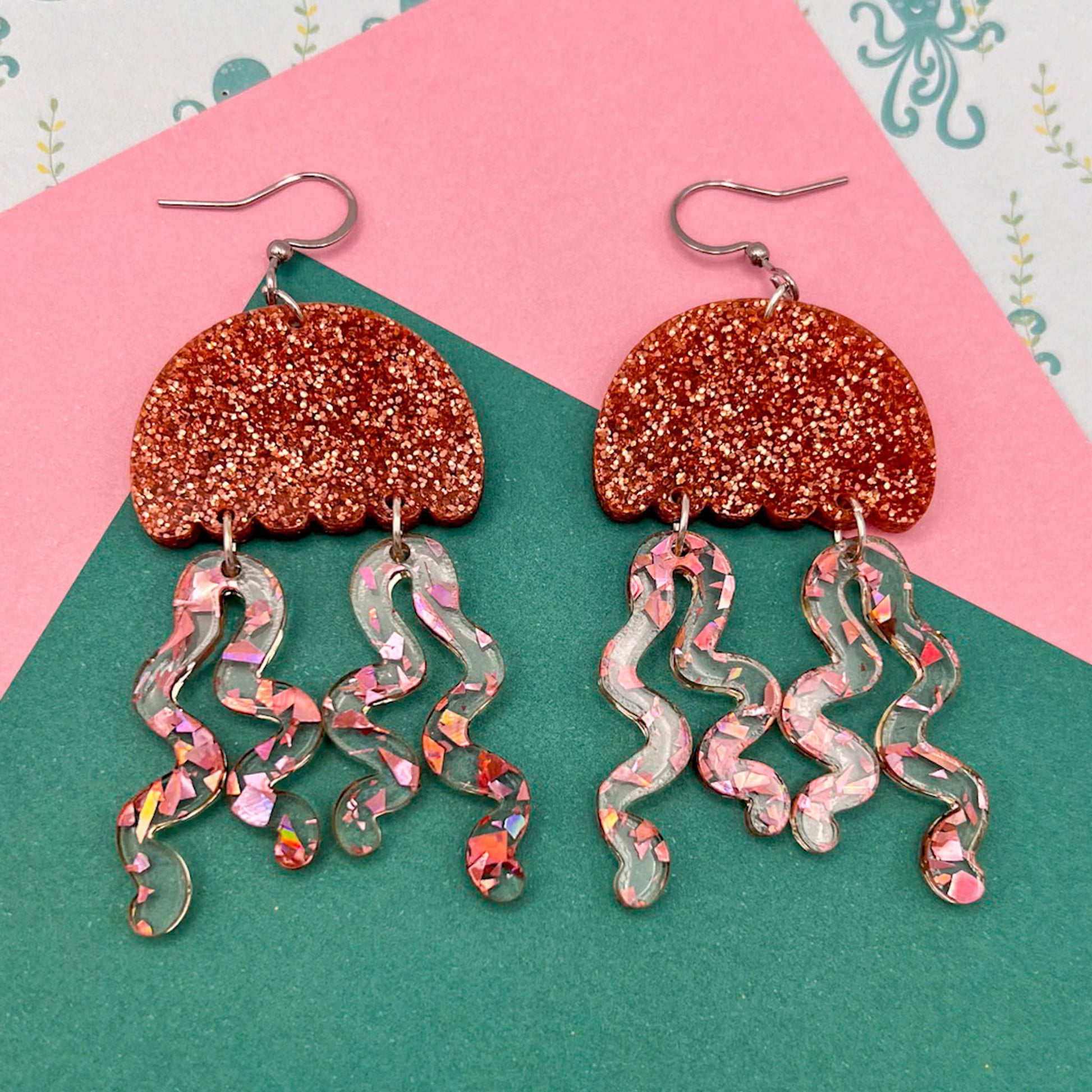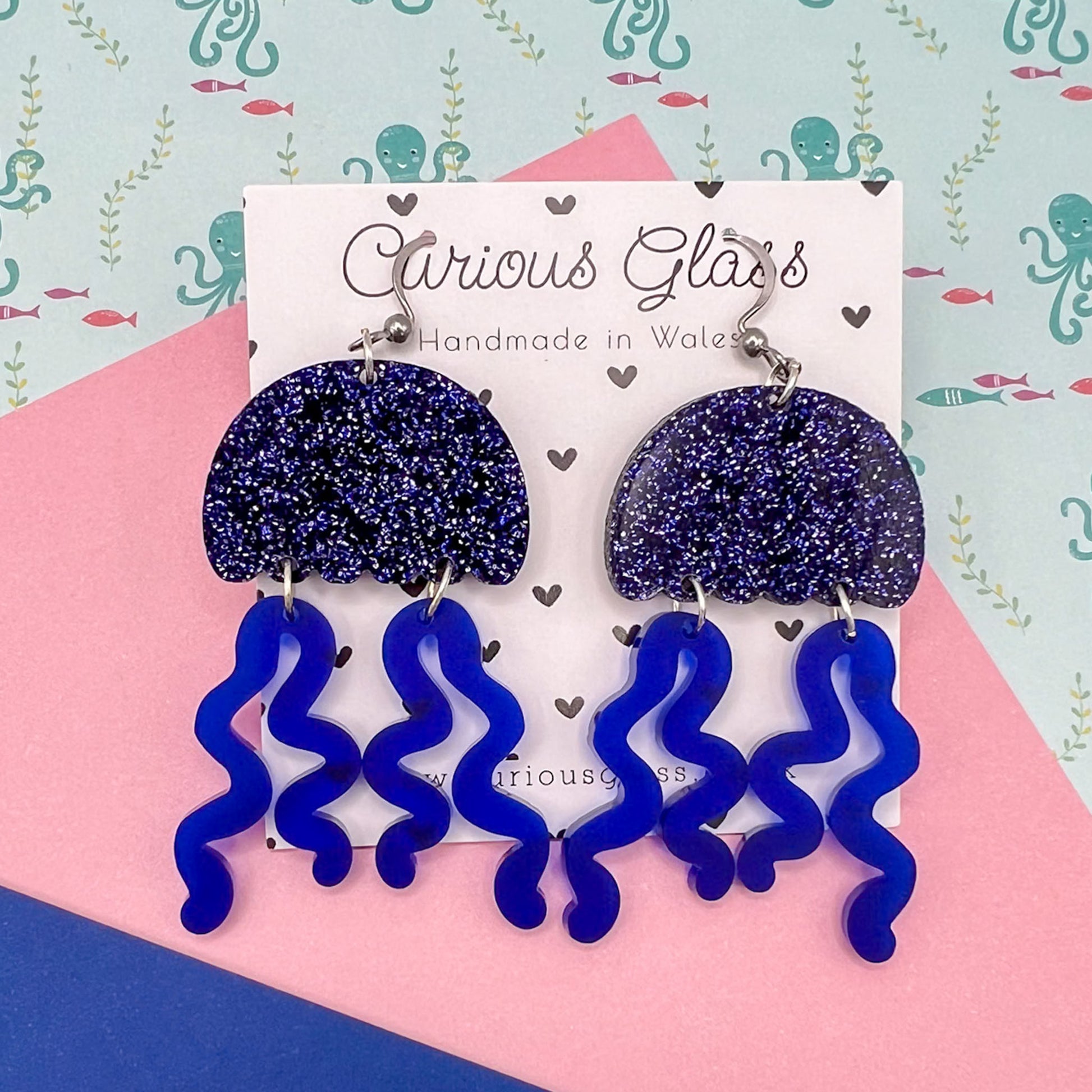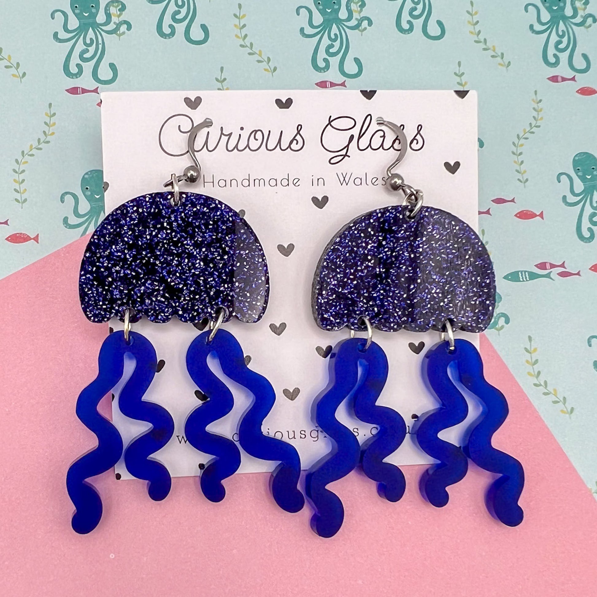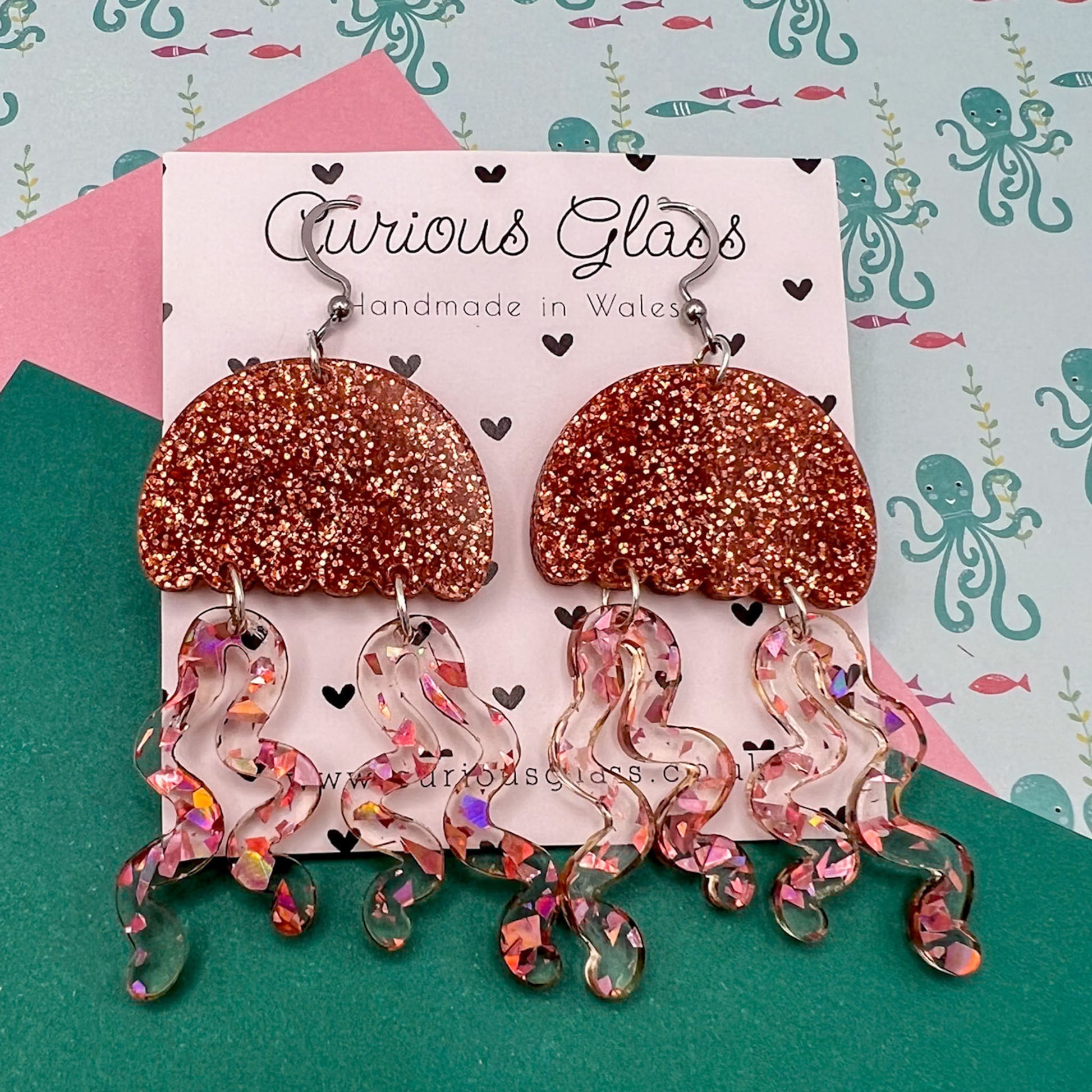 These stunning handmade acrylic earrings are inspired by the graceful movement of jellyfish, bringing the beauty of the ocean to life. Some of the earrings feature intricately designed jellyfish bodies, crafted from translucent acrylic that captures light in a mesmerizing way. What makes them truly unique is the delicate tentacles, which move fluidly with every turn of your head, mimicking the gentle drift of jellyfish in the sea. Lightweight and comfortable, these earrings offer a captivating, dynamic look that feels like a dance of the ocean.
