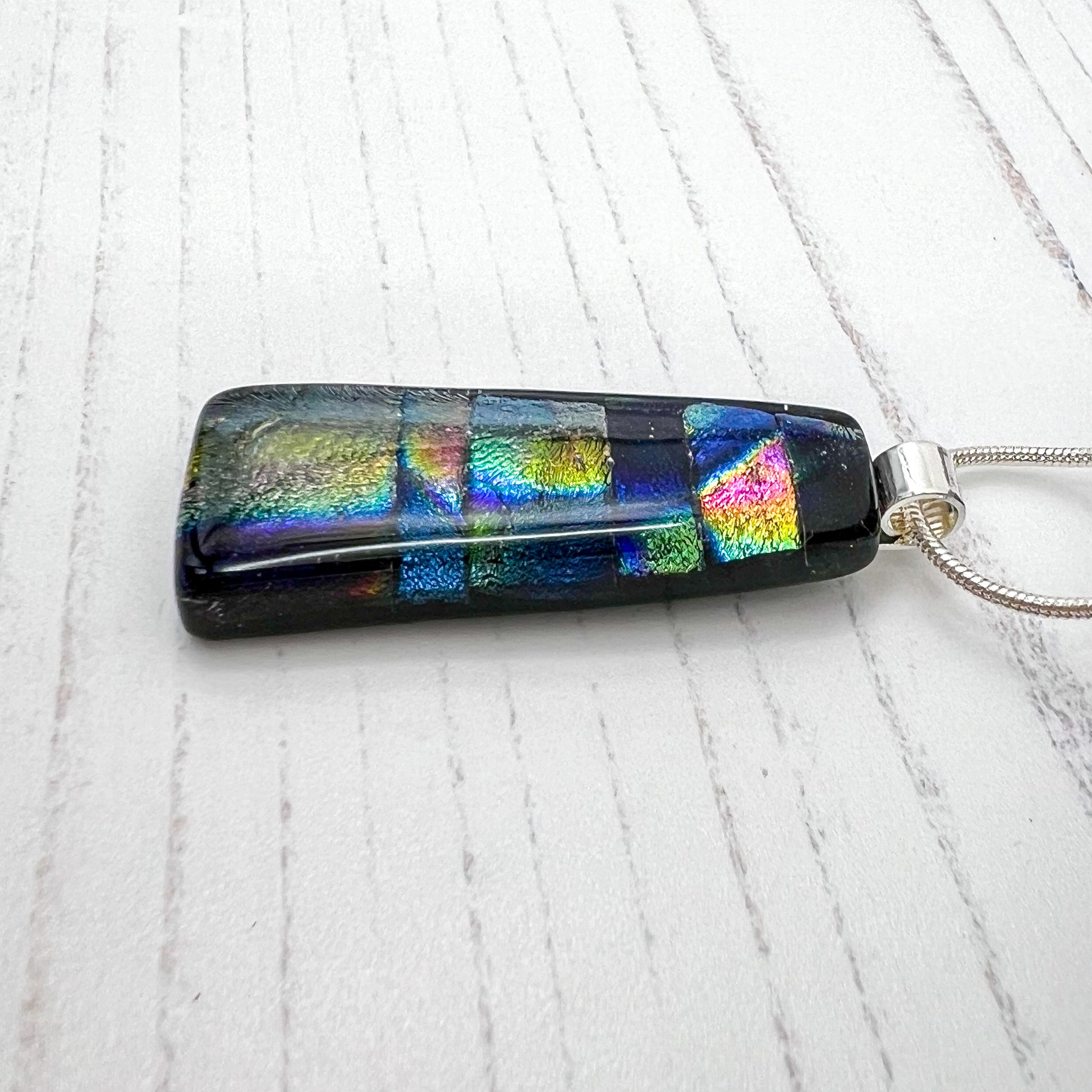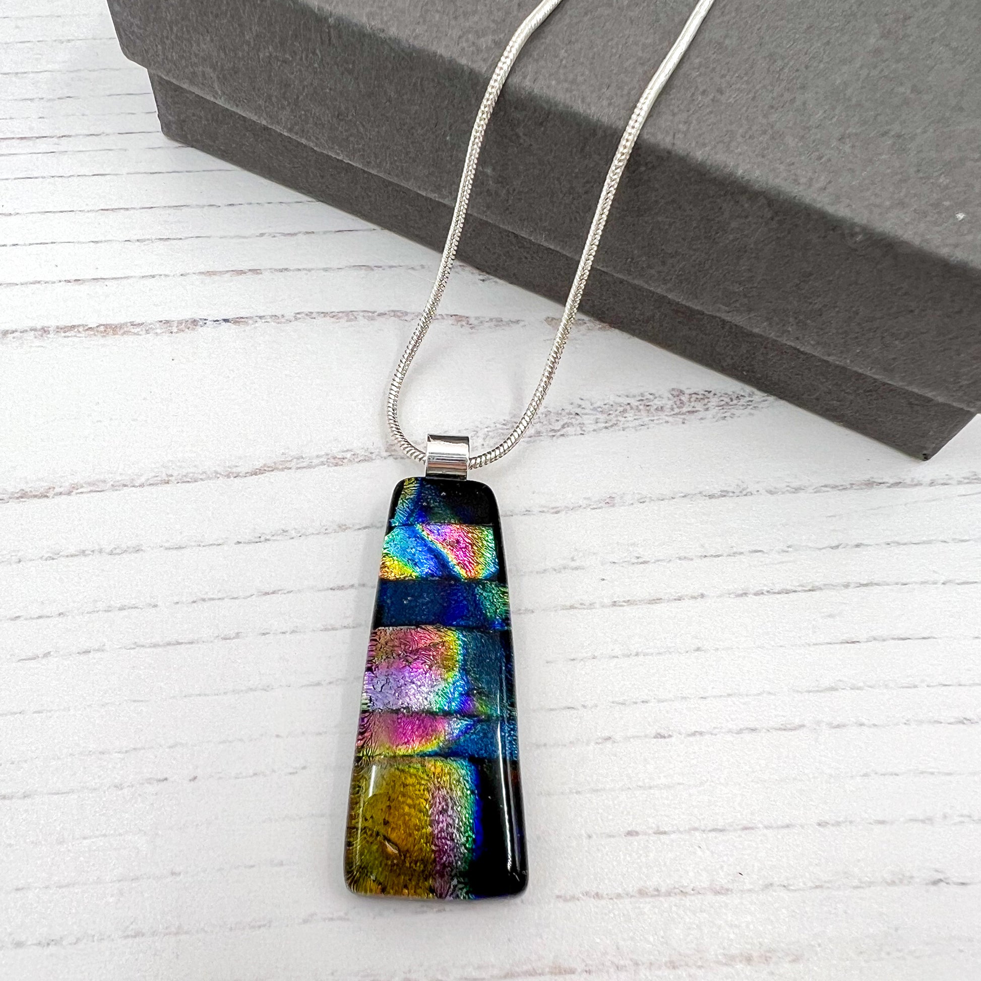 I made this necklace with an opaque black base and I layered over multicoloured dichroic glass over the top, then shaped it into a trapezium.