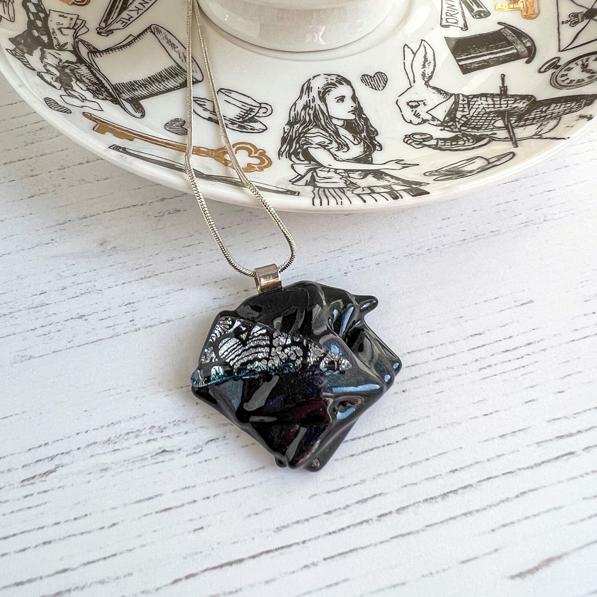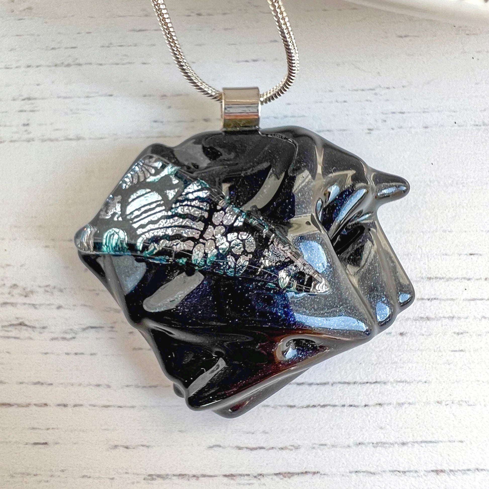 This navy abstract dichroic glass necklace is inspired by one of my favourite styles of creating necklaces.