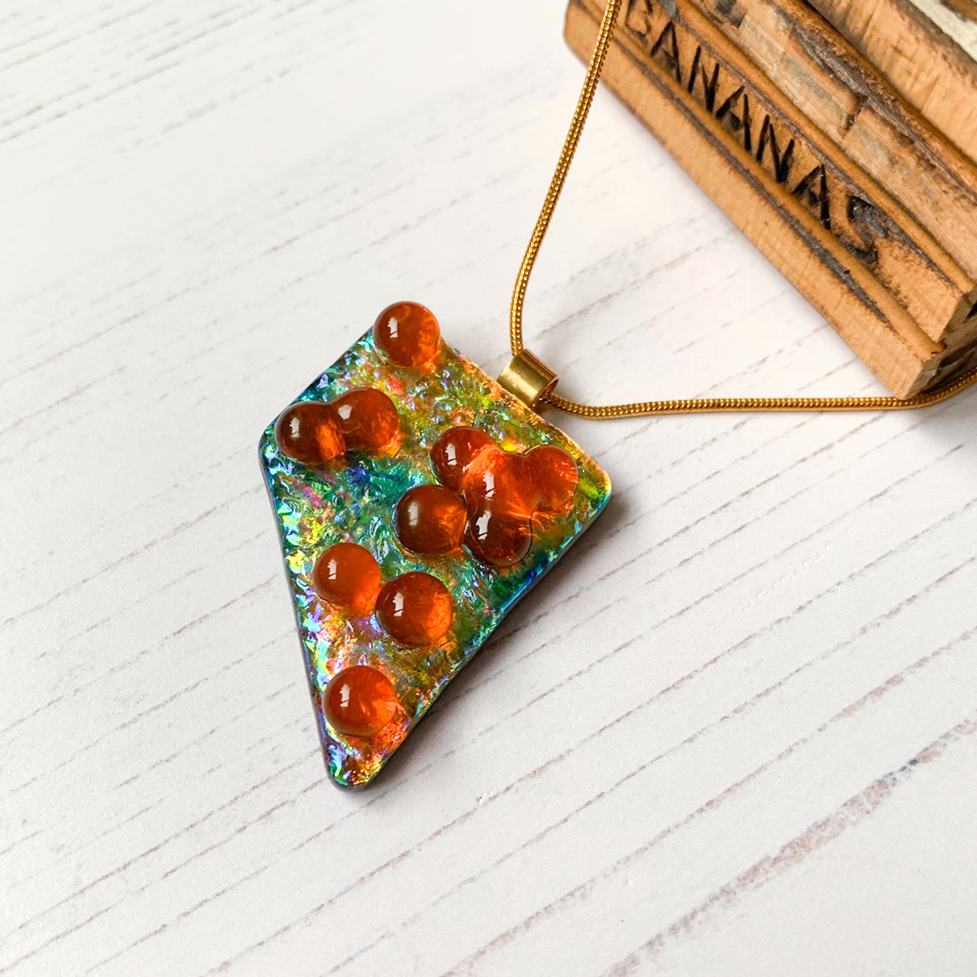 This orange bubble dichroic glass necklace is a handmade necklace with orange translucent droplets on a bed of orange, yellow, green textured dichroic glass.
