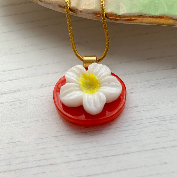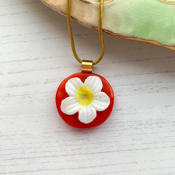 I made this necklace with a base of opaque red/orange glass, I then put a single white flower on the top.