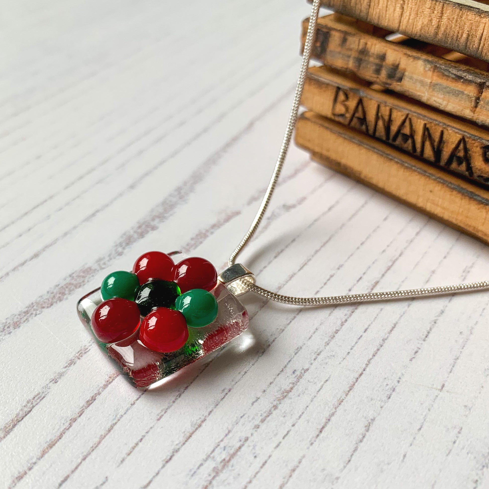 To make this necklace, I individually made glass droplets in winter colours, reds and green and placed them on a clear bed of glass.