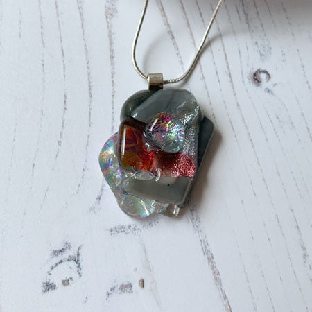 I made this necklace with greys and pinks. I added some rainbow and silver dichroic glass for a bit of sparkle.