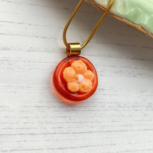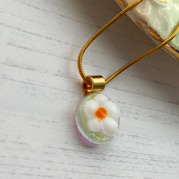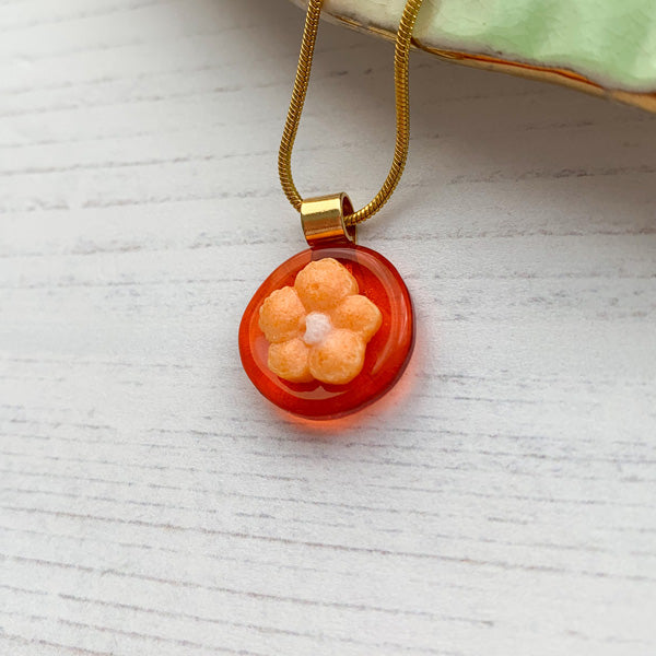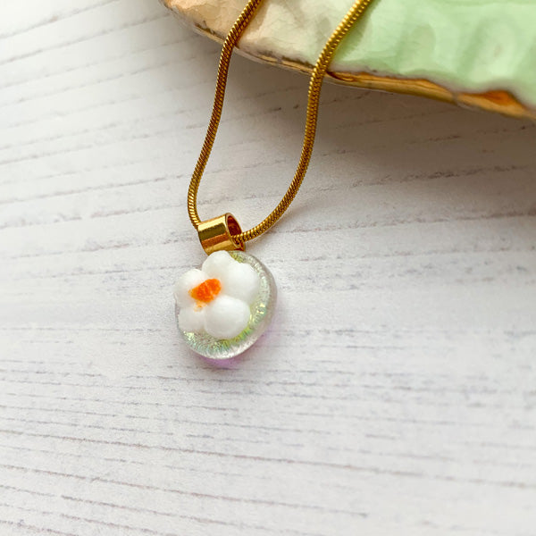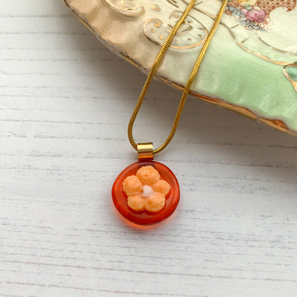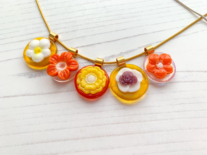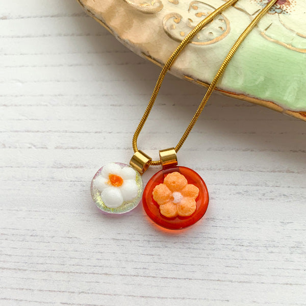 I made one of these necklaces with a base of translucent gold dichroic glass, I then put a single white flower on the top. I made the other one with a base of translucent orange glass, I then put a single light orange flower on the top.