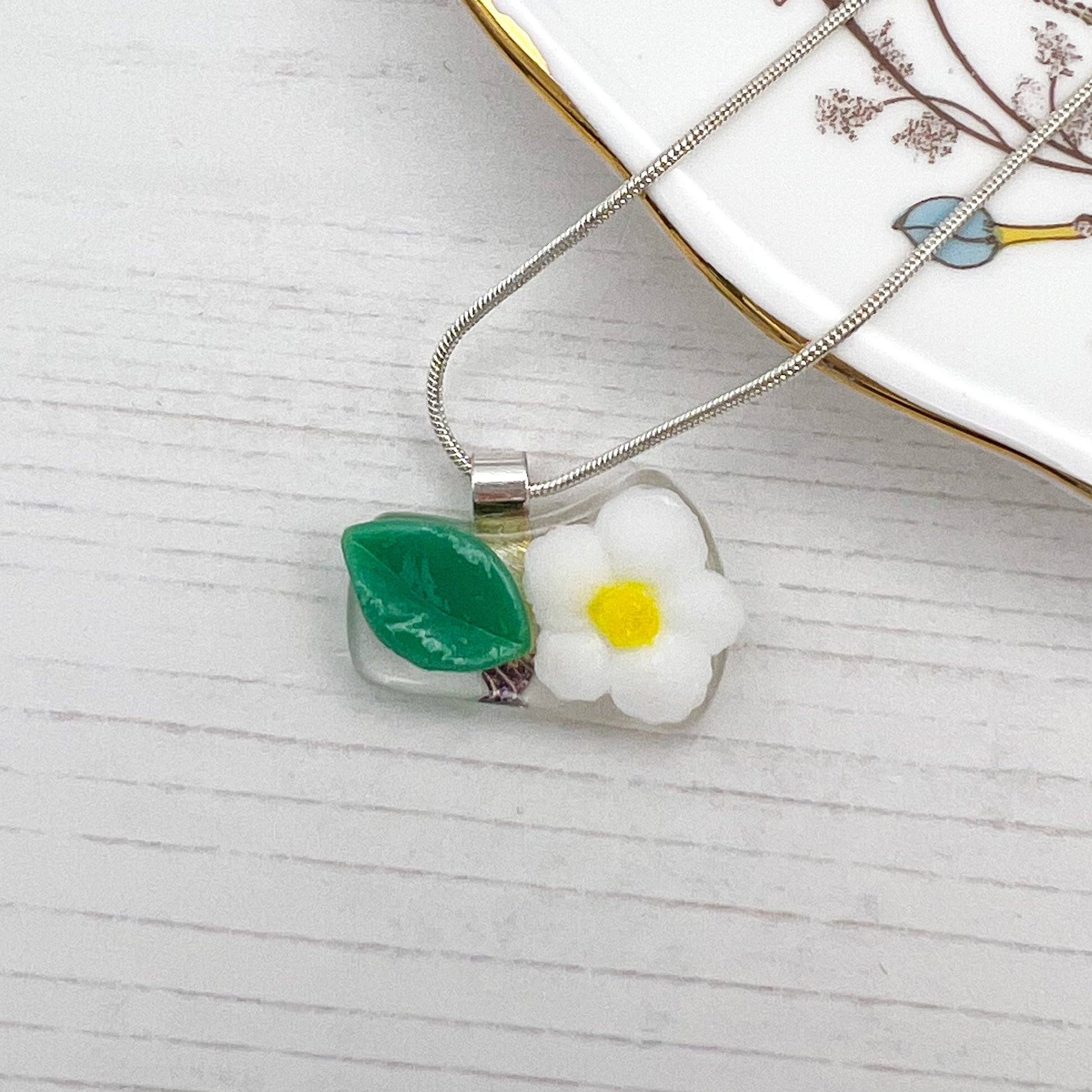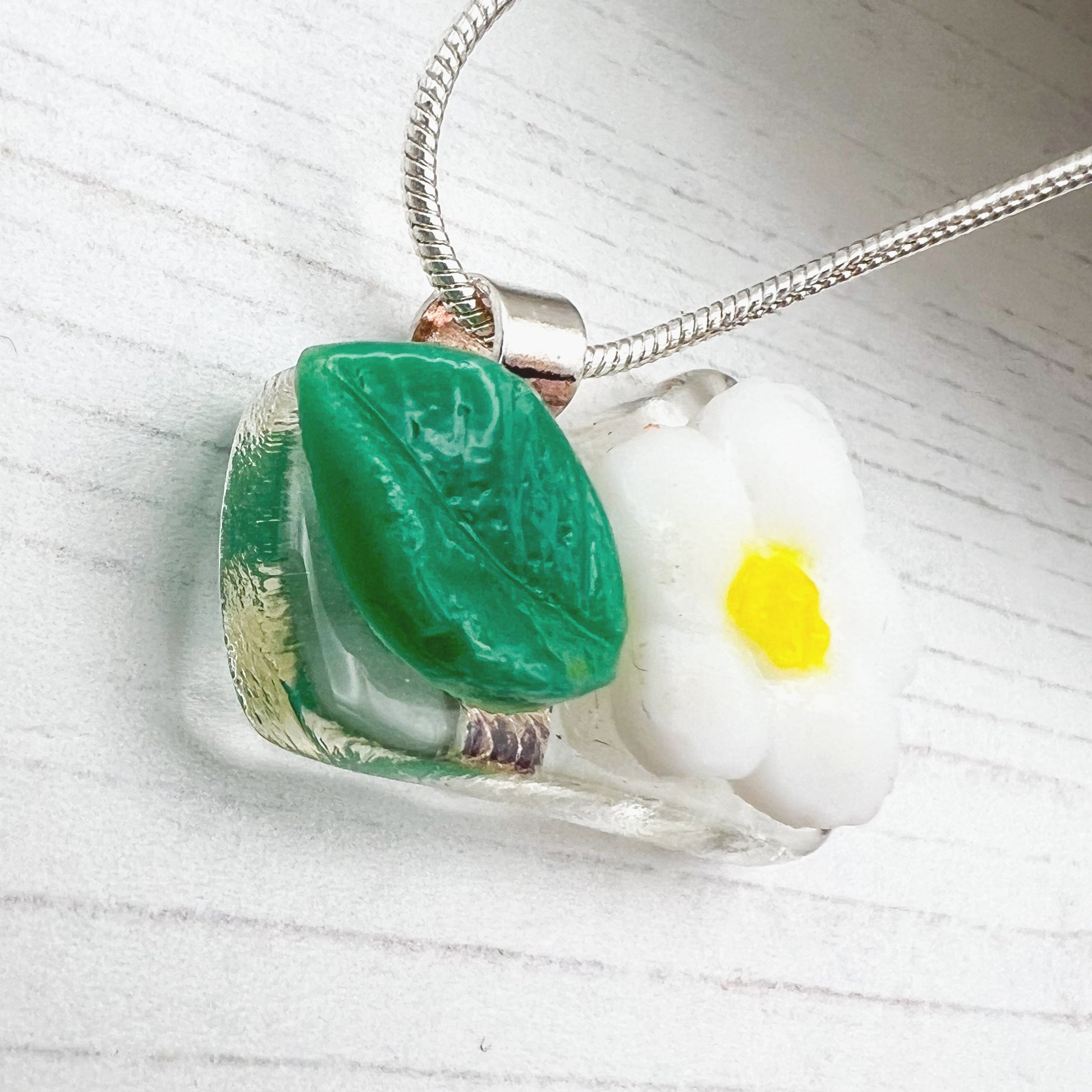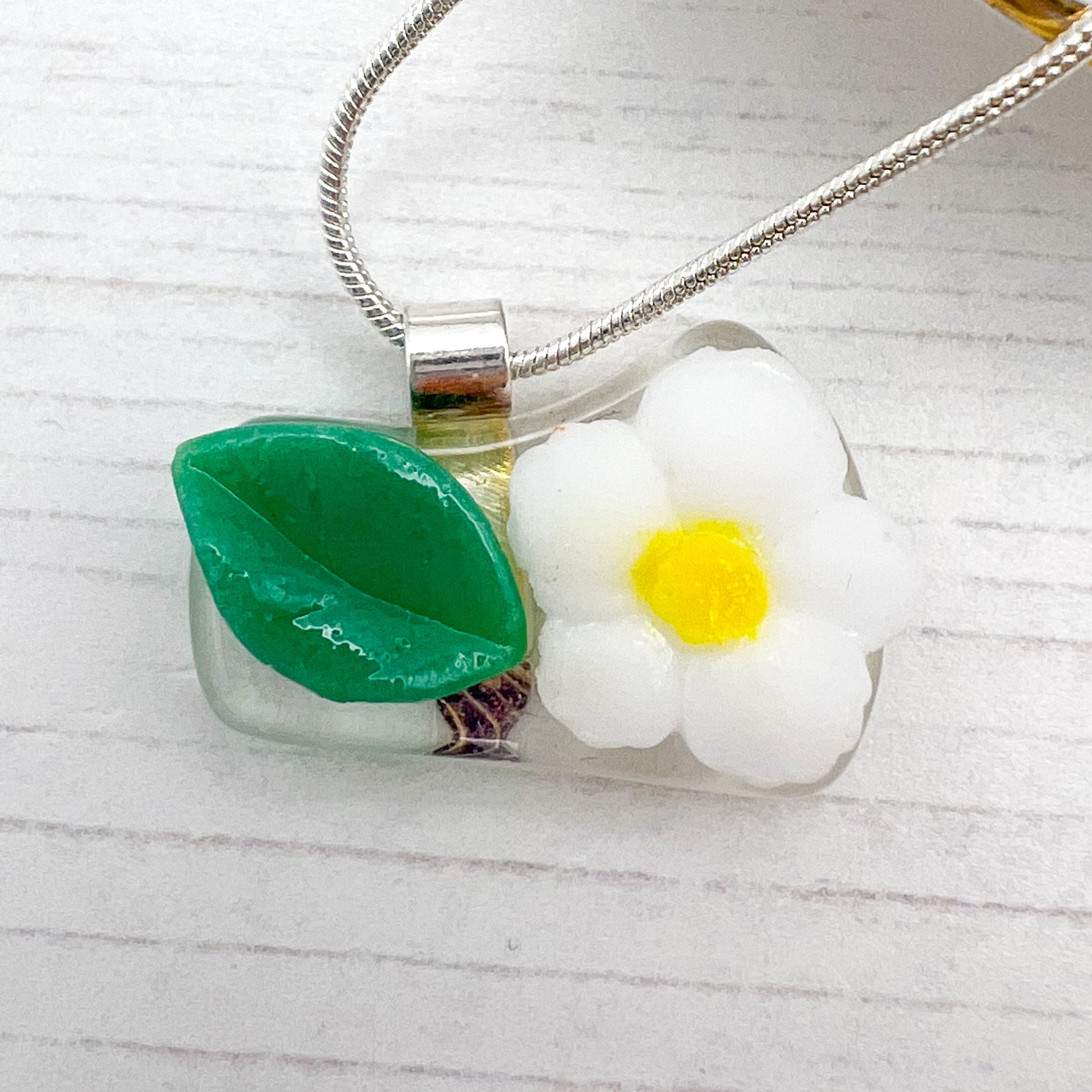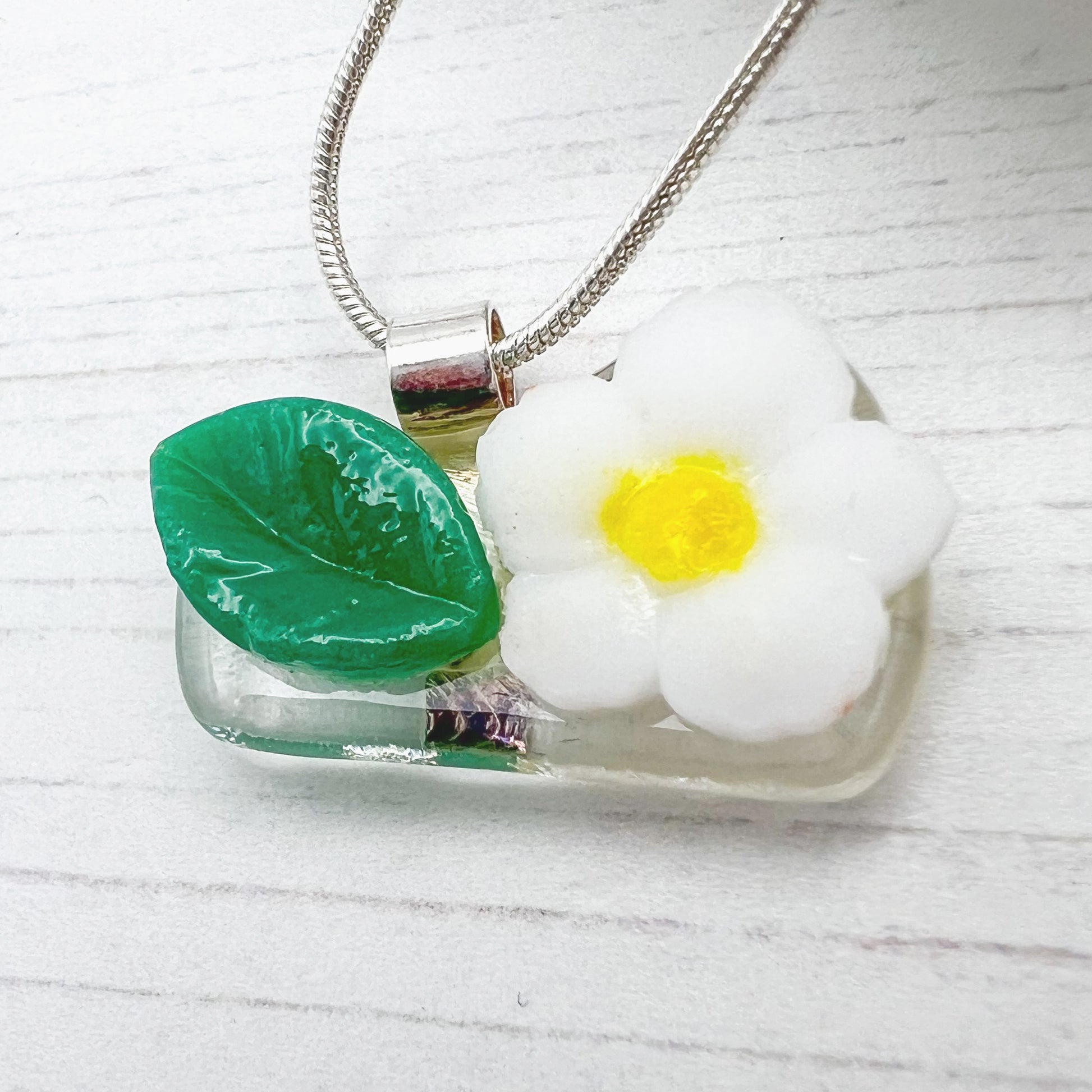 I made this necklace with a base of clear glass, I then put a white flower and green leaf on the top.