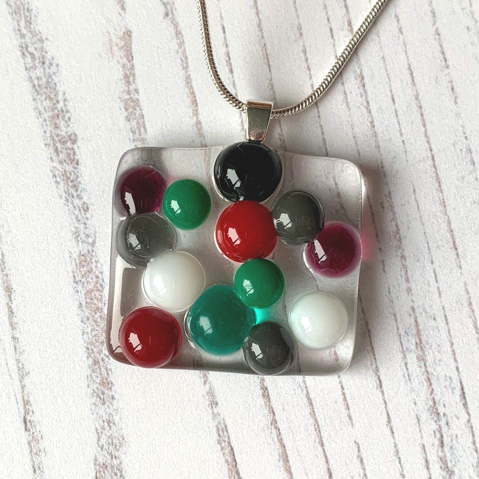 This winter bubble glass necklace is a handmade necklace with multicoloured droplets on a clear bed of glass.