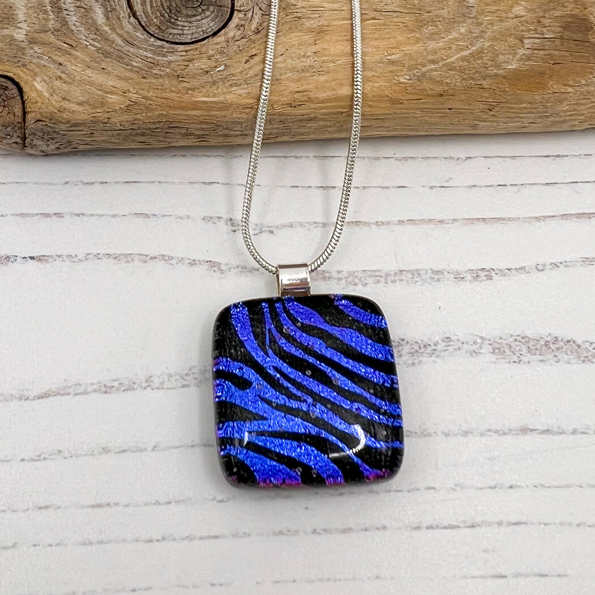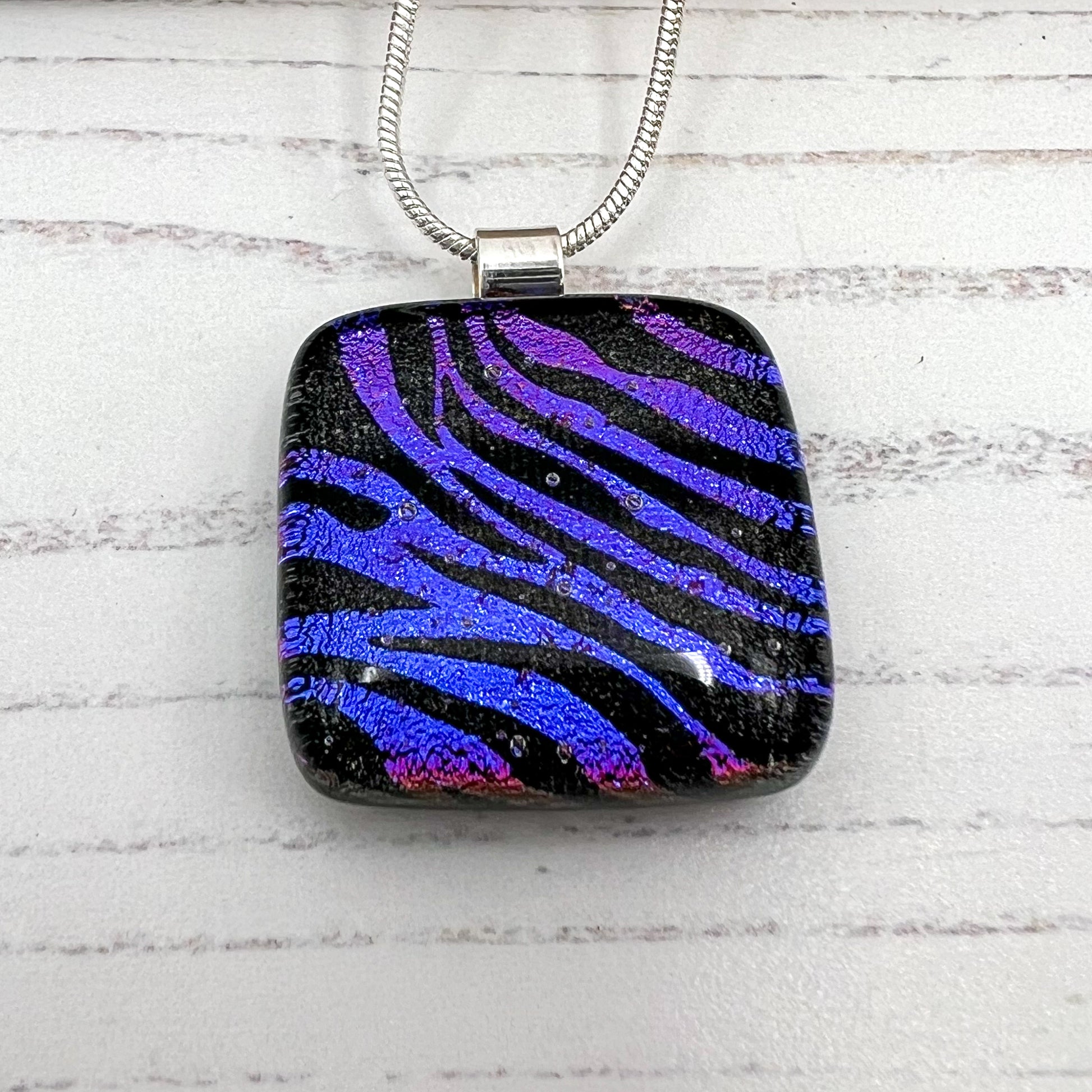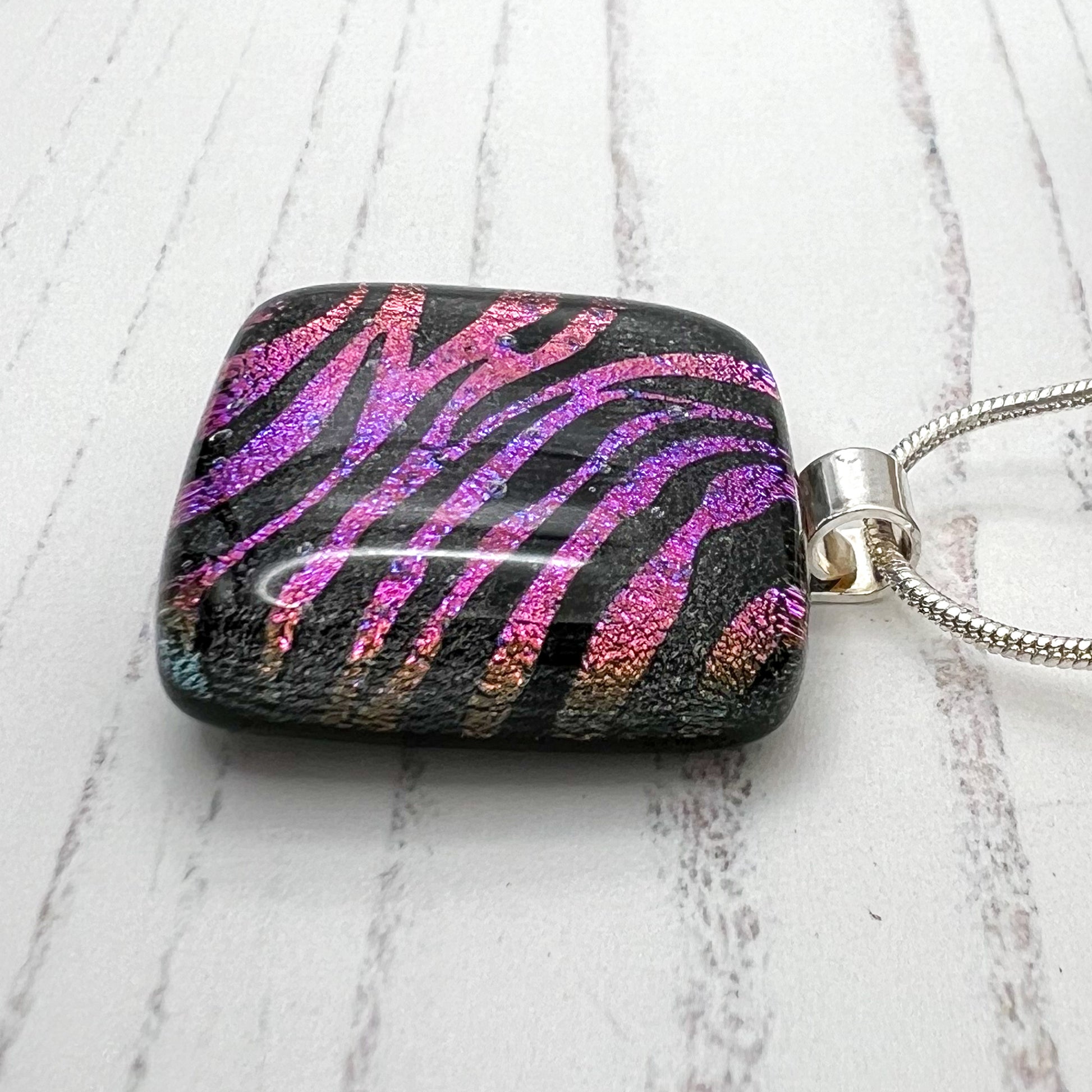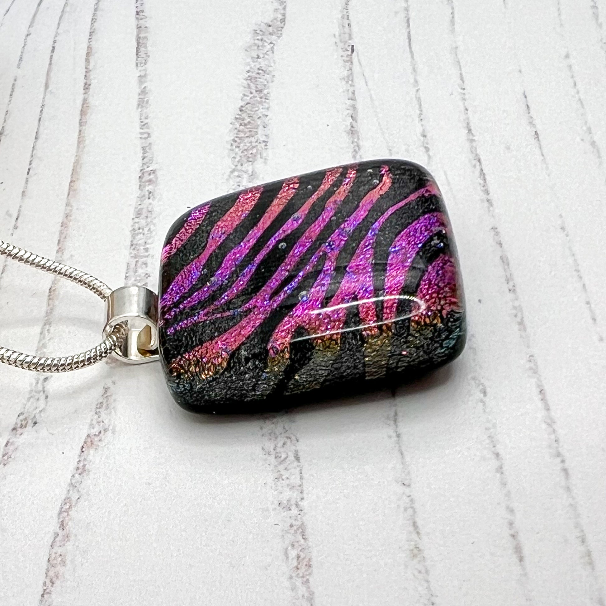 I made this necklace with a base of opaque glass and I then layered over the top a dichroic glass with a zebra pattern.